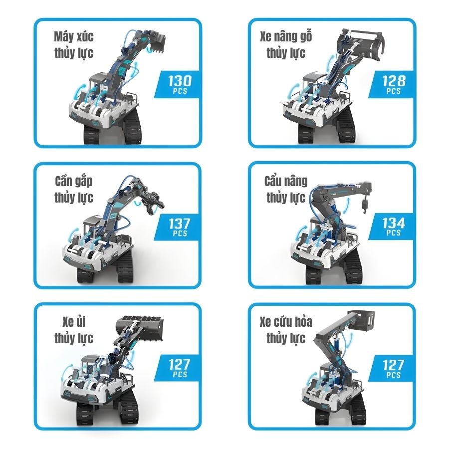 Lắp ráp 6 mô hình công trình khác nhau với cơ chế thủy lực hoạt động thực tế.