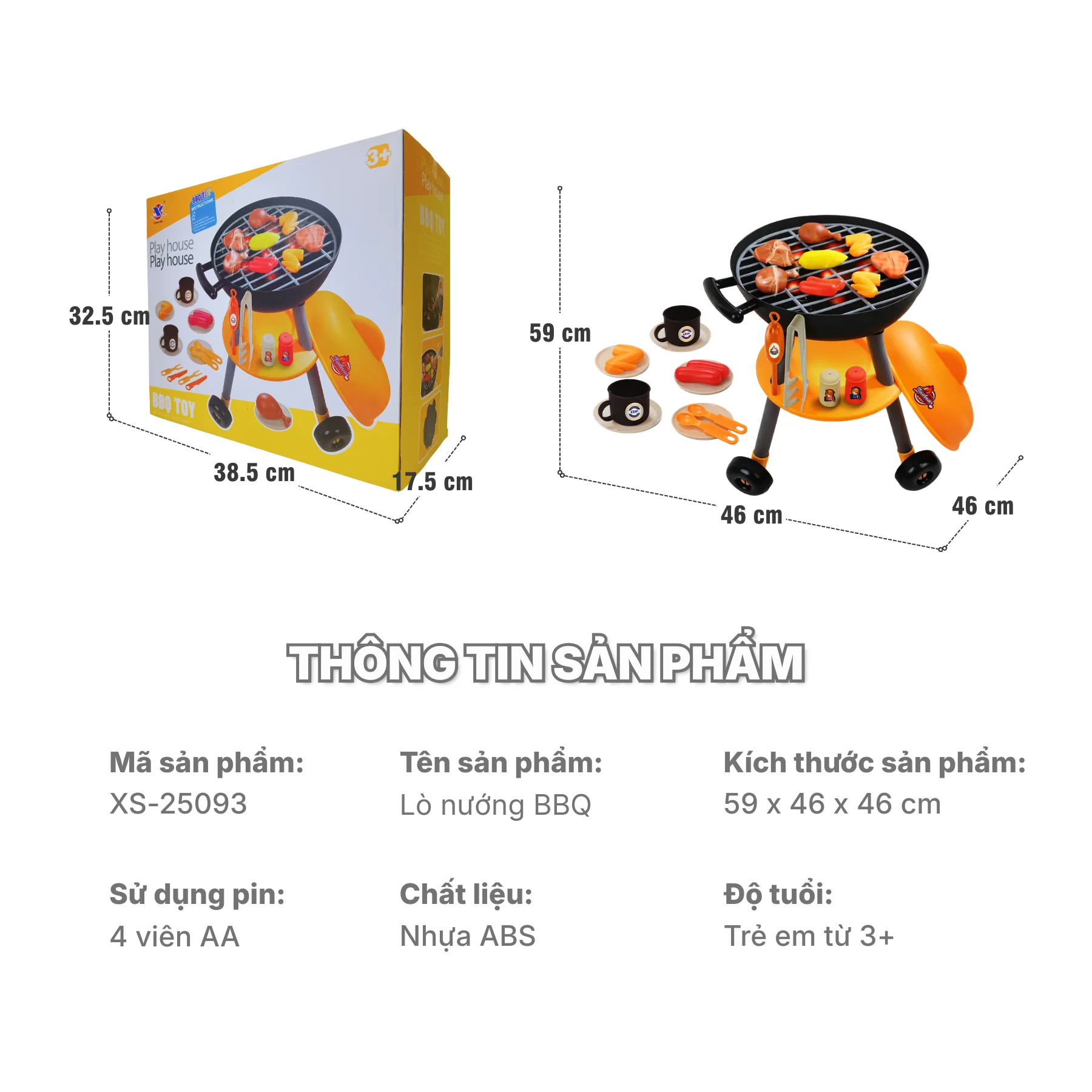 Lò nướng BBQ đồ chơi XS-25093 mang thiết kế mô phỏng sinh động giống bếp nướng ngoài trời thực tế, với tông màu vàng – đen nổi bật, kiểu dáng chắc chắn, phù hợp cho bé từ 3 tuổi trở lên trong các trò chơi nhập vai nấu ăn, dã ngoại và tiệc BBQ gia đình.