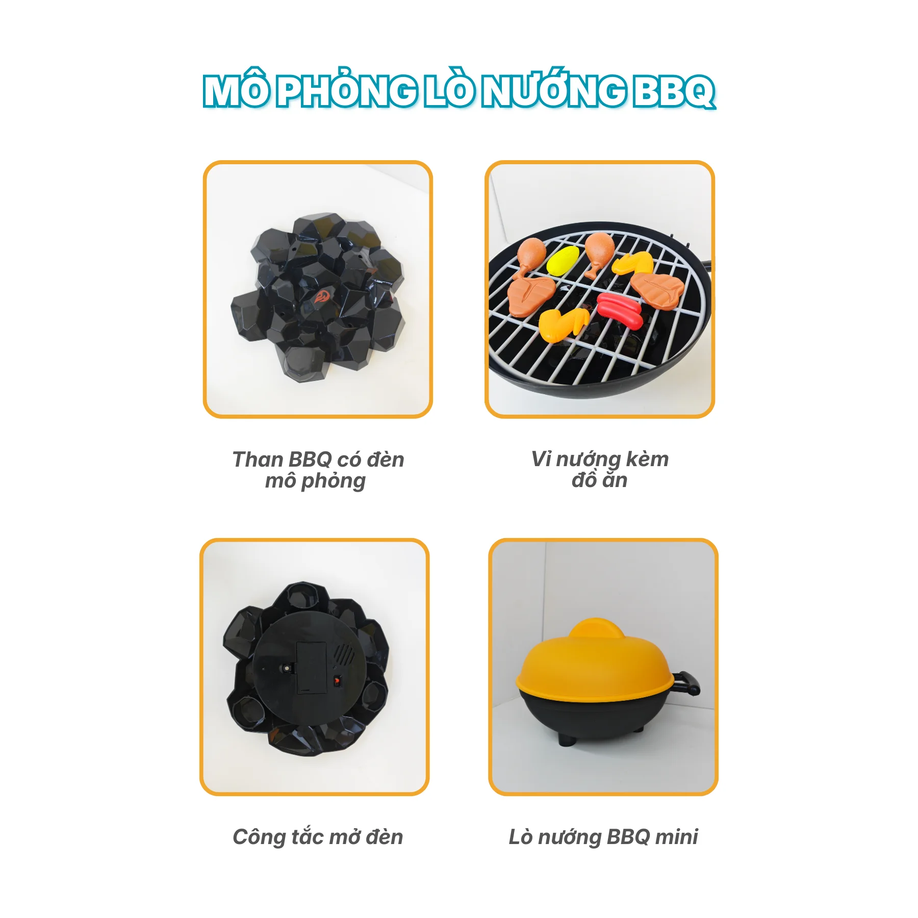 Bên trong bếp là bộ than BBQ mô phỏng có đèn, khi bật công tắc sẽ tạo hiệu ứng phát sáng sinh động, tăng cảm giác như đang nướng thật. Nắp bếp có thể đóng mở linh hoạt, giúp bé thực hành thao tác nấu nướng, lật đồ ăn và kiểm tra món nướng một cách tự nhiên.
