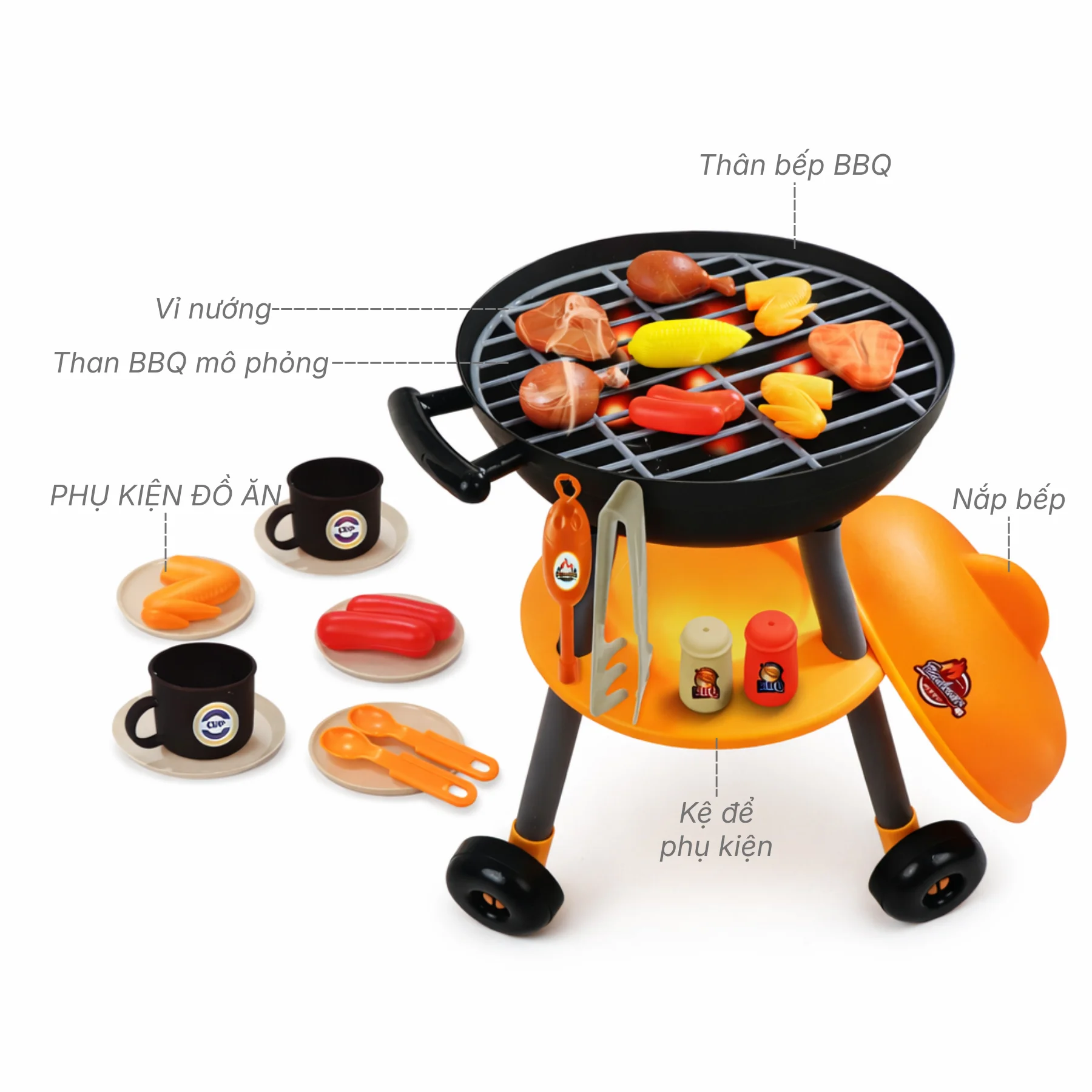 Bộ sản phẩm đi kèm đầy đủ phụ kiện như vỉ nướng, kẹp gắp, thìa, đĩa, cốc, gia vị và nhiều loại thực phẩm mô phỏng, giúp bé hoàn thiện trải nghiệm BBQ, đồng thời phát triển trí tưởng tượng, kỹ năng vận động tinh và khả năng phối hợp tay – mắt khi chơi.