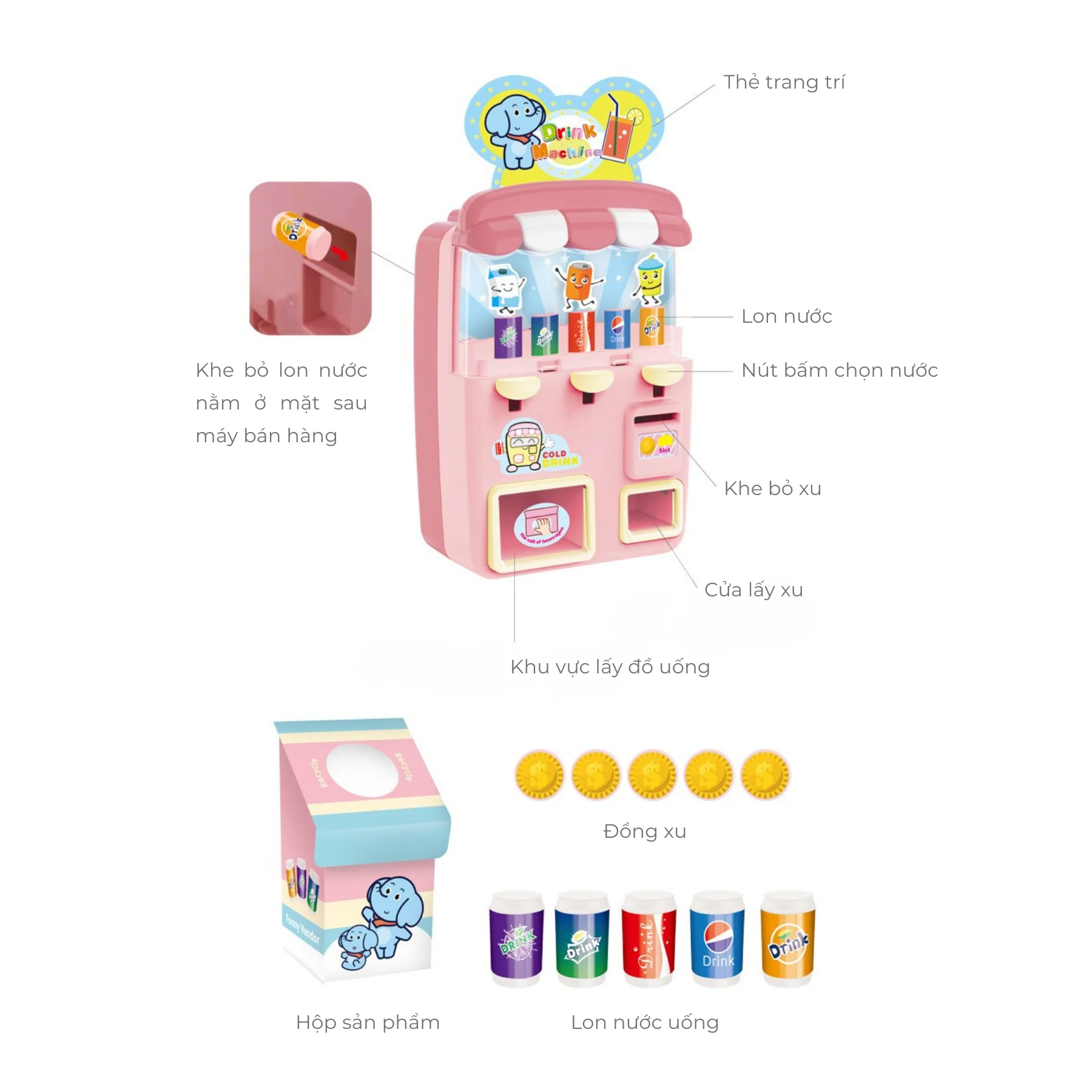 • Hoạt động cơ học thông minh – bé chỉ cần thả xu và chọn nút đồ uống, lon nước sẽ tự rơi xuống khay nhận hàng.