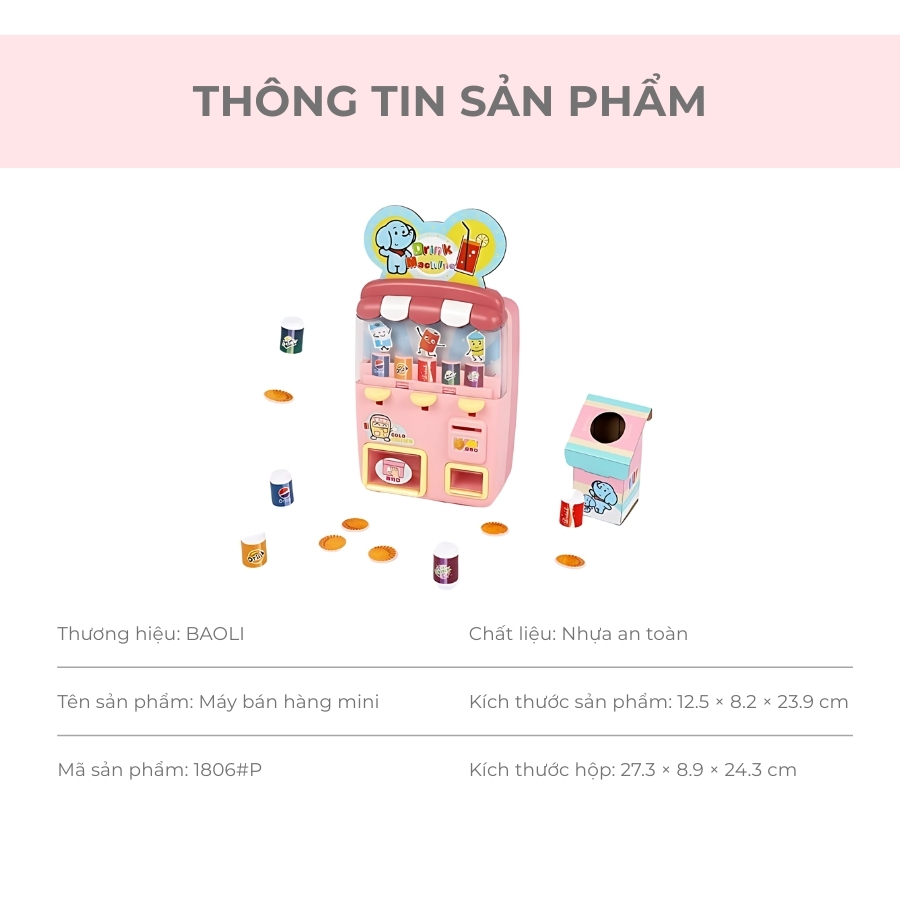 Đồ chơi máy bán hàng mini BAOLI màu xanh dương 1806#P / 1806#B là món đồ chơi nhập vai thú vị giúp bé hóa thân thành “người bán hàng tí hon”. Thiết kế ngộ nghĩnh, màu pastel nhẹ nhàng cùng hình chú voi đáng yêu khiến bé thích mê ngay từ ánh nhìn đầu tiên. Bé sẽ được thực hành các thao tác nạp hàng – bỏ xu – chọn nước – nhận sản phẩm như một chiếc máy bán hàng thật, vừa học vừa chơi cực vui.