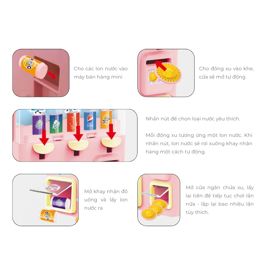 - Hoạt động cơ học thông minh – bé chỉ cần thả xu và chọn nút đồ uống, lon nước sẽ tự rơi xuống khay nhận hàng.