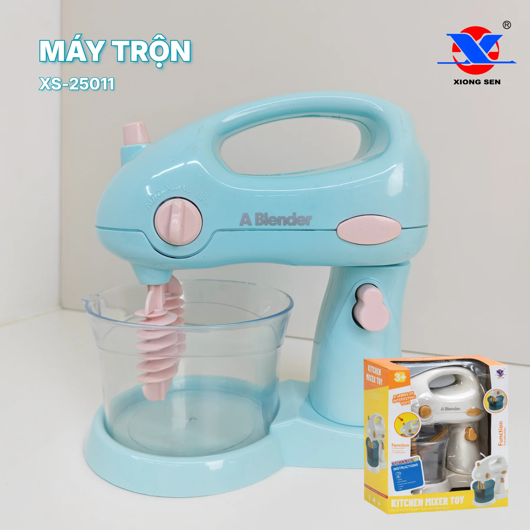Bộ đồ chơi Máy Trộn Nhà Bếp XS-25011 mang thiết kế mô phỏng máy trộn cầm tay quen thuộc trong gian bếp gia đình, màu sắc pastel nhẹ nhàng, kiểu dáng gọn gàng, phù hợp cho trẻ nhỏ yêu thích trò chơi nhập vai nấu ăn và khám phá thế giới sinh hoạt hằng ngày.