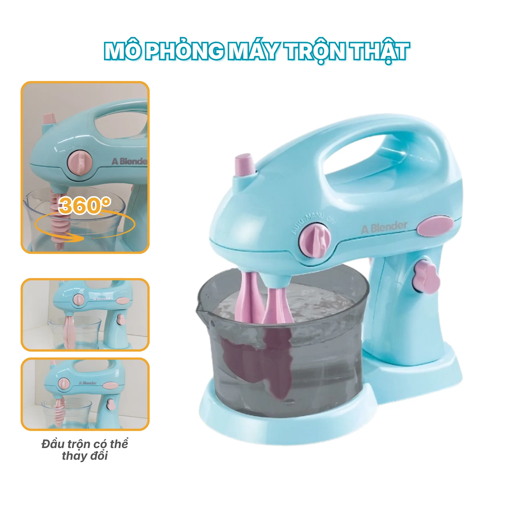Máy được trang bị nhiều nút chức năng cơ bản như nút bật/tắt, nút trộn, núm xoay chế độ AUTO – MANU – OFF, giúp bé làm quen với thao tác điều khiển đơn giản và rèn luyện khả năng phối hợp tay – mắt. Đầu trộn có thể tháo rời, thuận tiện cho việc thay đổi và cất giữ sau khi chơi.