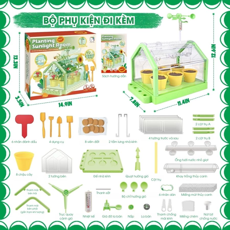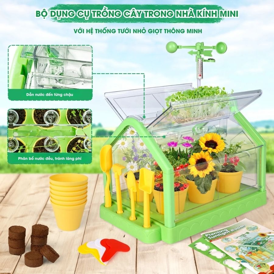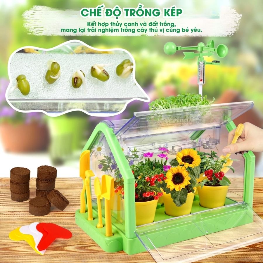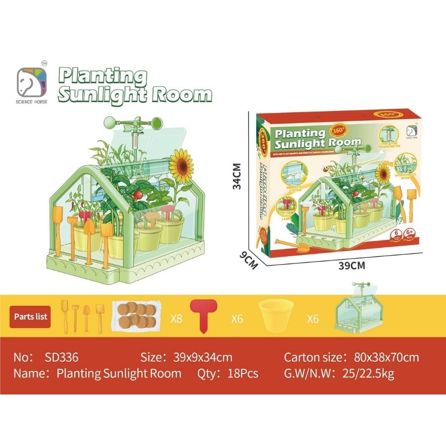 Đồ chơi phòng trồng cây ánh nắng SCIENCE HORSE SD336 giúp bé tự tay gieo hạt, chăm sóc và quan sát sự phát triển của cây xanh. Sản phẩm tích hợp nhiệt kế, hệ thống tưới và trạm gió mô phỏng môi trường sống thực tế, là công cụ giáo dục STEM lý tưởng cho trẻ từ 6 tuổi.