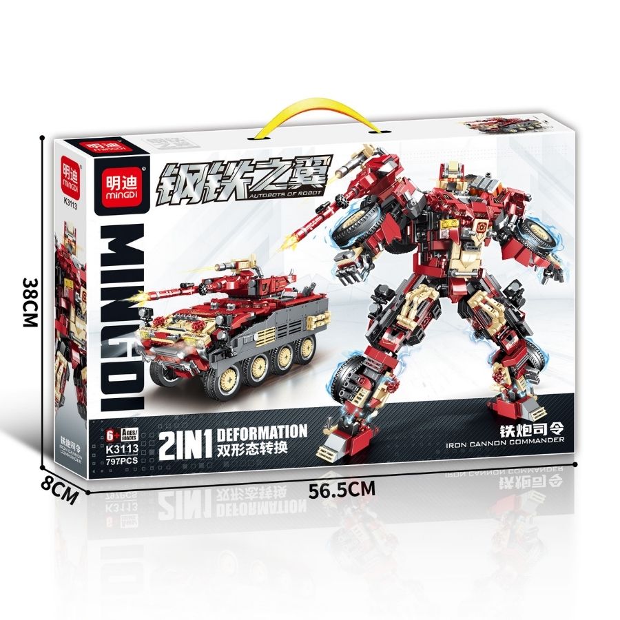 Đồ chơi robot chỉ huy pháo thép MINGDI K3113 – 797 chi tiết, lắp ghép mô hình 2 trong 1 từ xe chiến đấu thành robot khổng lồ gần 30cm, cho bé trai 8+.
