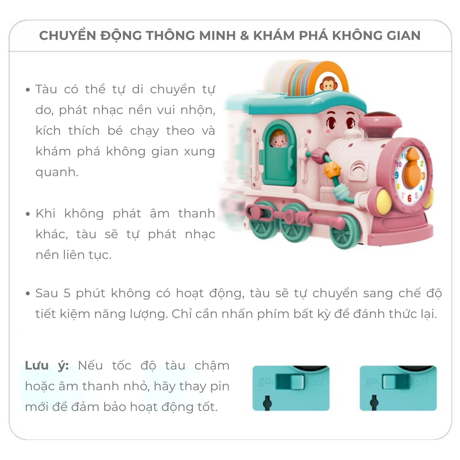 Kích thích vận động khi bé chạy theo tàu hỏa di chuyển tự do và đổi hướng thông minh.