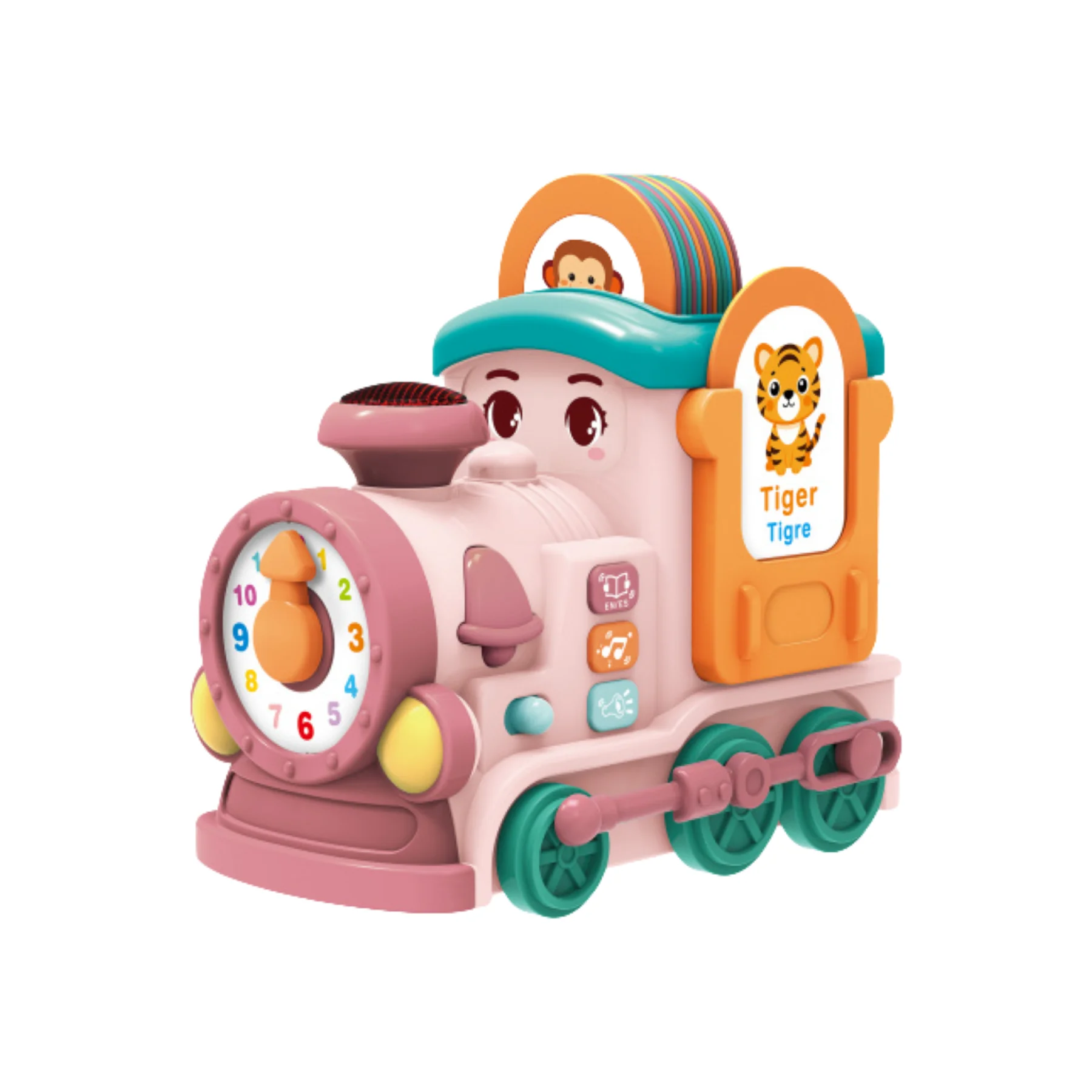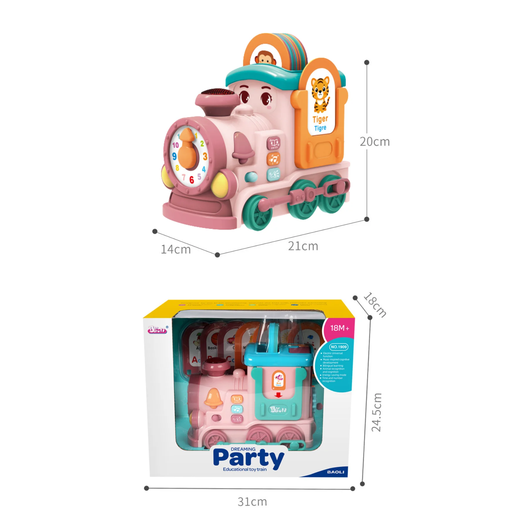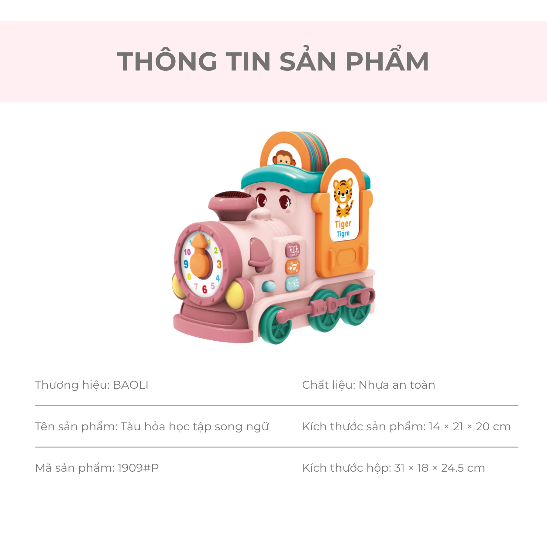 Tàu hỏa học tập đa năng màu hồng BAOLI 1909#P là món đồ chơi trẻ em giáo dục đa chức năng dành cho bé từ 18 tháng, tích hợp 28 bài hát, 14 thẻ học 2 mặt và nhiều hoạt động tương tác giúp bé phát triển ngôn ngữ, tư duy và vận động tinh. Sản phẩm phát tiếng Anh – Tây Ban Nha, có chế độ âm nhạc, chuyển hướng thông minh và đèn chiếu sáng an toàn.