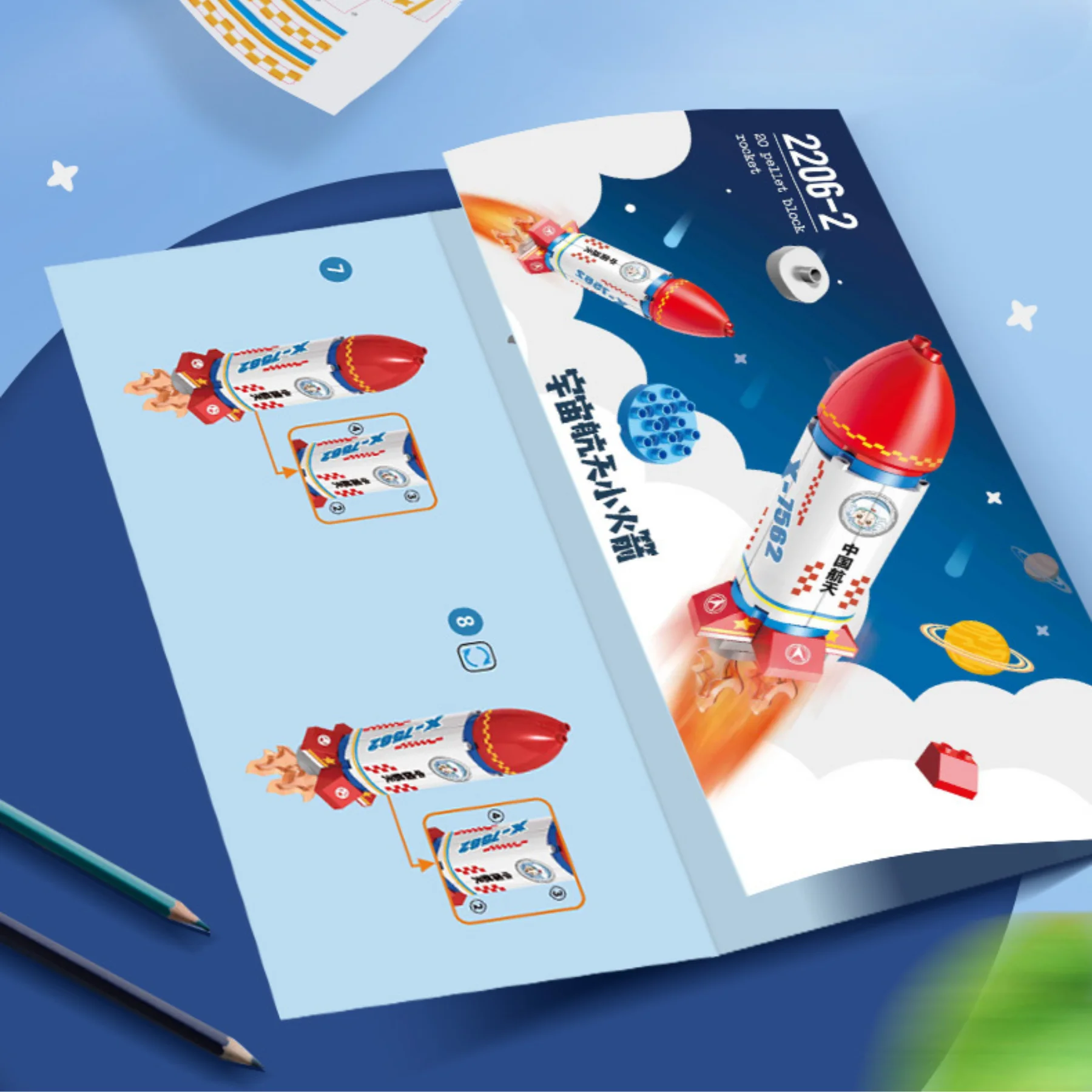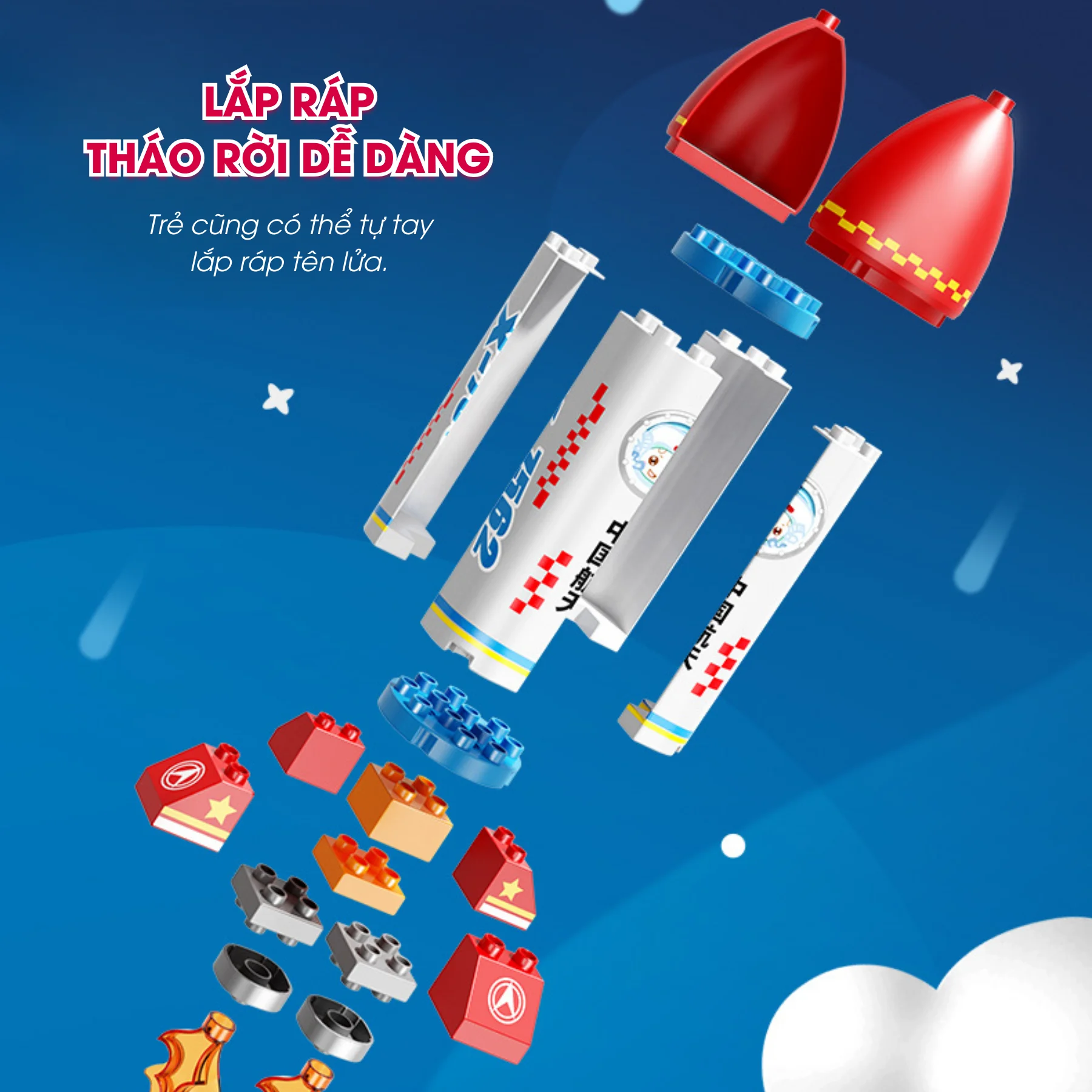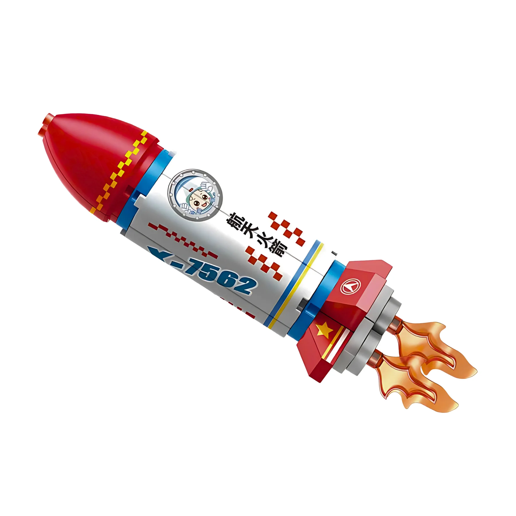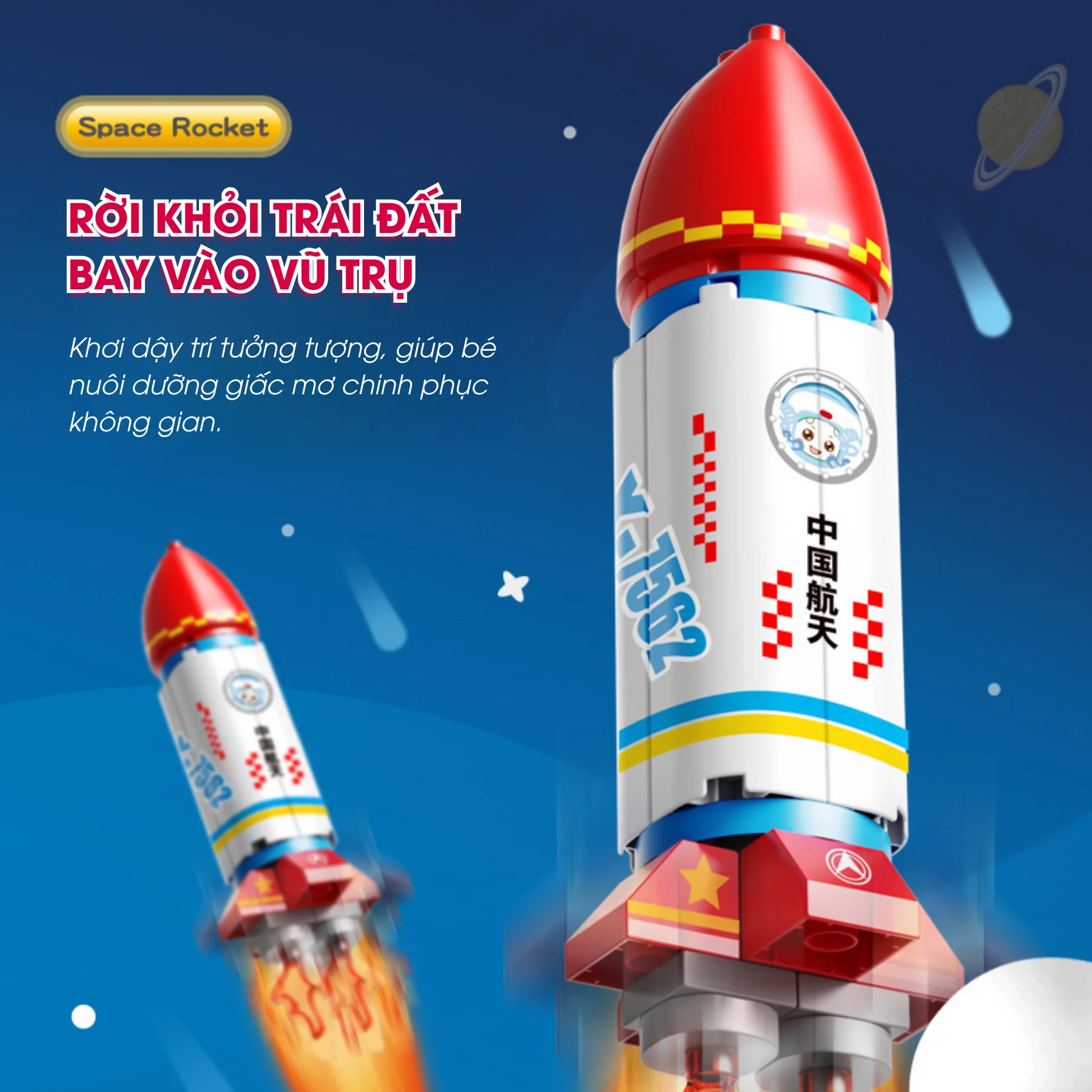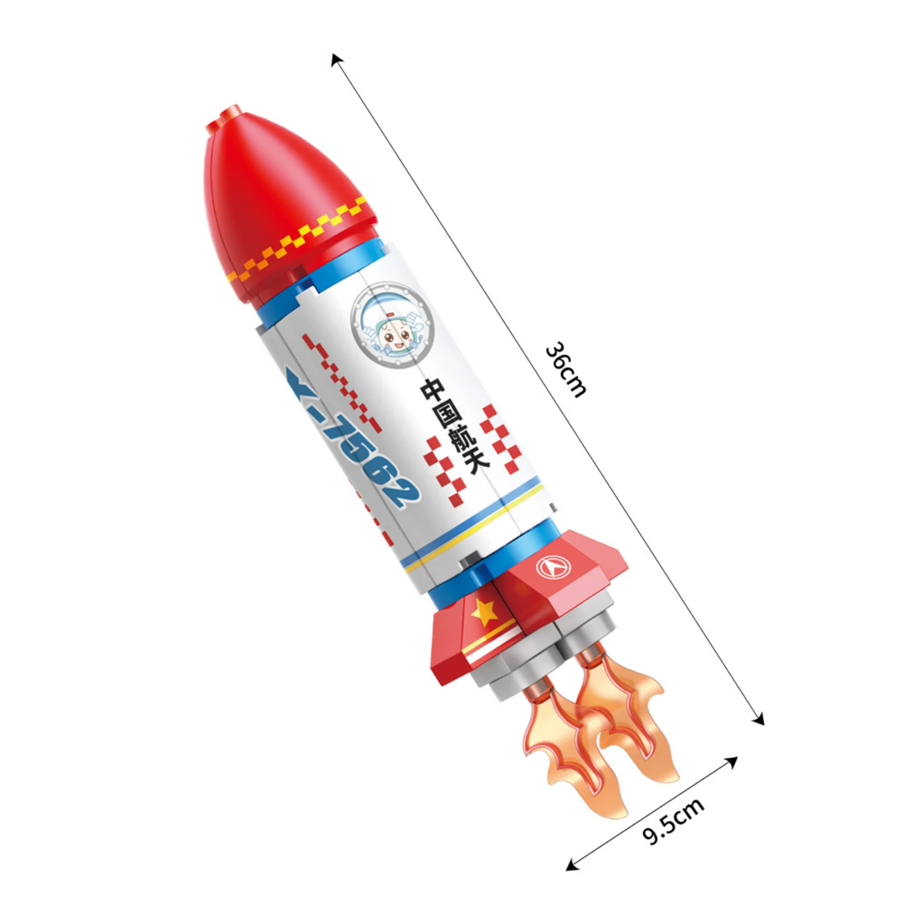 Mô phỏng tên lửa vũ trụ chân thực với đầu chóp đỏ, thân trắng xanh in hình phi hành gia.