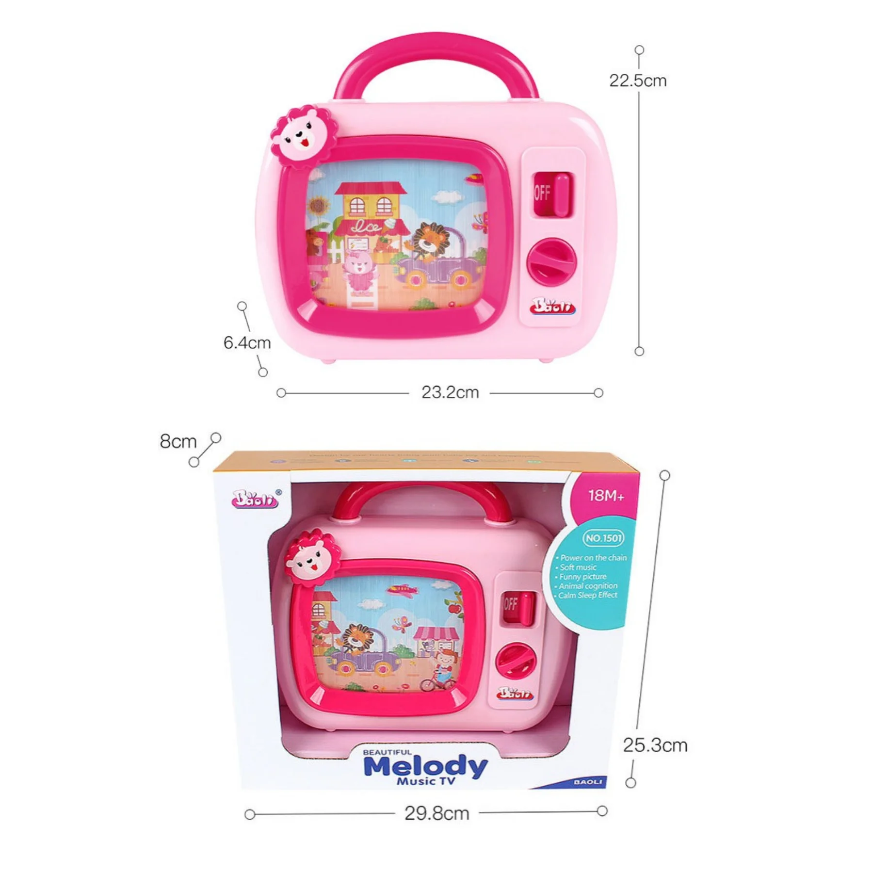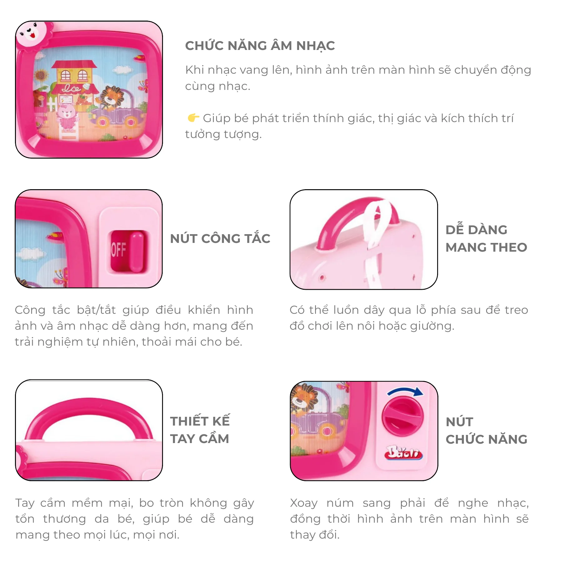- Nút bật/tắt và công tắc hoạt động như TV thật, giúp bé cảm nhận tính tương tác thực tế.