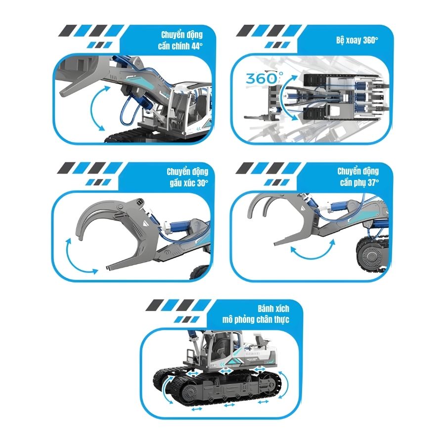 Tích hợp 3 piston thủy lực điều khiển tay cần, gầu xúc, thân máy xoay 360°.