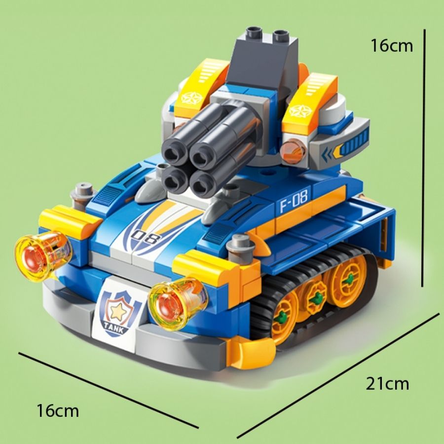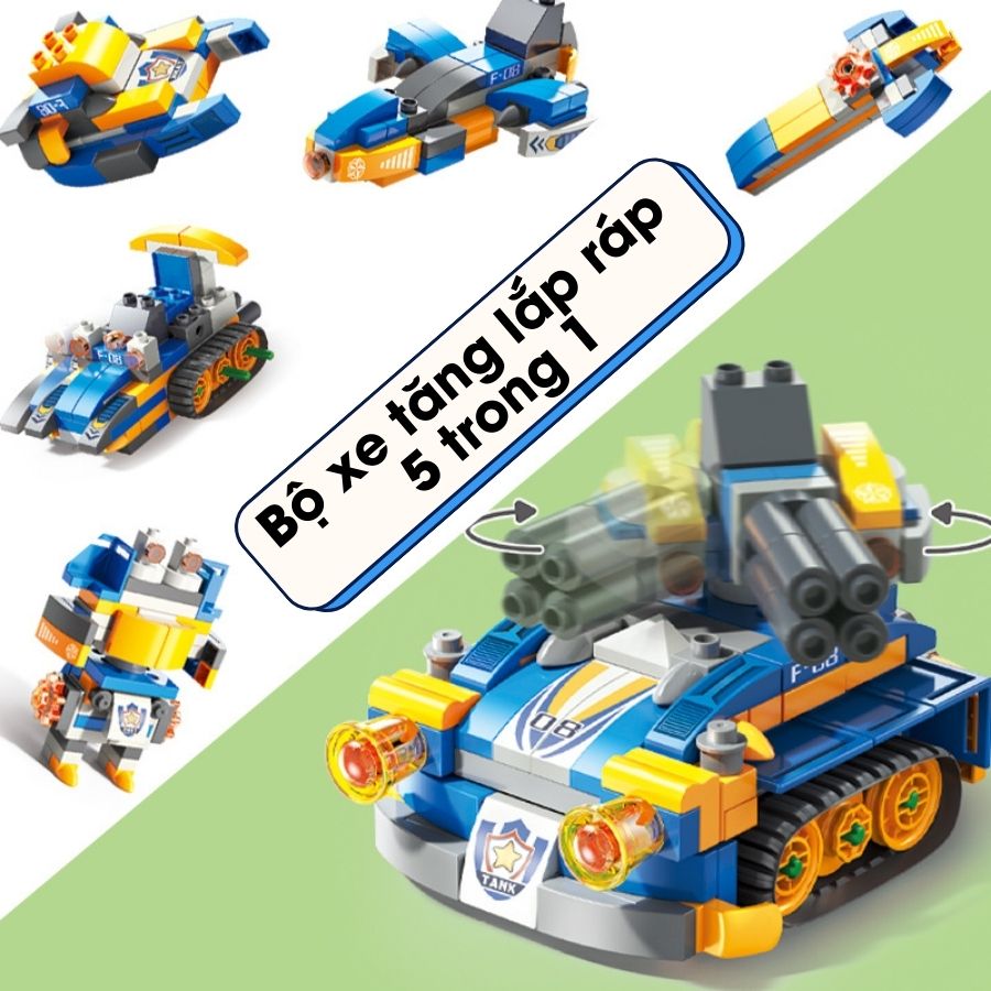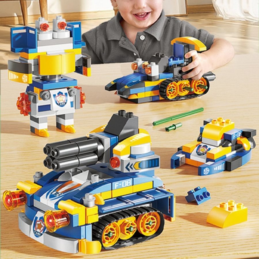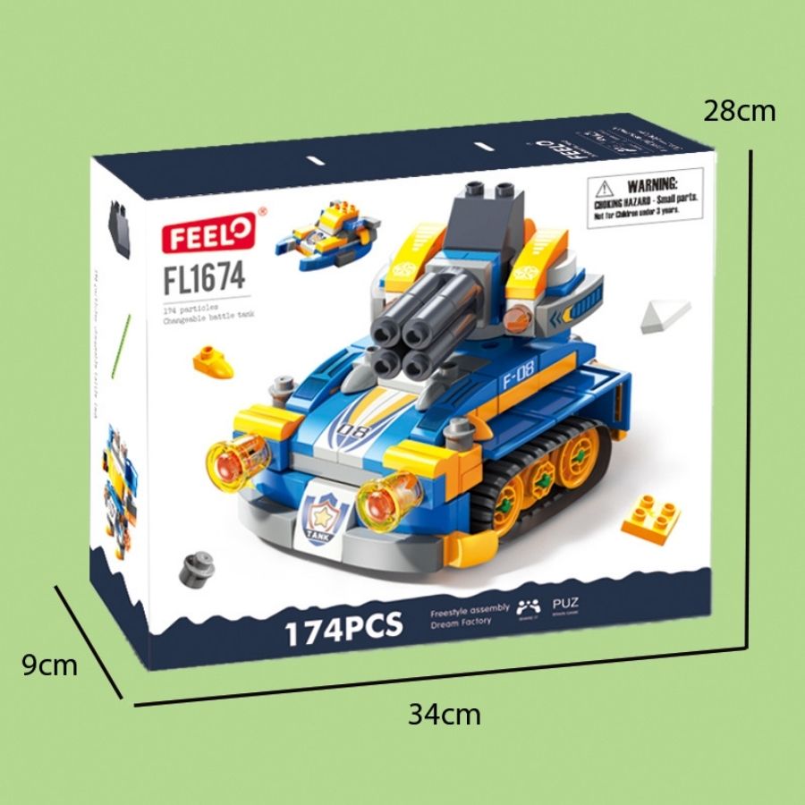 Đồ chơi xe tăng biến hình FEELO FL1674 gồm 174 chi tiết nhựa kỹ thuật cao cấp, cho bé lắp ráp thành nhiều mô hình khác nhau như xe tăng, robot hay tổ hợp 5 trong 1. Thiết kế xoay pháo 360°, xích di chuyển chân thực, giúp bé vừa chơi vừa học cơ khí.