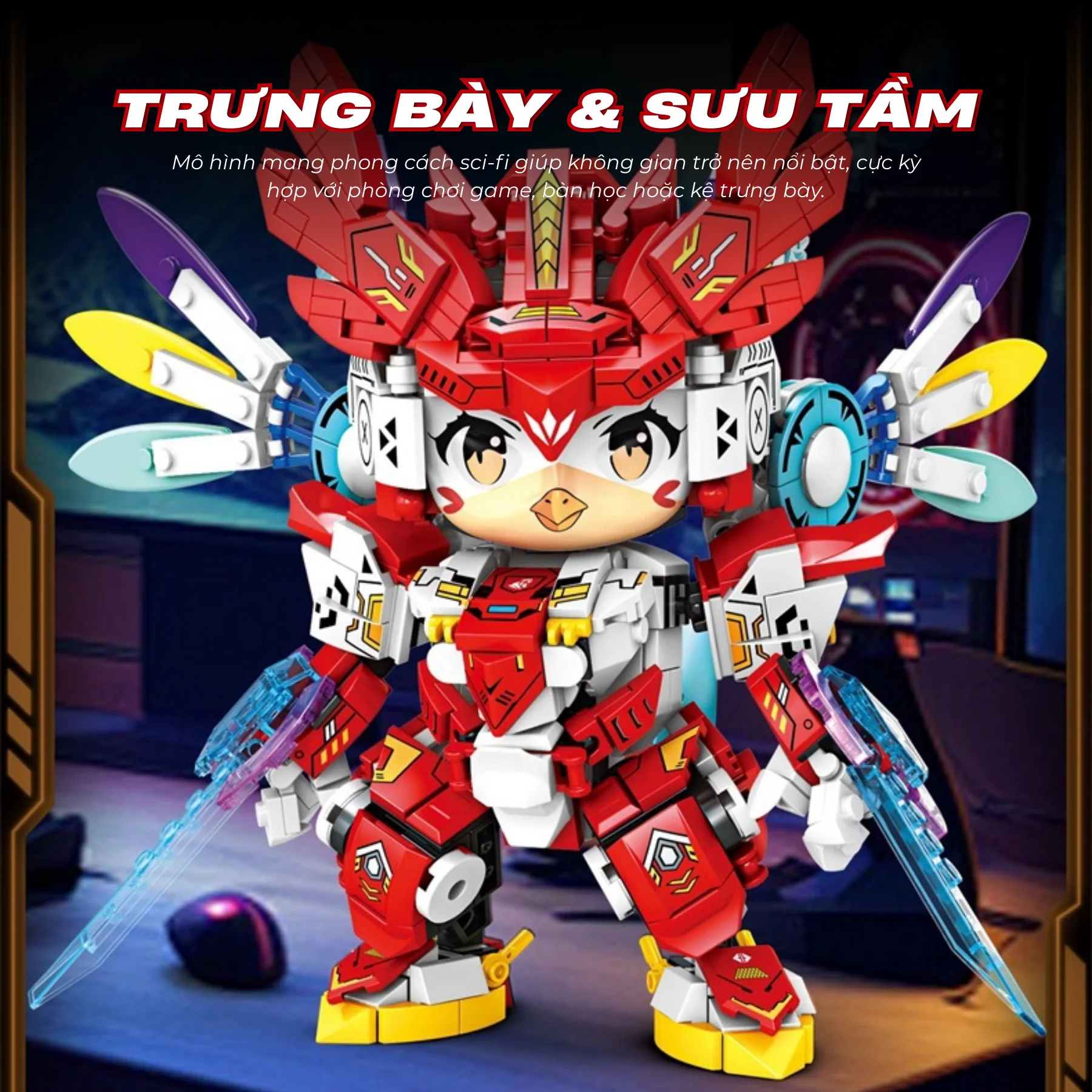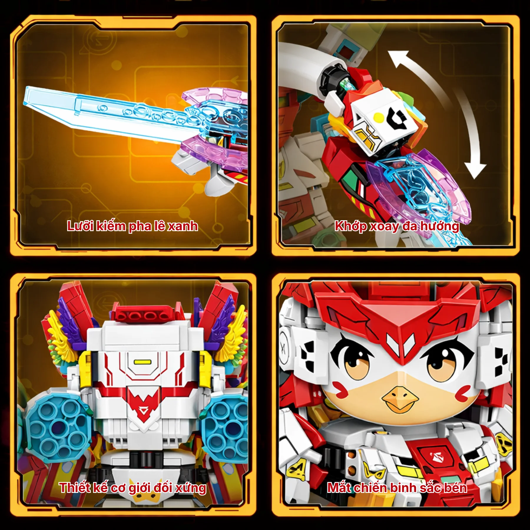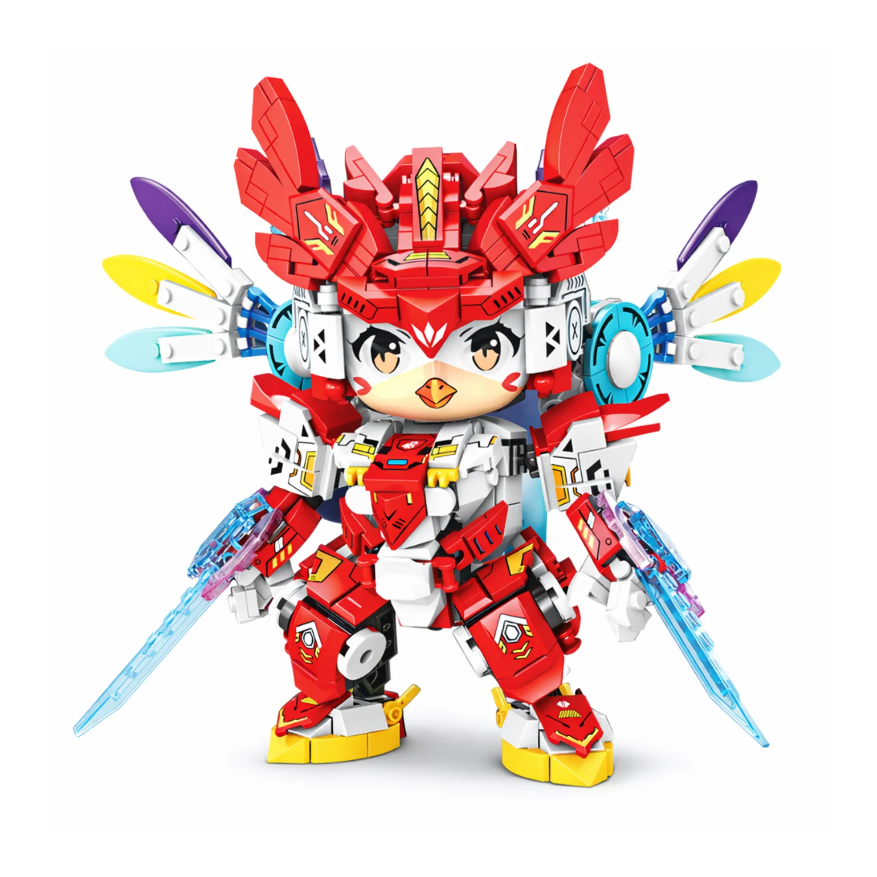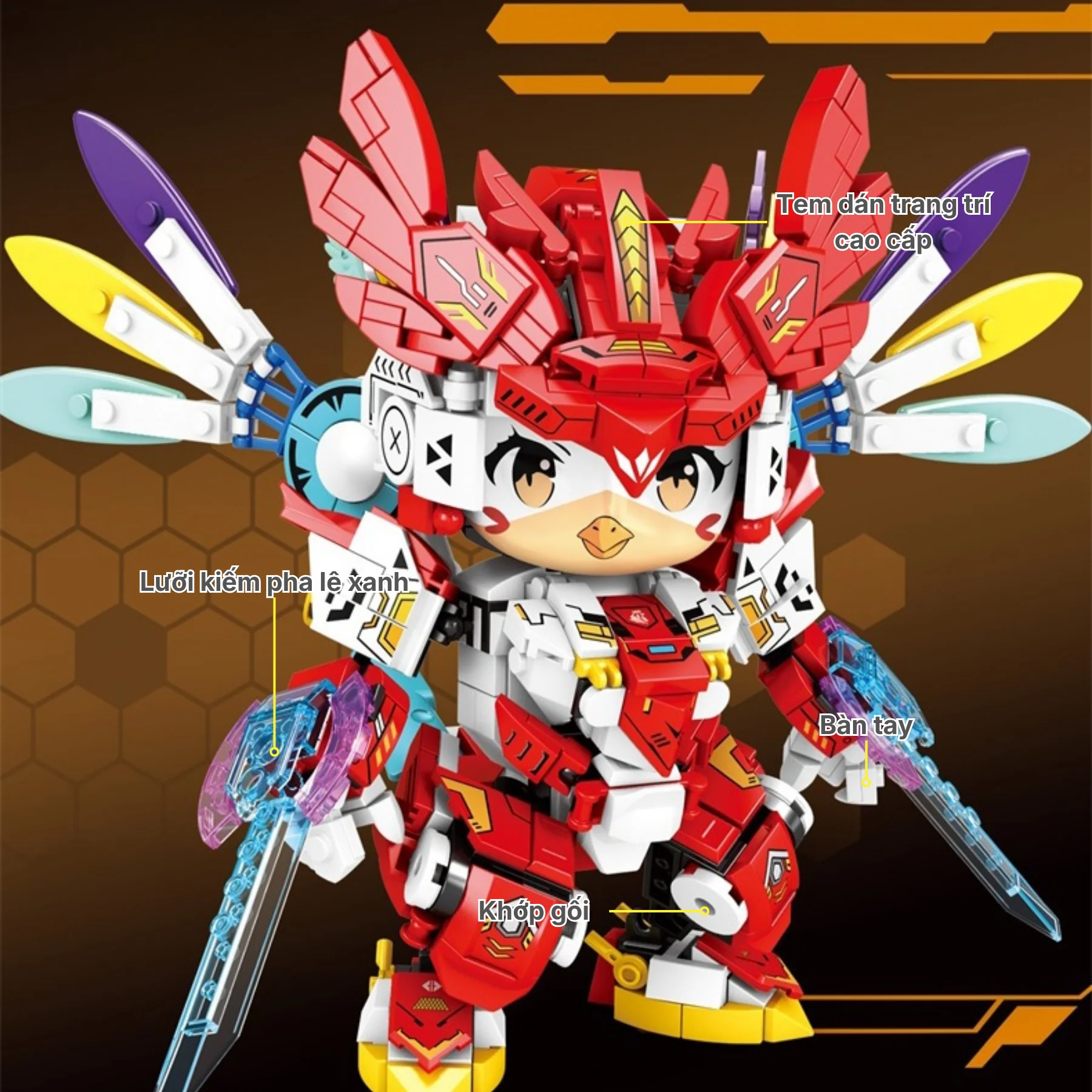 Thiết kế nổi bật với bộ giáp đỏ rực mang phong cách chiến binh công nghệ, đôi cánh nhiều màu đặc trưng cùng mũ giáp họa tiết văn hóa Á Đông. Hai vũ khí năng lượng có thể tháo lắp, khớp tay chân linh hoạt giúp bé tạo nhiều tư thế chiến đấu khác nhau sau khi hoàn thiện. Hệ thống sticker và họa tiết in sắc nét làm mô hình sinh động hơn, thích hợp làm quà tặng hoặc mô hình sưu tầm.