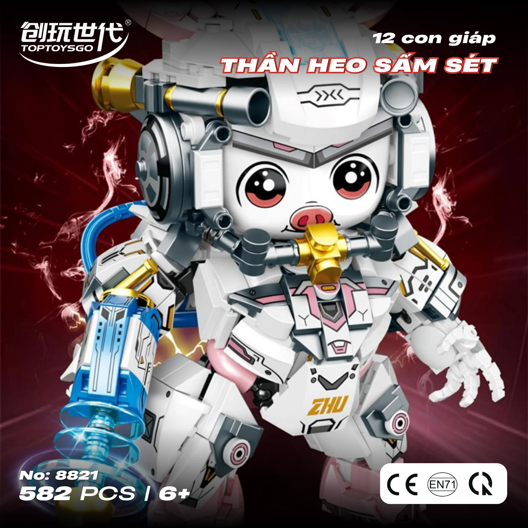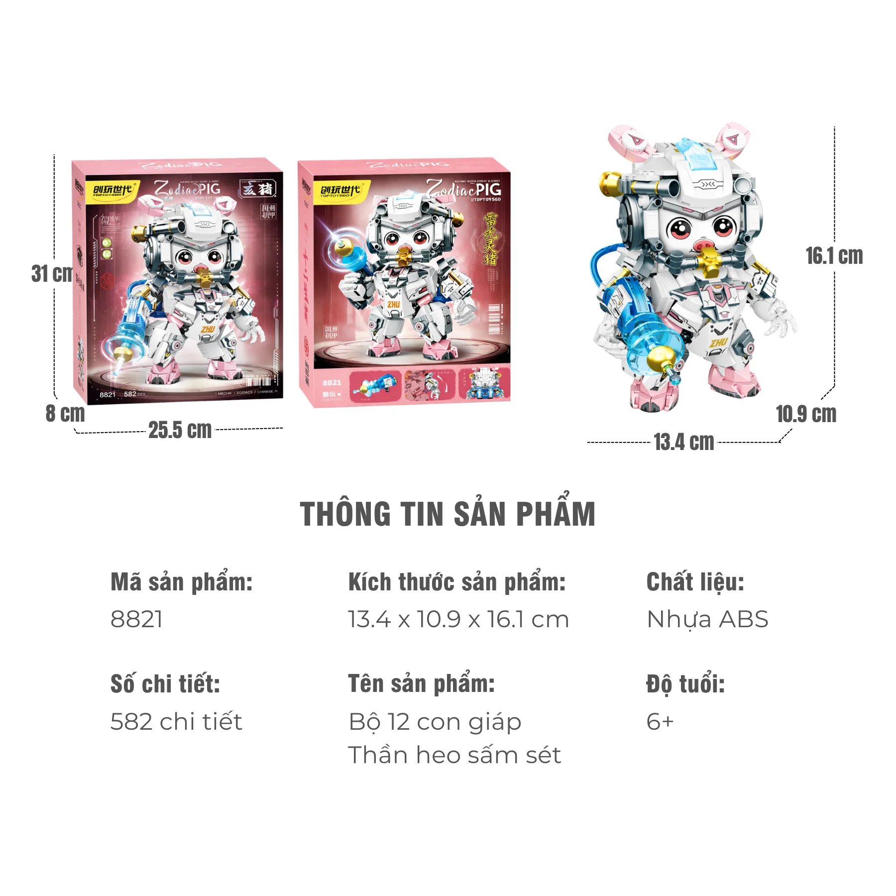 Đồ chơi lắp ráp Heo cơ giáp Zodiac NO.8821 gồm 582 mảnh ghép, phù hợp cho bé từ 6 tuổi trở lên. Mô hình lấy cảm hứng từ linh vật heo – biểu tượng của may mắn, sung túc và thịnh vượng – kết hợp phong cách robot công nghệ cao tạo nên nhân vật vừa đáng yêu vừa mạnh mẽ, thích hợp để bé chơi sáng tạo hoặc trưng bày bàn học.
