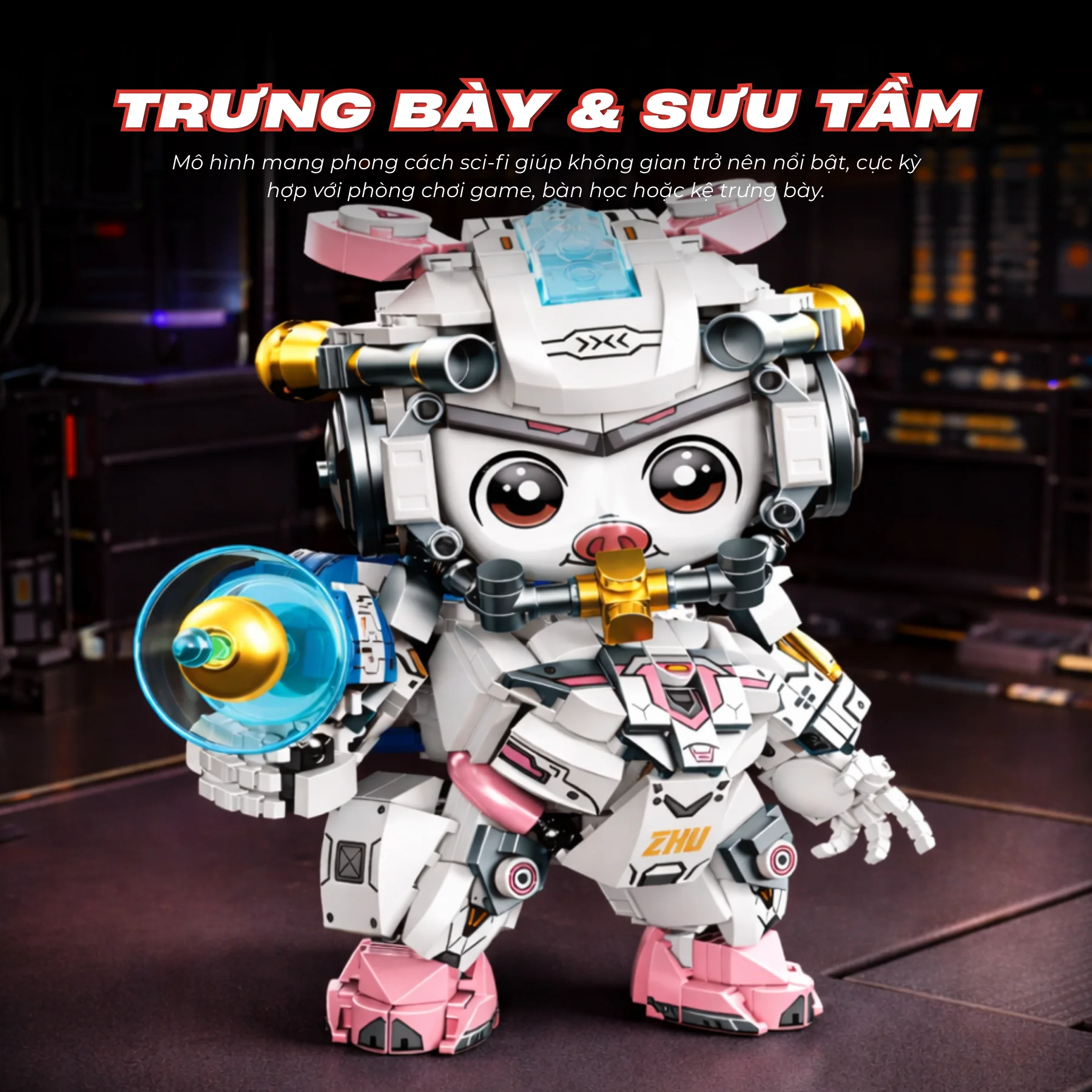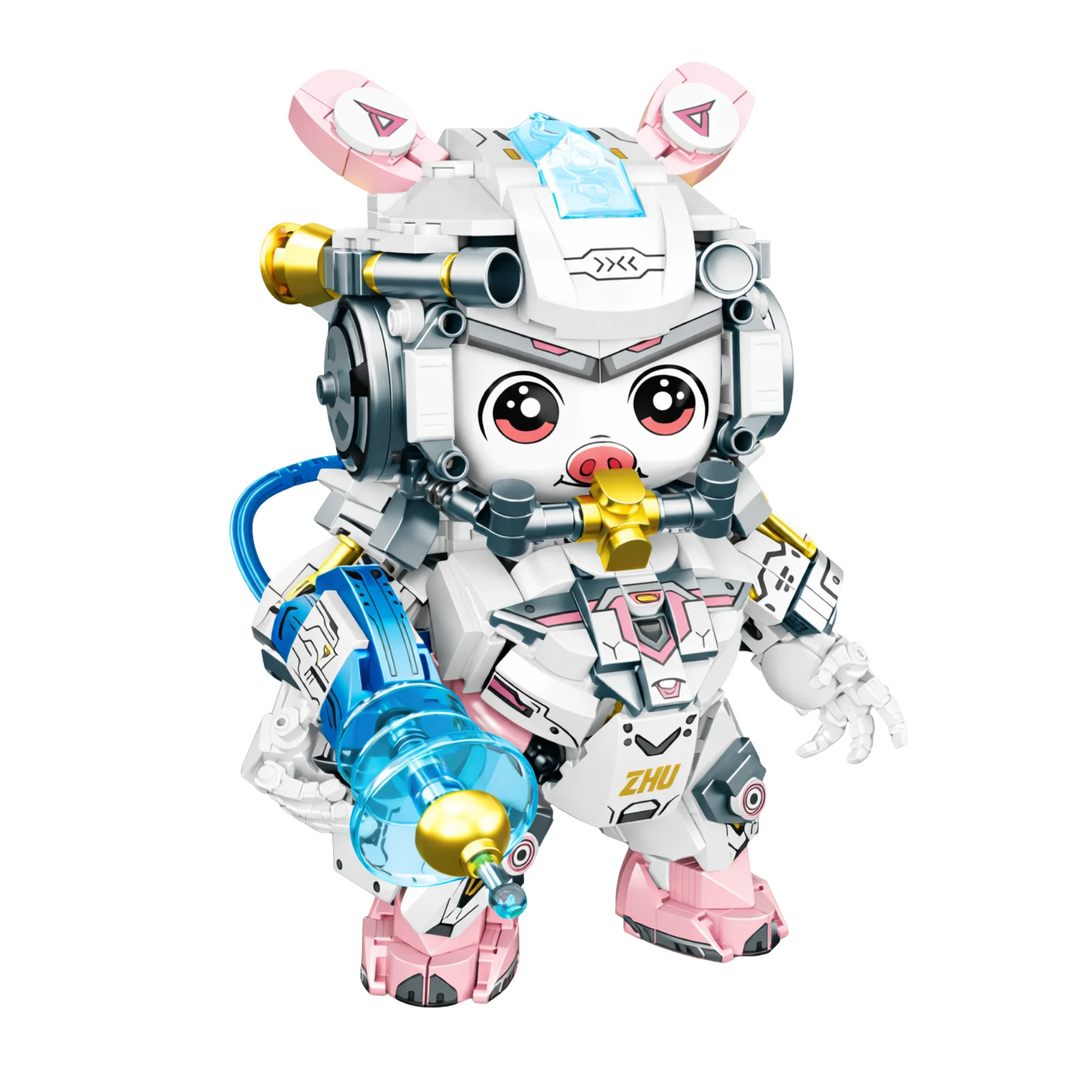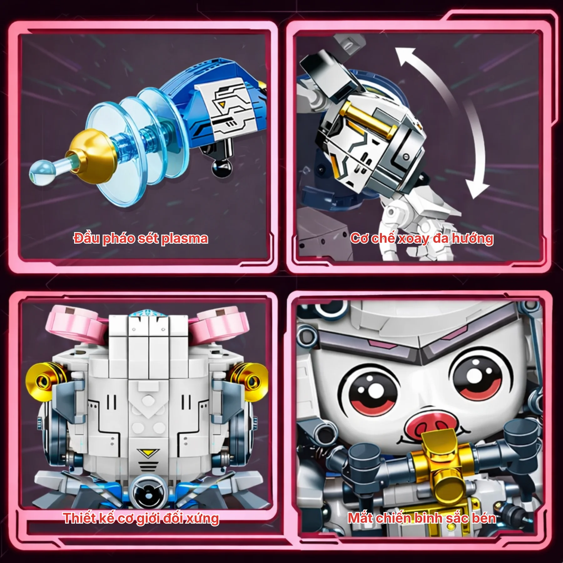 Thiết kế nổi bật với bộ giáp trắng – hồng hiện đại, chi tiết cơ khí tinh xảo và lõi năng lượng trên mũ mang phong cách tương lai. Vũ khí tia năng lượng có thể tháo lắp, các khớp tay chân linh hoạt giúp tạo nhiều tư thế hành động sau khi hoàn thiện. Họa tiết in cùng sticker trang trí giúp mô hình sống động, phù hợp làm quà tặng hoặc mô hình sưu tầm cho bé yêu thích lắp ráp.