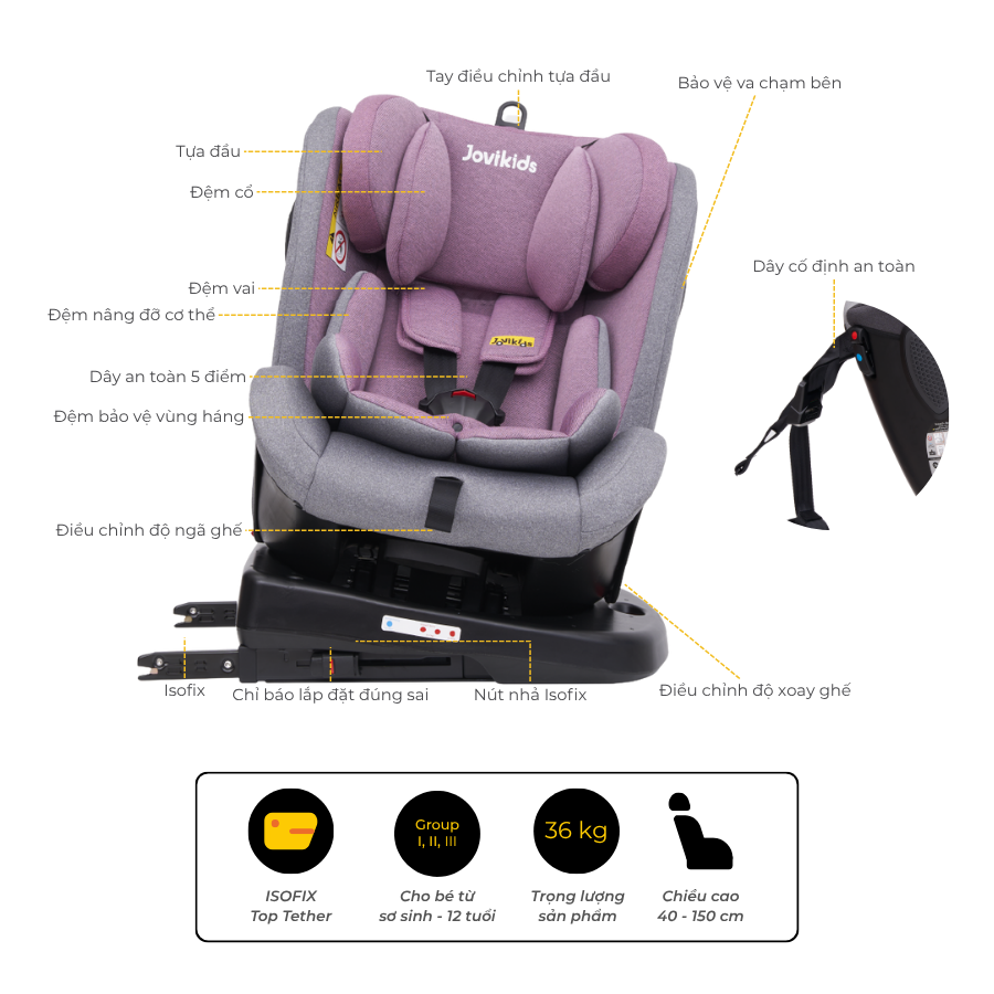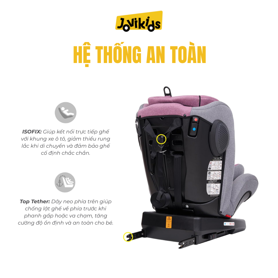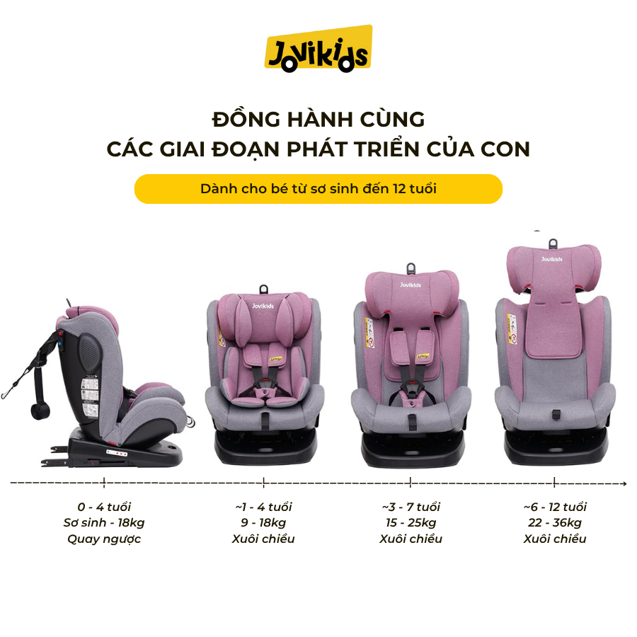 Jovikids Angela là lựa chọn đáng tin cậy cho bố mẹ đang tìm một mẫu ghế ô tô xoay 360° an toàn, tiện dụng và dùng lâu dài từ sơ sinh đến 12 tuổi. Sản phẩm đáp ứng mọi nhu cầu: bảo vệ – dễ dùng – thoải mái, phù hợp cho mọi gia đình có con nhỏ.