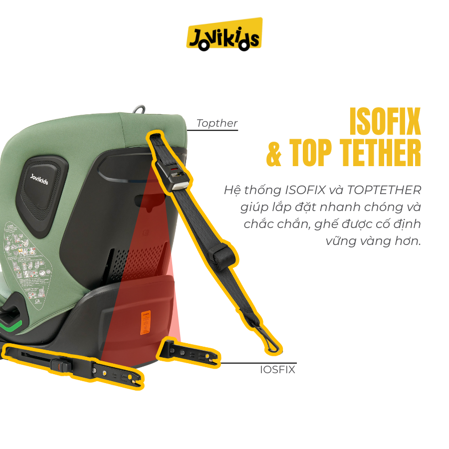 - Isofix + Top Tether – Cố định siêu chắc chắn. Ghế không xê dịch khi xe phanh gấp hoặc vào cua. Lắp đặt nhanh chóng, an toàn và tương thích đa số các loại xe phổ biến.