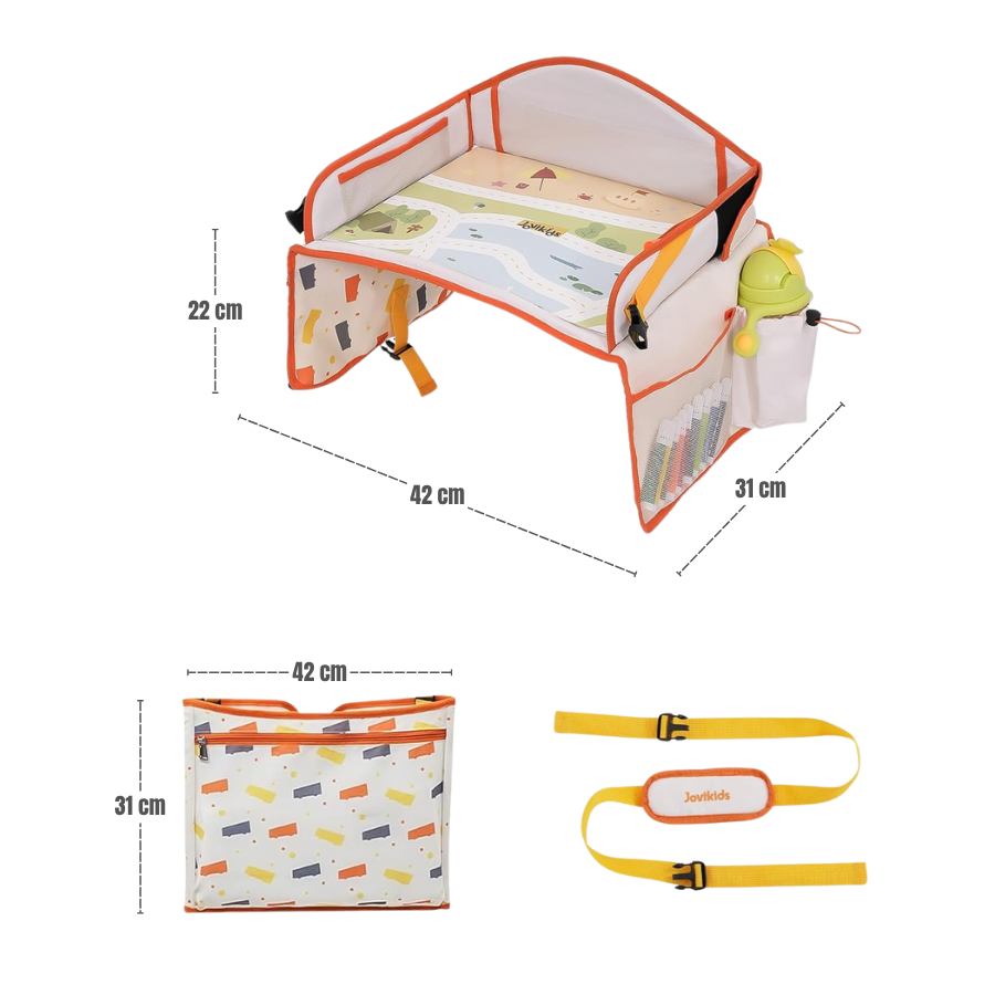 Hệ thống 7 túi phụ lớn nhỏ chứa được bình nước, đồ chơi, bút màu, khăn giấy, snack hoặc sách. Khay có thể gấp gọn như túi xách, dễ mang theo trong mọi chuyến đi – từ đi ô tô, dã ngoại, về quê đến ra sân bay.