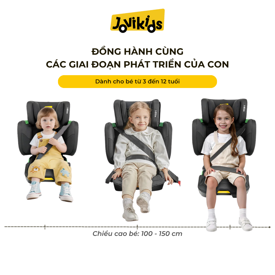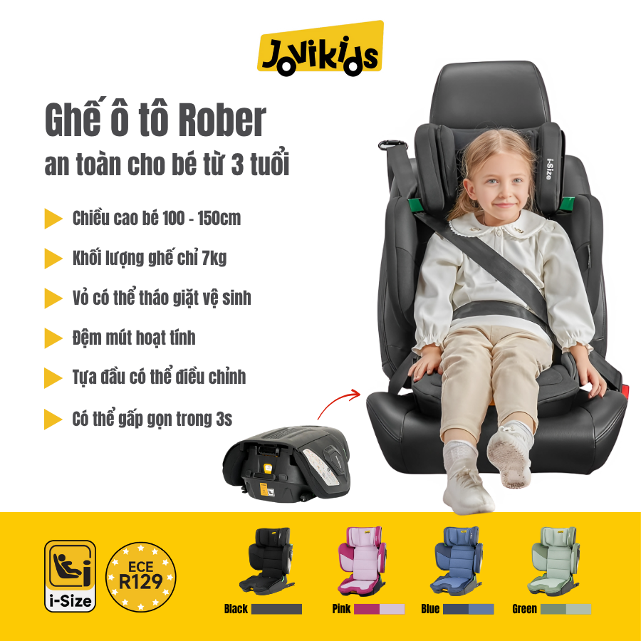 Jovikids Rober là mẫu ghế nâng lưng cao dành cho trẻ từ 3 – 12 tuổi, hỗ trợ chiều cao từ 100 – 150cm, phù hợp cho trẻ đã qua giai đoạn sử dụng ghế i-Size cho bé nhỏ.