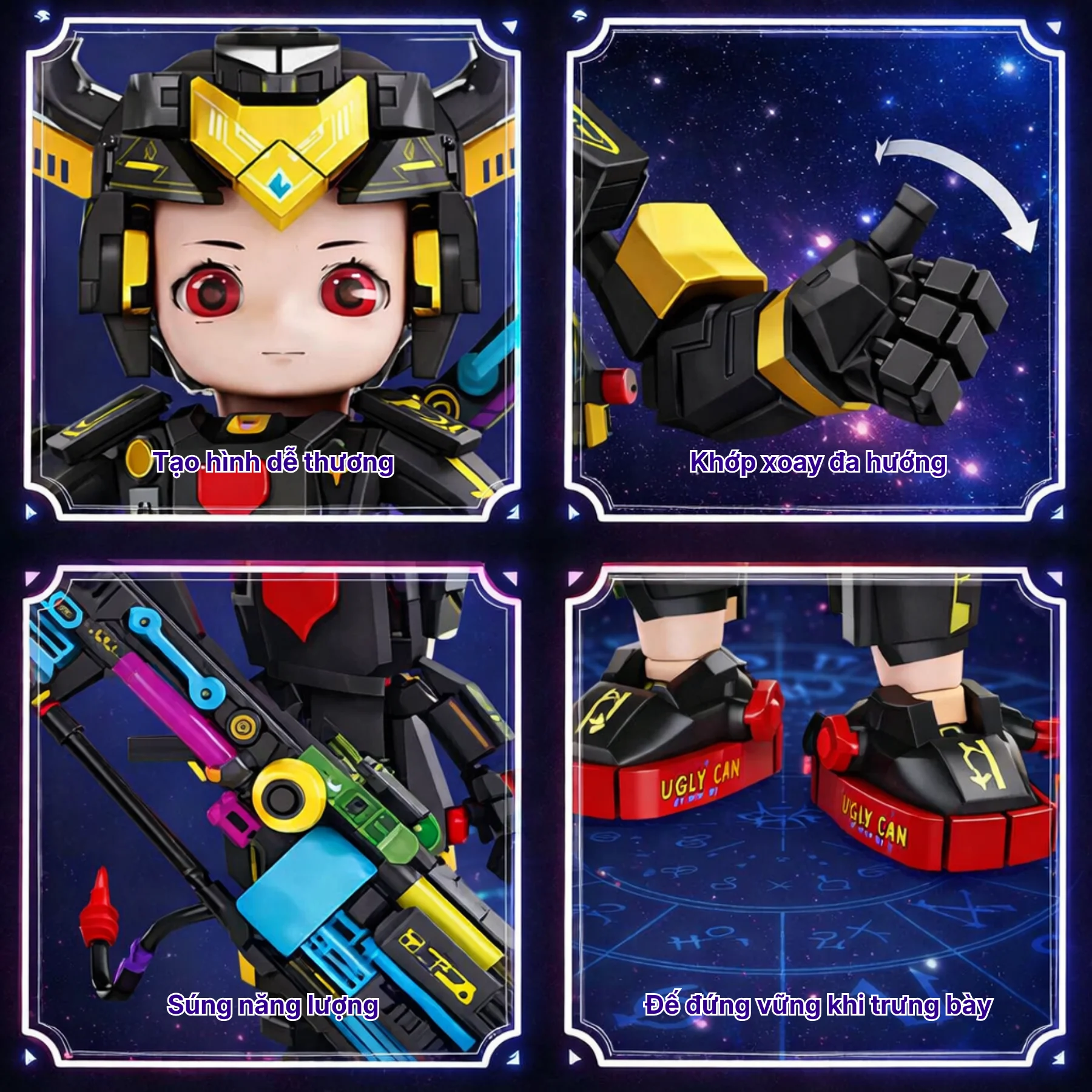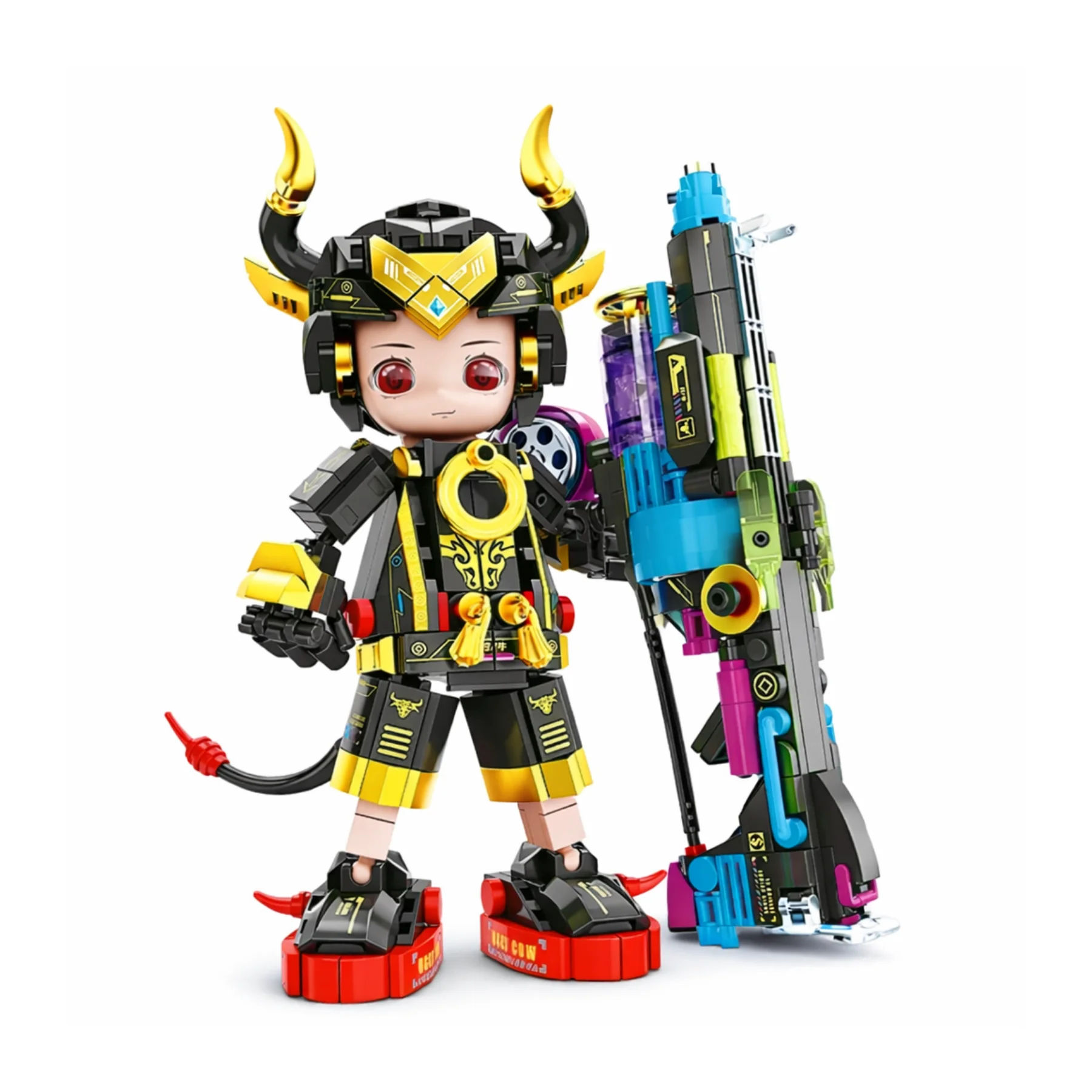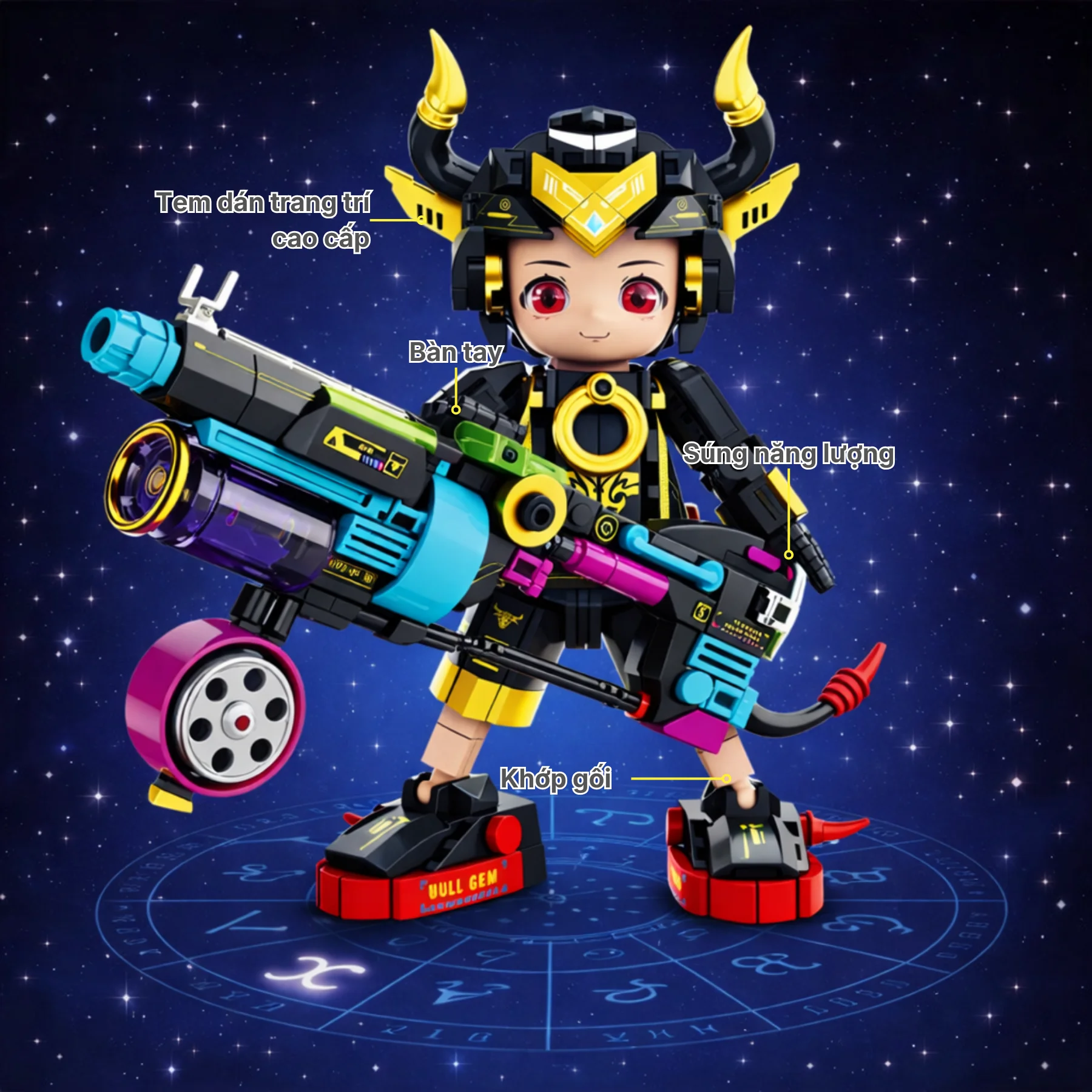 Thiết kế nổi bật với bộ giáp đen – vàng cá tính, cặp sừng đặc trưng cùng pháo năng lượng cỡ lớn tạo cảm giác chiến binh tương lai. Các khớp tay chân linh hoạt giúp tạo nhiều tư thế chiến đấu sau khi hoàn thiện, chi tiết in họa tiết cùng sticker trang trí làm mô hình sinh động và có giá trị trưng bày cao, phù hợp làm quà tặng cho bé yêu thích lắp ráp hoặc sưu tầm.