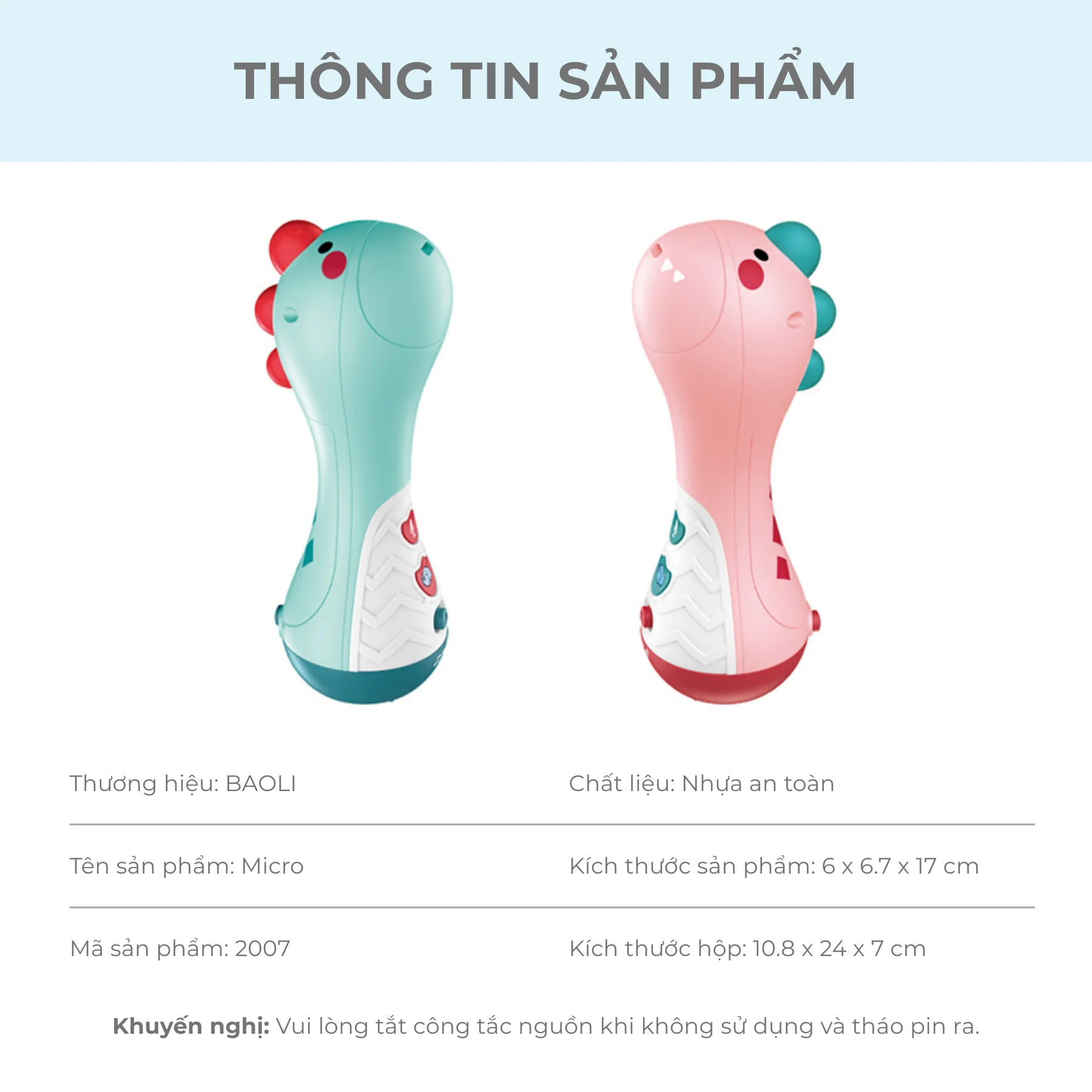 Microphone đồ chơi Dreaming Party BAOLI 2007 là món đồ chơi âm nhạc thú vị dành cho trẻ từ 36 tháng tuổi trở lên. Với thiết kế hình khủng long dễ thương, màu sắc tươi sáng và nhiều chức năng tương tác, sản phẩm giúp bé vừa chơi vừa khám phá thế giới âm nhạc theo cách vui nhộn và sáng tạo.