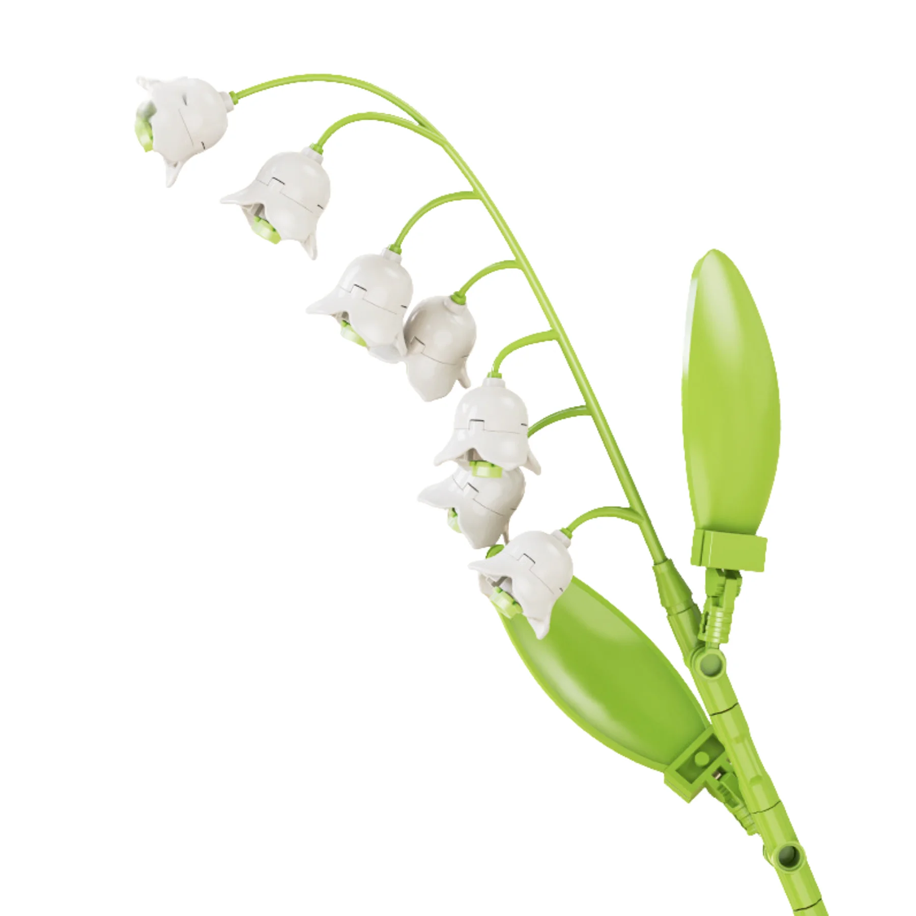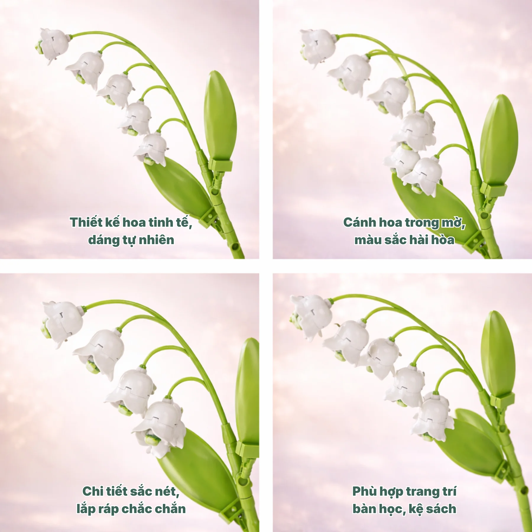 Mô hình tái hiện Hoa Lan Chuông với các bông hoa hình chuông xếp dọc theo thân cong mềm mại, kết hợp lá xanh mướt tạo cảm giác tự nhiên và hài hòa. Thiết kế hoa mang phong cách hiện đại, vừa giữ được nét mong manh của hoa thật, vừa đảm bảo độ chắc chắn của mô hình lắp ráp khối.