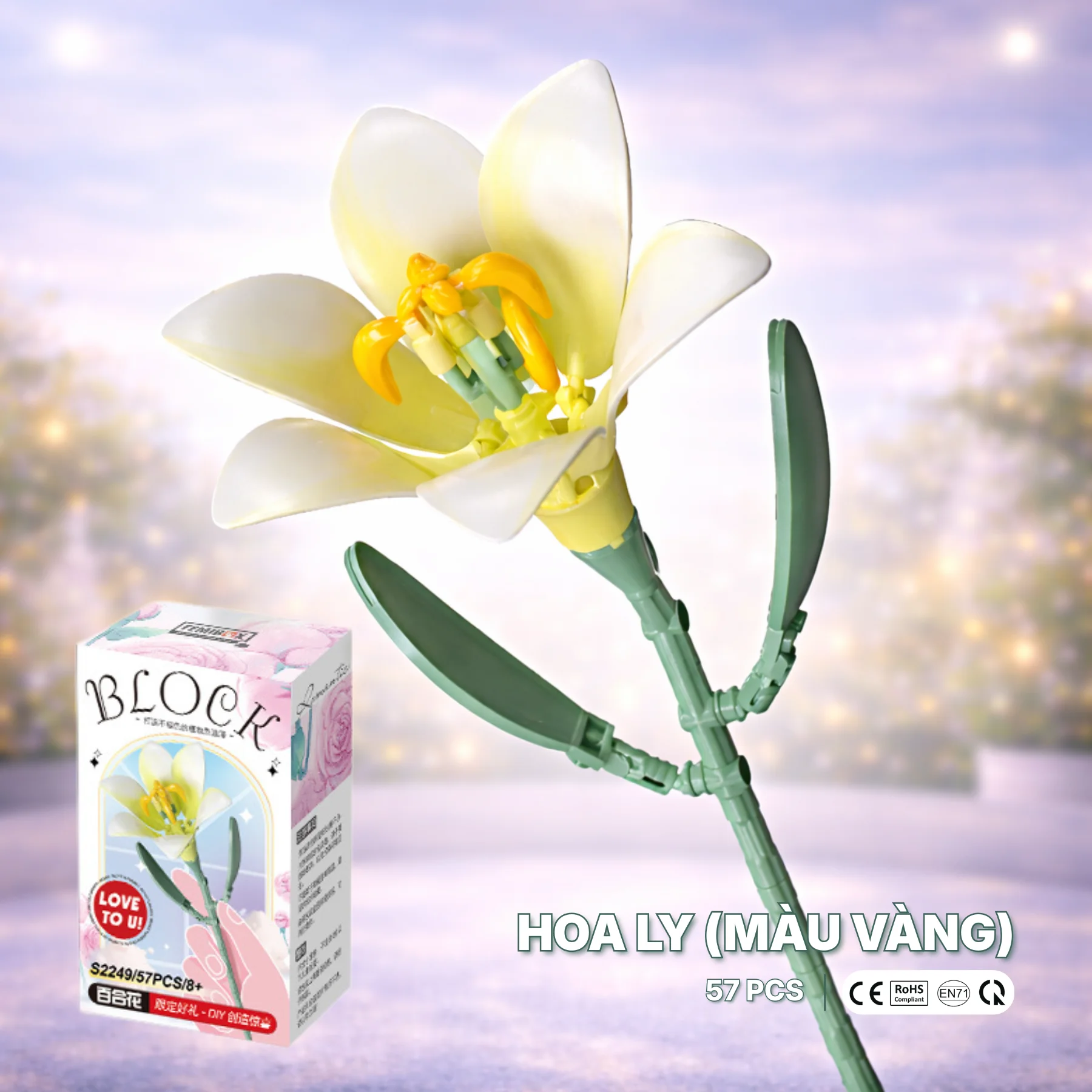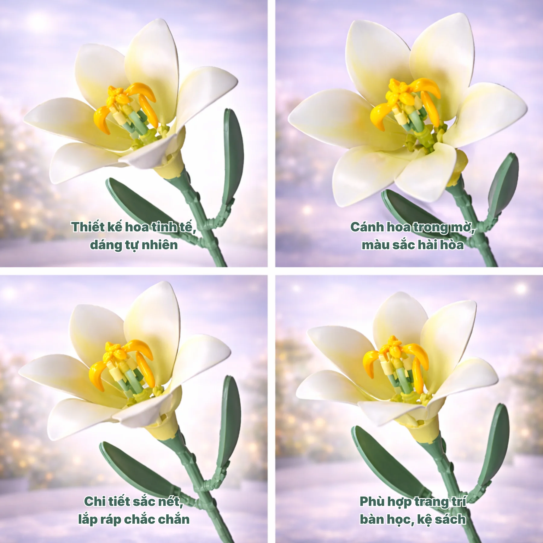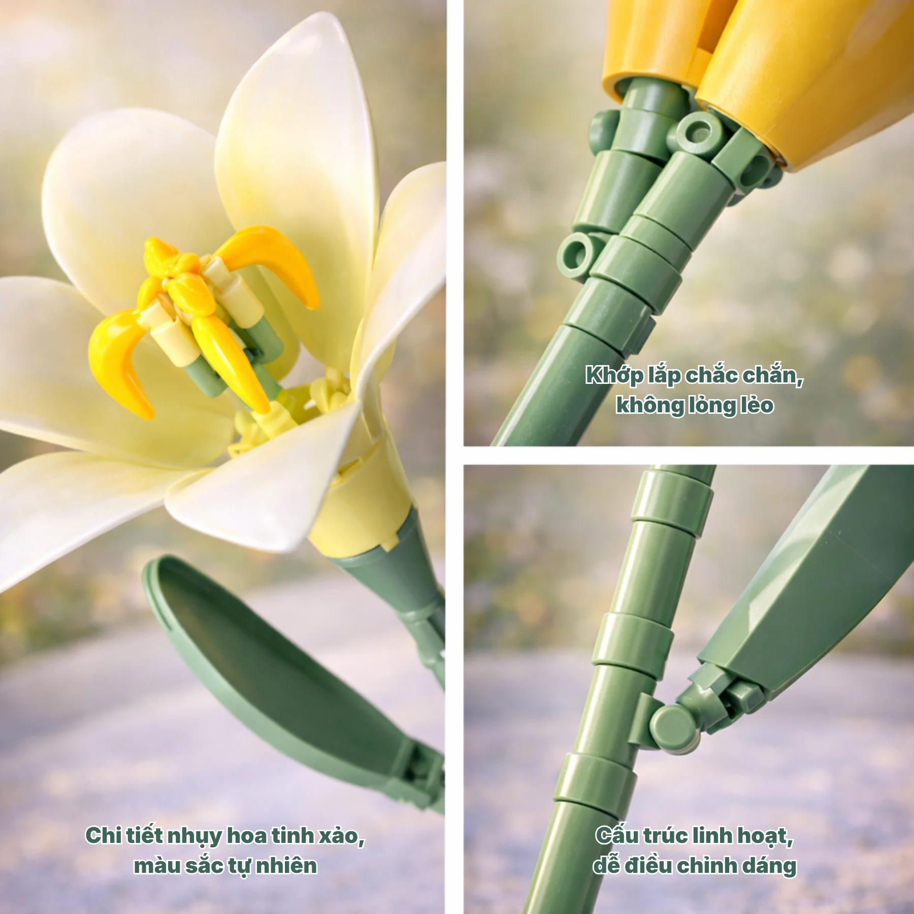 Mô hình tái hiện Hoa Ly với cánh hoa mềm mại, màu sắc chuyển nhẹ tự nhiên, phần nhụy được thiết kế nổi bật, hài hòa với thân và lá xanh mát. Quá trình lắp ráp đòi hỏi sự tỉ mỉ và chính xác, góp phần phát triển tư duy logic, khả năng quan sát và tính kiên nhẫn.