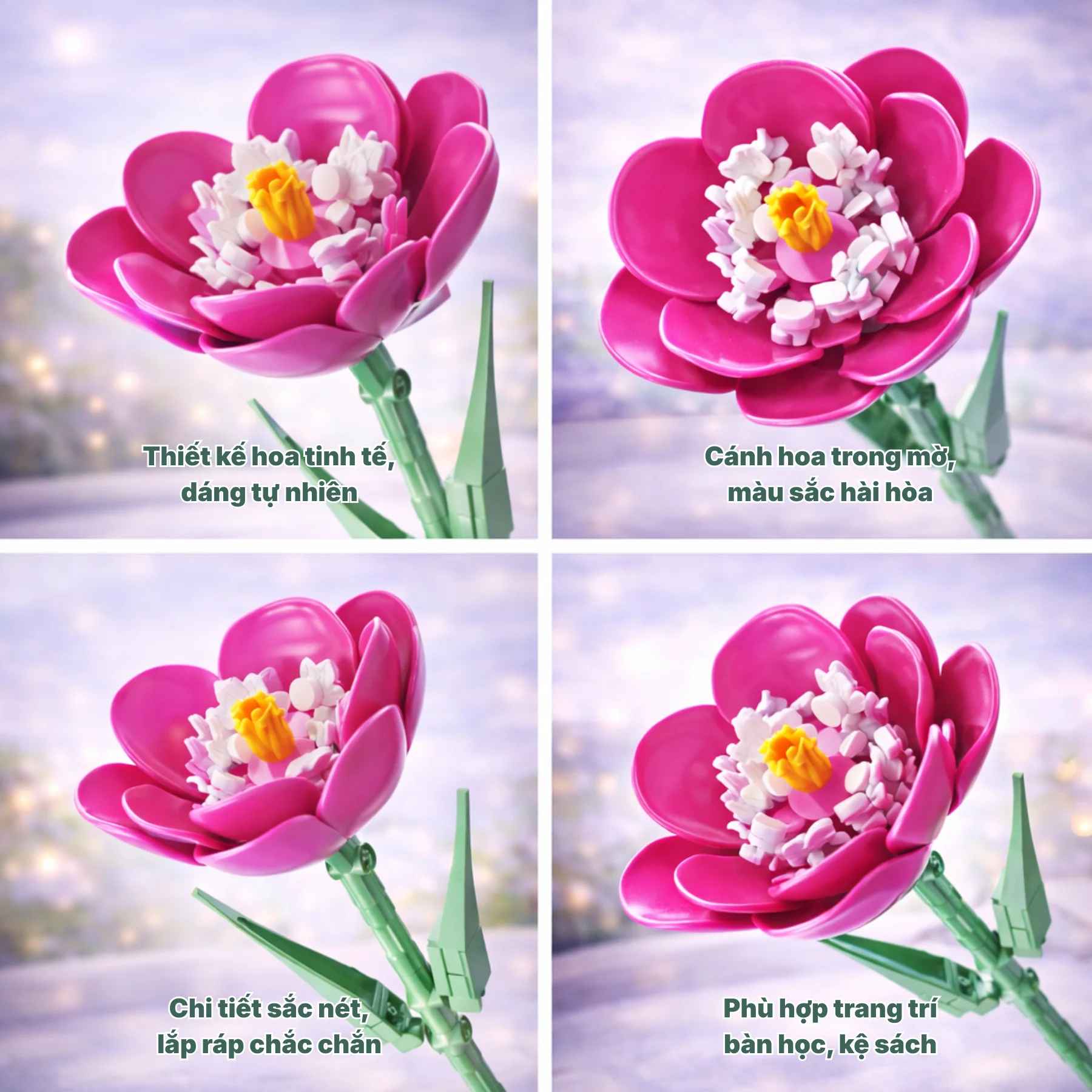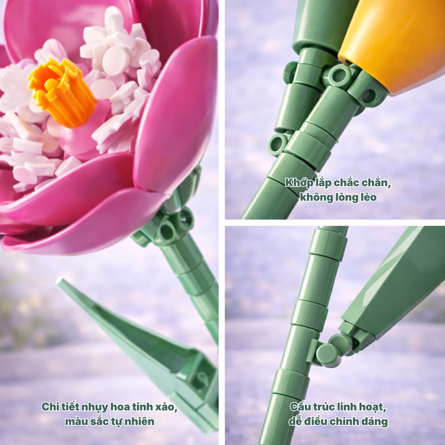 Phần thân và lá hoa được thiết kế chắc chắn, các mảnh ghép khít nhau, bề mặt nhẵn mịn, mang lại trải nghiệm lắp ráp mượt mà và dễ chịu. Chiều cao cành hoa có thể điều chỉnh linh hoạt, dễ dàng phối hợp với nhiều kiểu bình và không gian khác nhau.