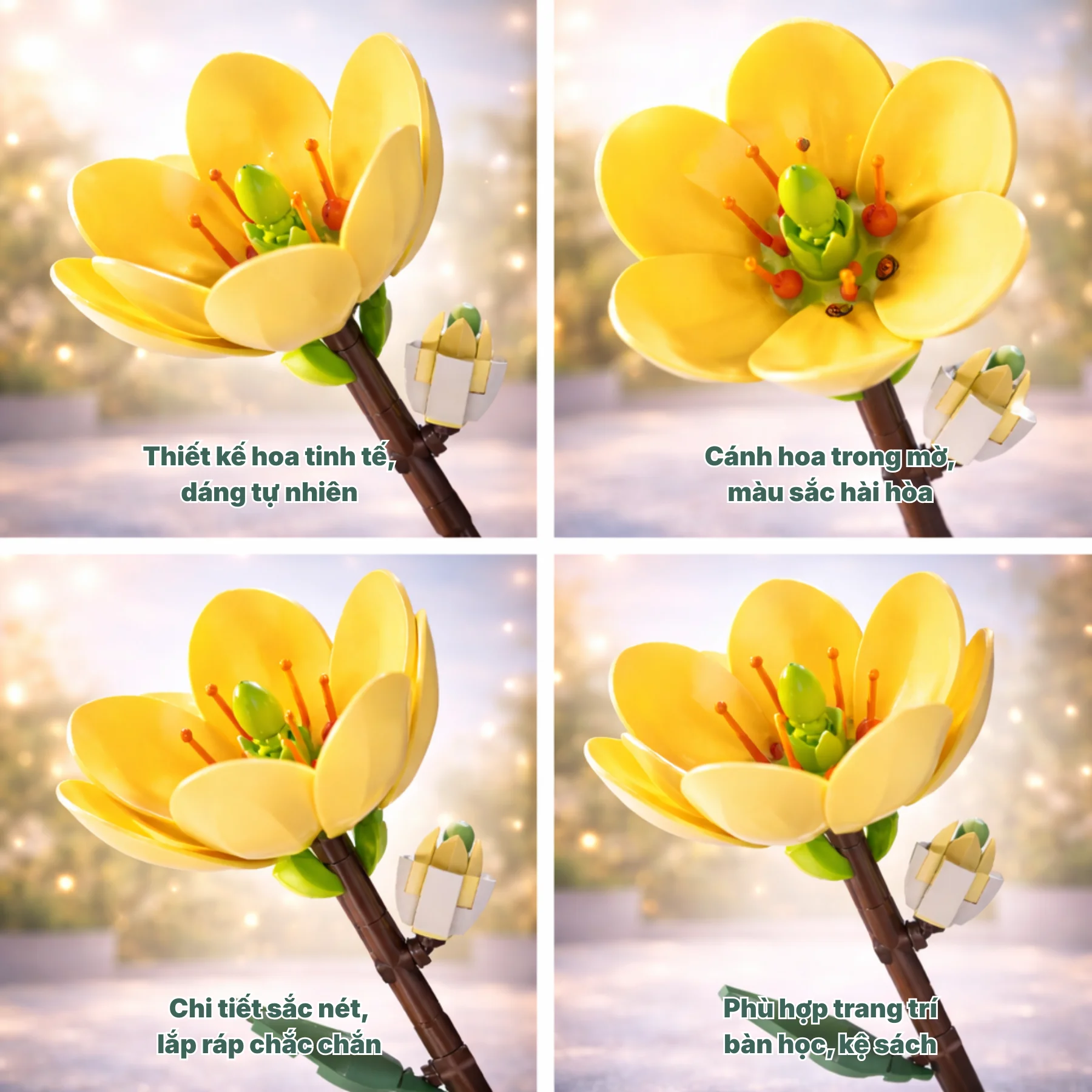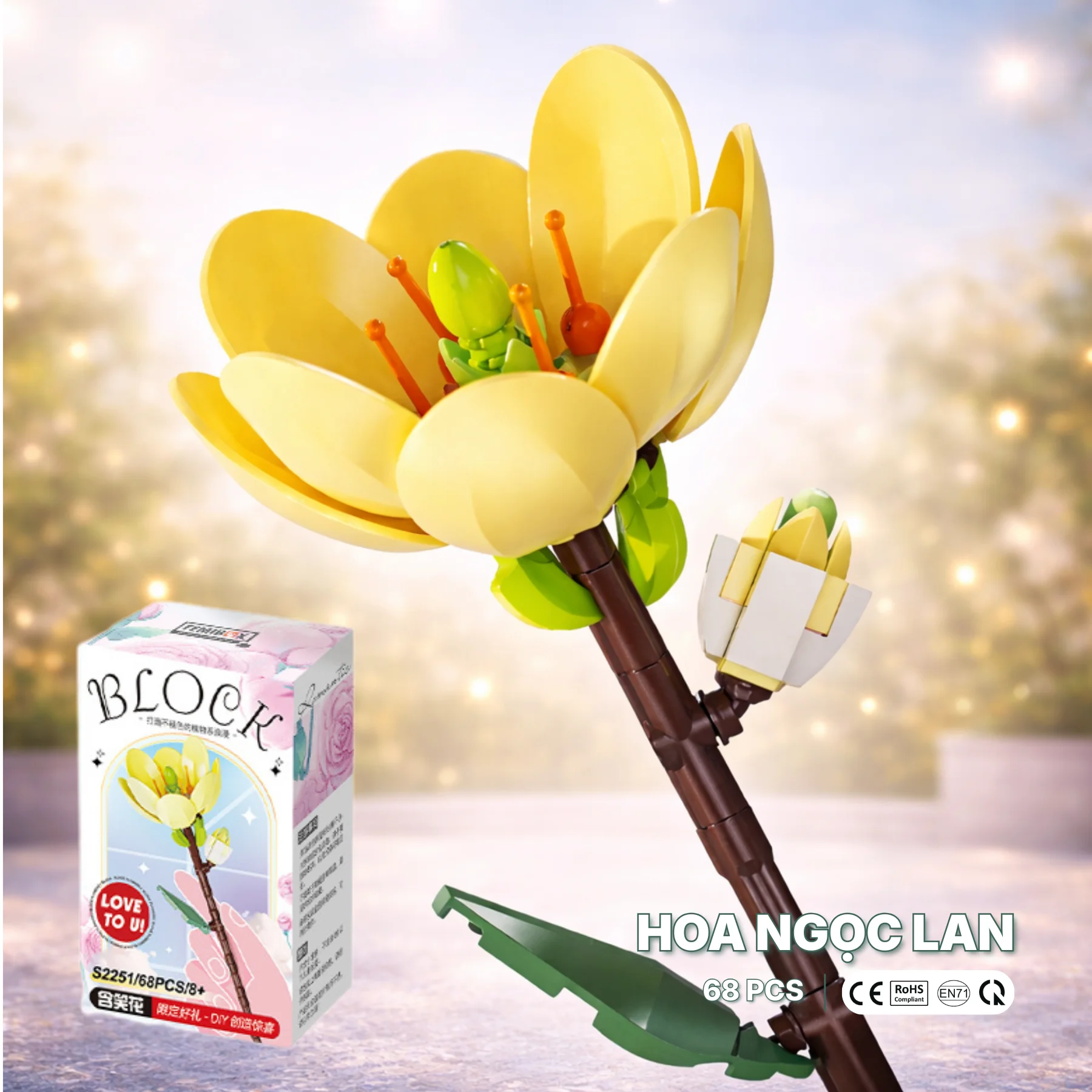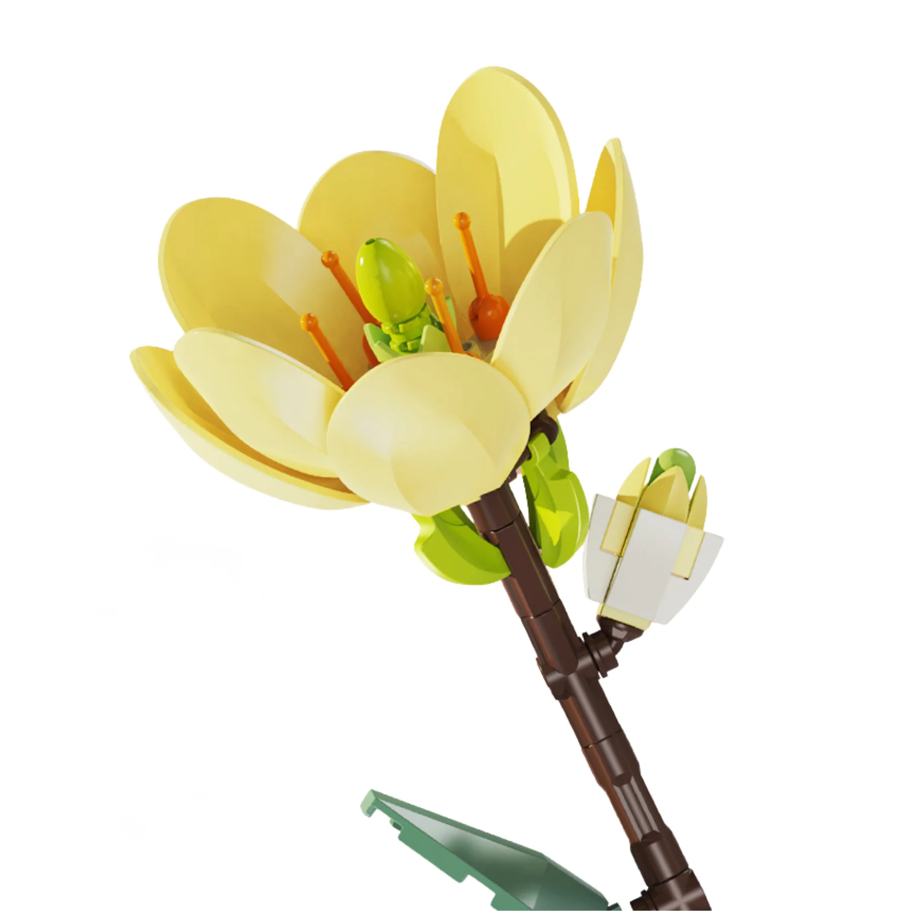 Mô hình hoa ngọc lan được tái hiện với cánh hoa bo tròn mềm mại, gam màu vàng nhạt dịu mắt cùng phần nhụy nổi bật, gợi cảm giác thuần khiết và gần gũi với thiên nhiên. Quá trình lắp ráp yêu cầu sự tỉ mỉ vừa phải, giúp phát triển tư duy logic, khả năng quan sát và cảm nhận hình khối.