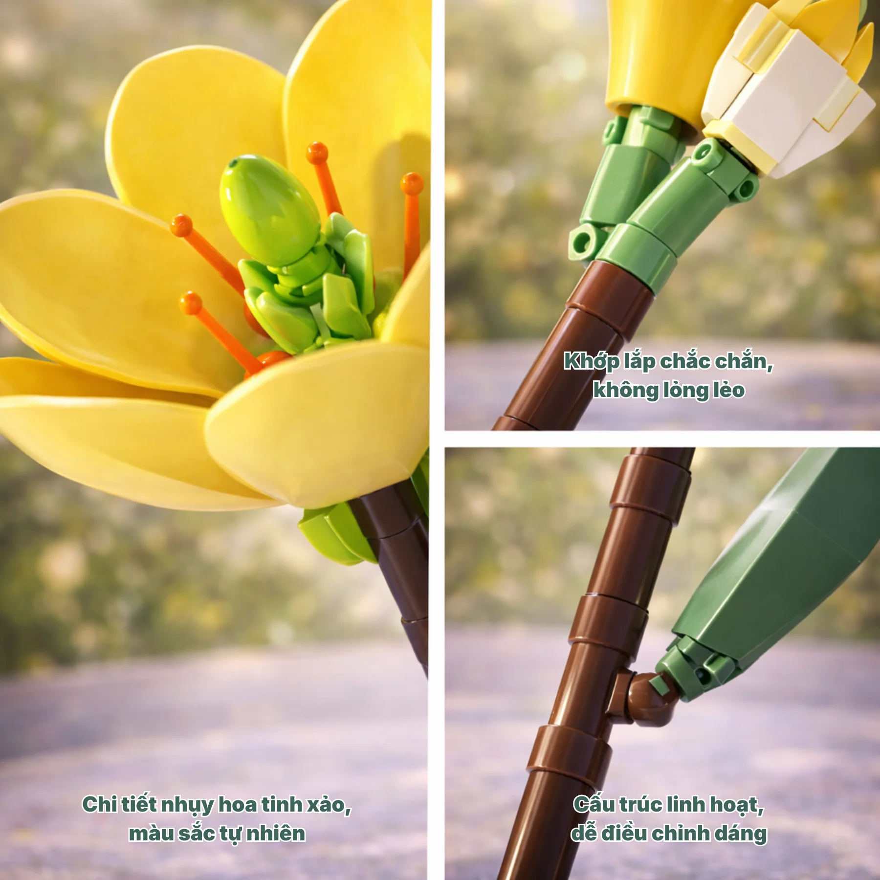 Các mảnh ghép được thiết kế gọn gàng, khớp nối chắc chắn, bề mặt nhẵn mịn, mang lại trải nghiệm lắp ráp liền mạch và dễ chịu. Phần thân và lá có thể điều chỉnh linh hoạt, cho phép người chơi tự do tạo dáng và phối hợp cùng các mẫu hoa khác trong cùng bộ sưu tập.