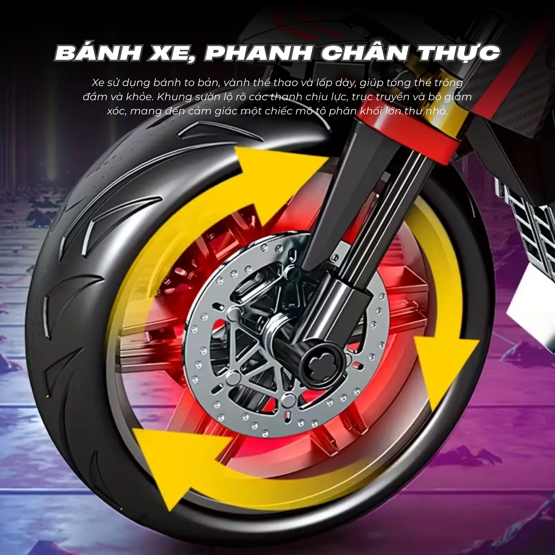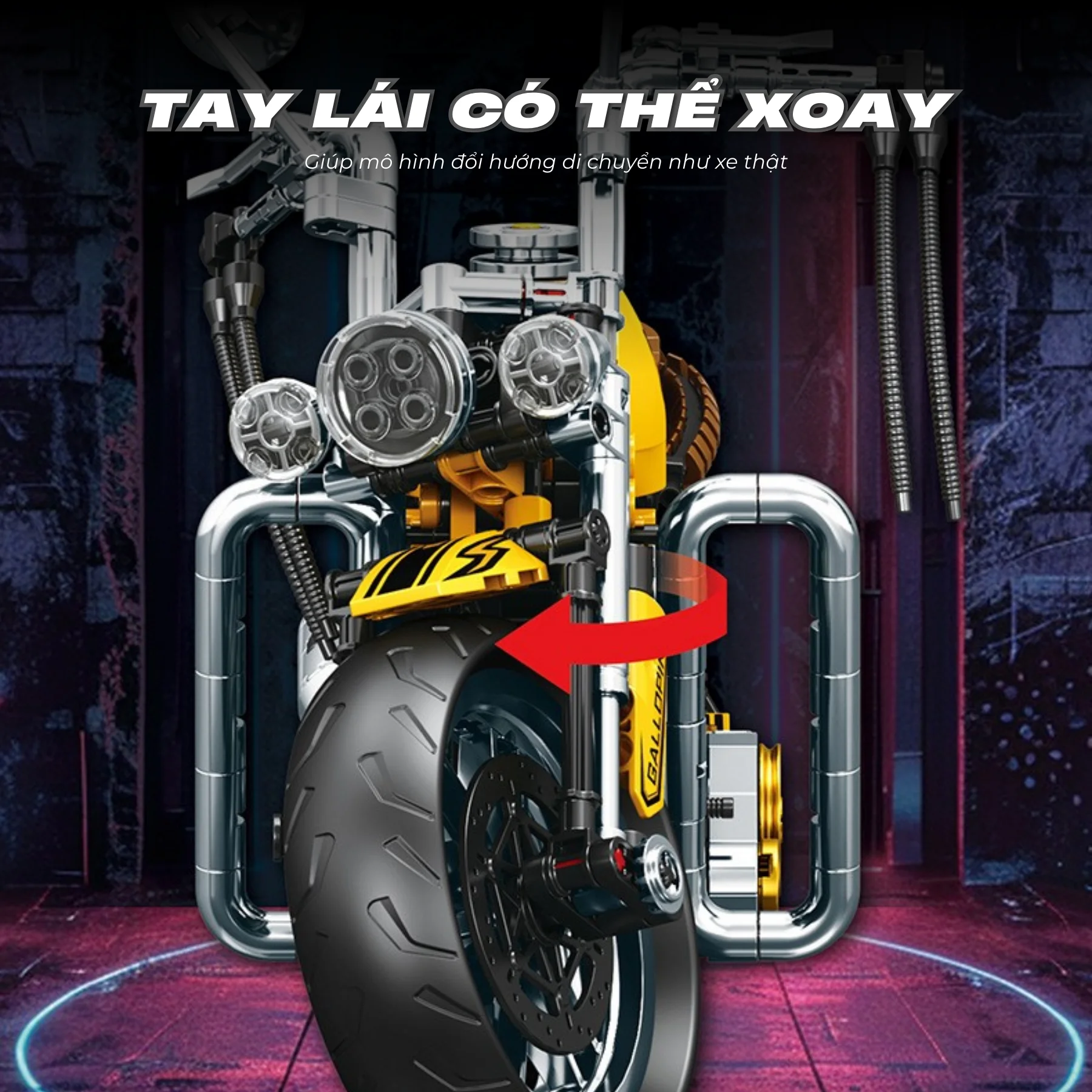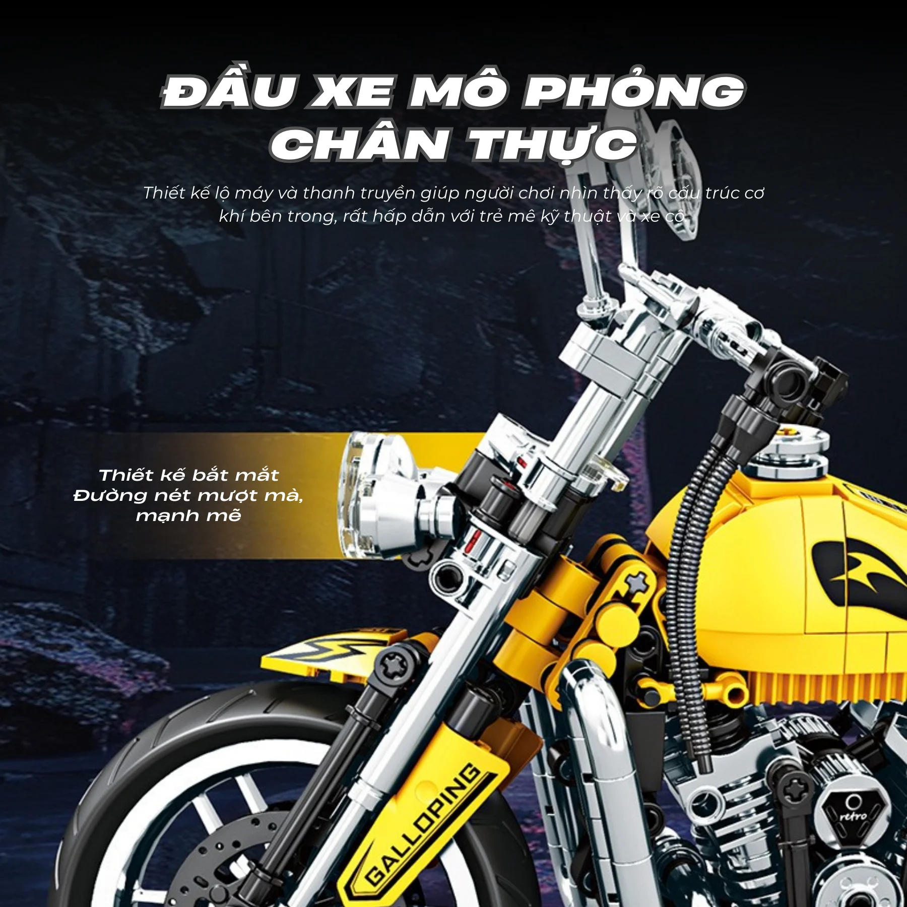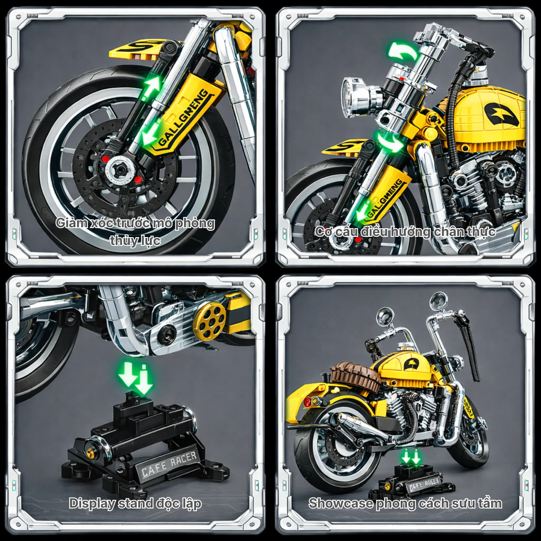 Mô hình được thiết kế với tay lái có thể xoay điều hướng, cho phép bánh trước thay đổi hướng giống như xe mô tô thật. Ngoài ra, xe còn được trang bị hệ thống giảm xóc trước sau, giúp tái hiện cấu trúc cơ khí của một chiếc mô tô thực tế.