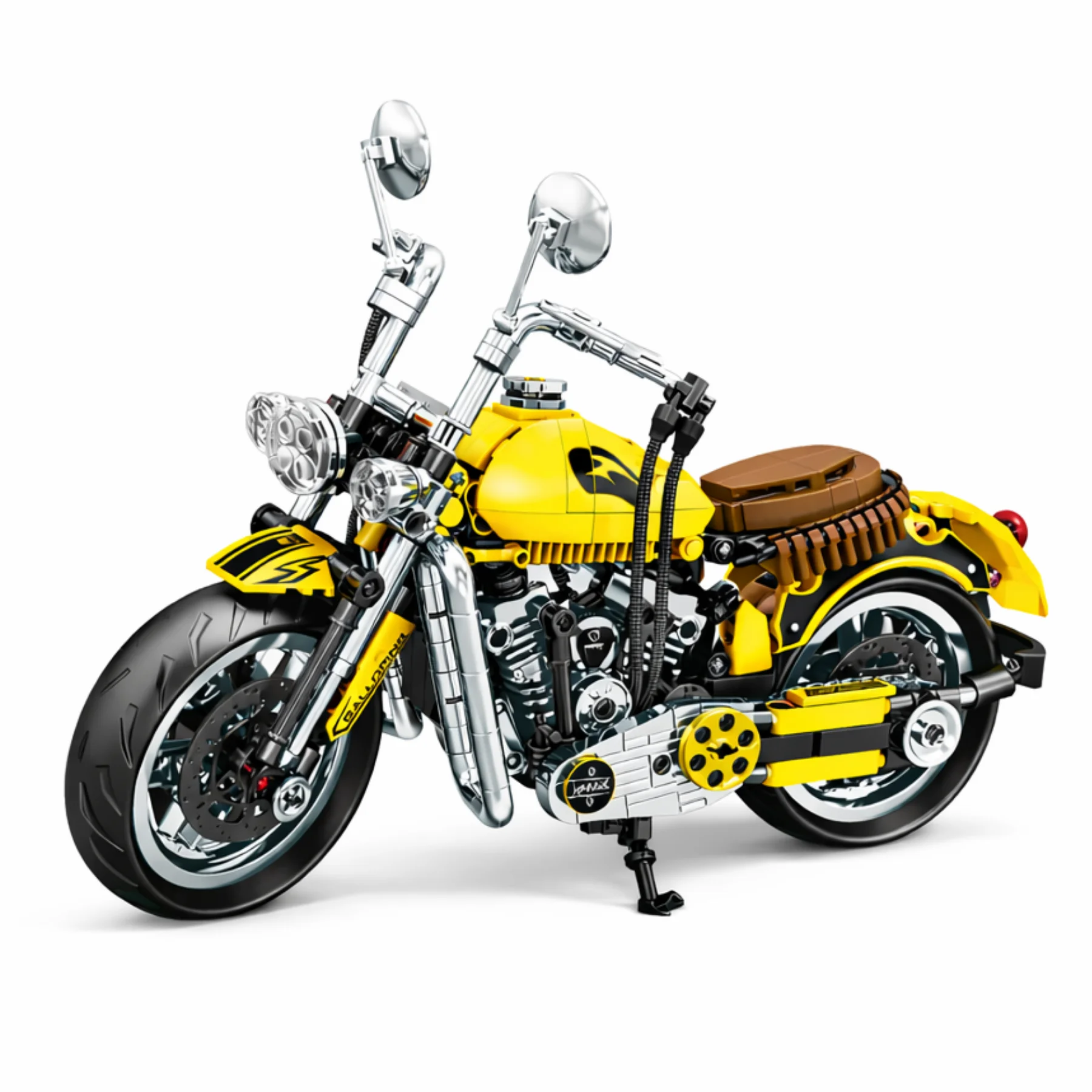 Mô hình xe được thiết kế với tông màu vàng – bạc – đen, tạo nên phong cách nổi bật và đậm chất cổ điển. Phần đầu xe được trang bị đèn pha tròn đôi, tay lái cao và hệ thống gương chiếu hậu đặc trưng của các dòng mô tô cruiser.