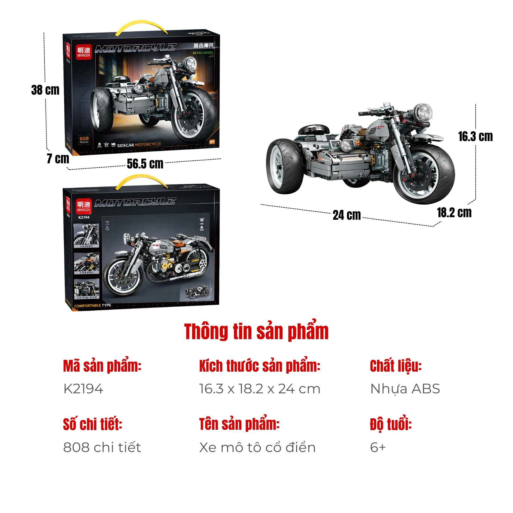 Bộ đồ chơi lắp ráp xe mô tô Retro Sidecar MINGDI K2194 mang đến trải nghiệm xây dựng mô hình thú vị với thiết kế cổ điển độc đáo. Sau khi hoàn thiện, mô hình không chỉ là một món đồ chơi mà còn là một sản phẩm trưng bày ấn tượng dành cho những người yêu thích mô tô và mô hình cơ khí.