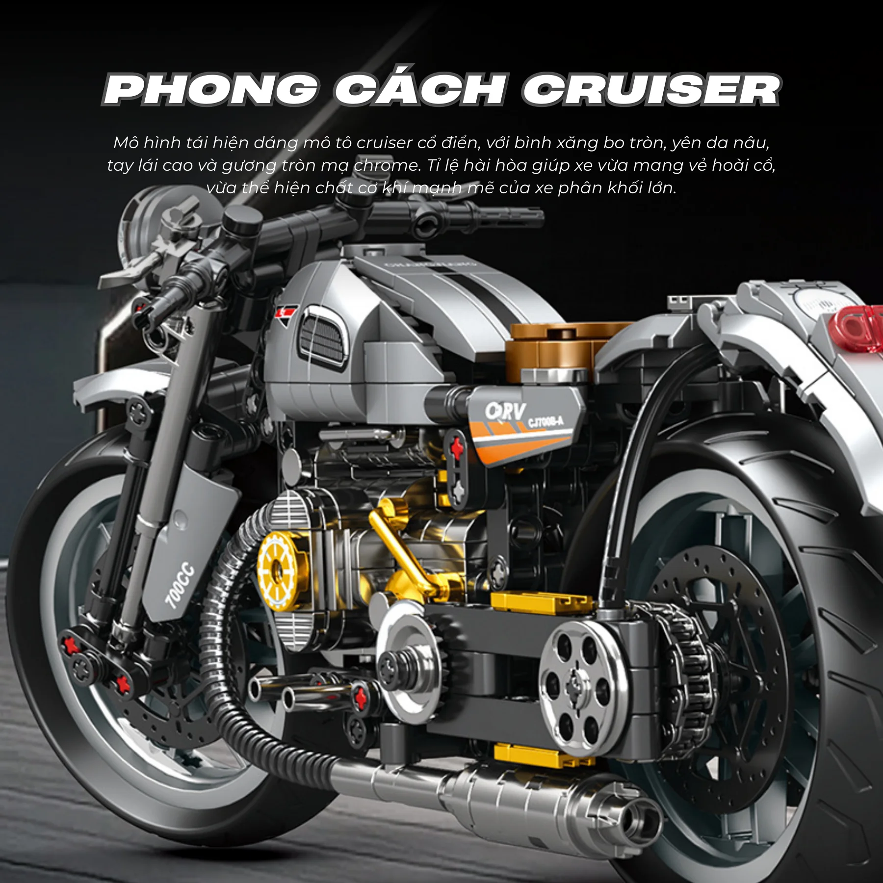 Mô hình xe được thiết kế với tông màu xám kim loại kết hợp đen và cam, mang phong cách cổ điển nhưng vẫn rất hiện đại. Phần đầu xe nổi bật với đèn pha tròn lớn, tay lái thấp cùng bộ khung chắc chắn, tạo nên vẻ ngoài mạnh mẽ.