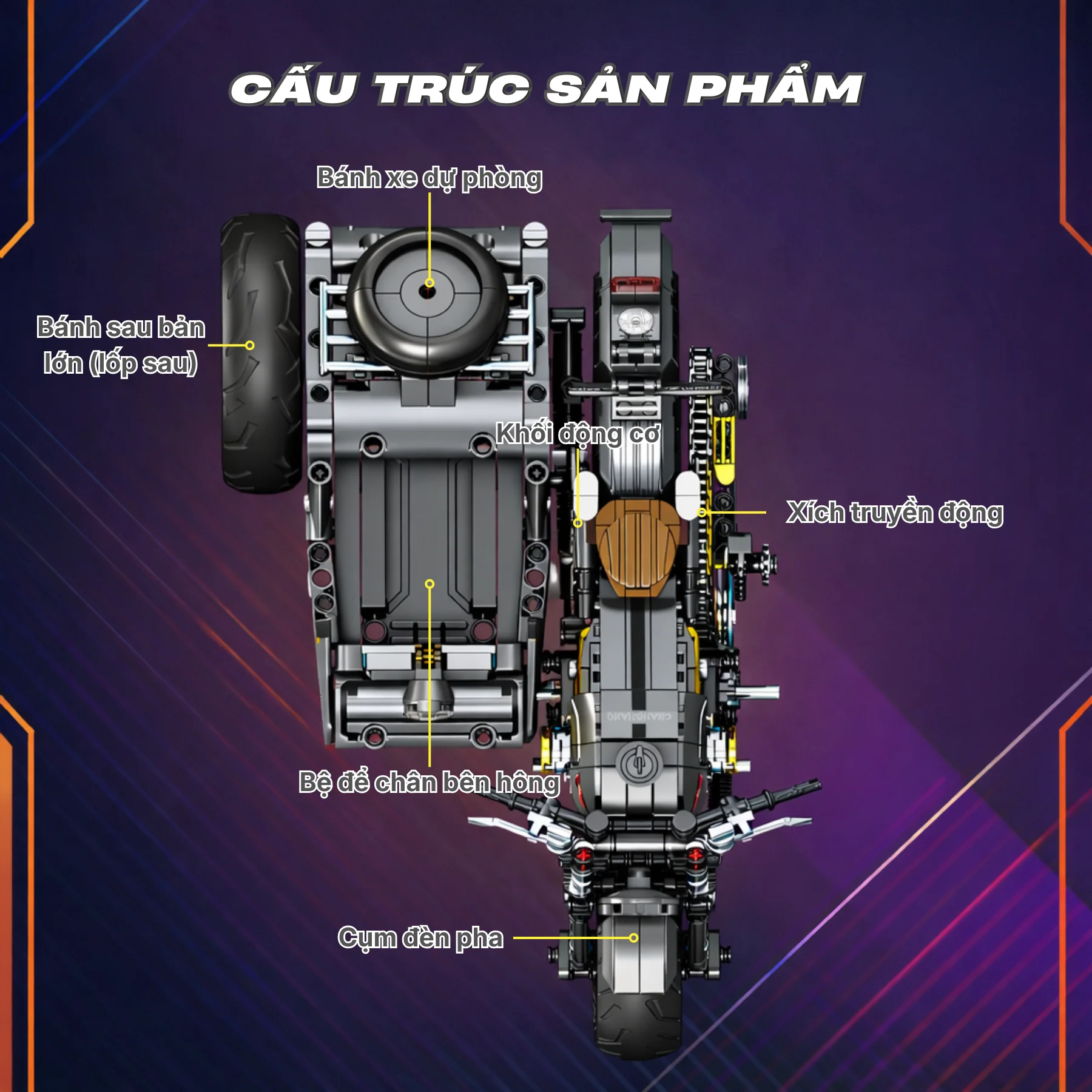 Sau khi hoàn thiện, chiếc mô tô sidecar có thể được dùng để trưng bày trên bàn làm việc, kệ sách hoặc tủ mô hình. Thiết kế chi tiết và kích thước lớn giúp mô hình trở thành một điểm nhấn nổi bật trong bộ sưu tập.
