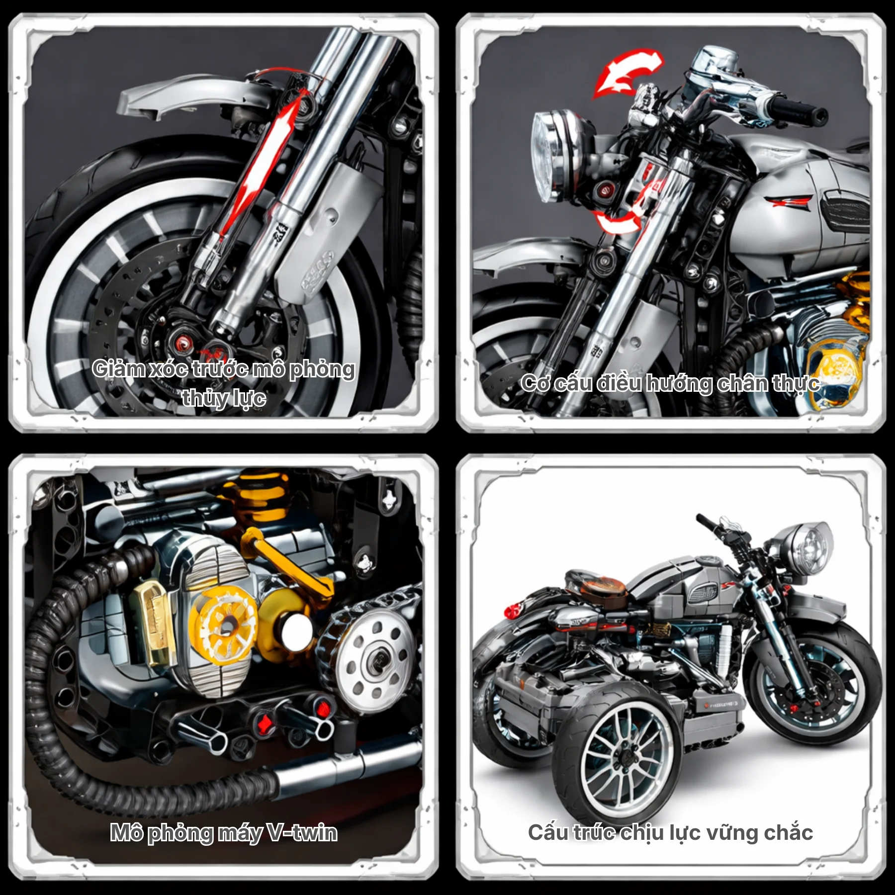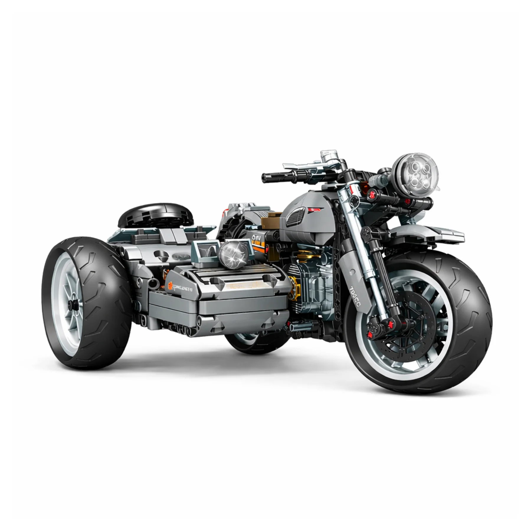 Điểm nổi bật của bộ mô hình này là thùng xe sidecar gắn bên hông, mang phong cách của những chiếc mô tô du lịch cổ điển. Sidecar được thiết kế với bánh xe riêng và kết cấu chắc chắn, tạo nên tổng thể rất độc đáo và khác biệt so với các mô hình xe mô tô thông thường.