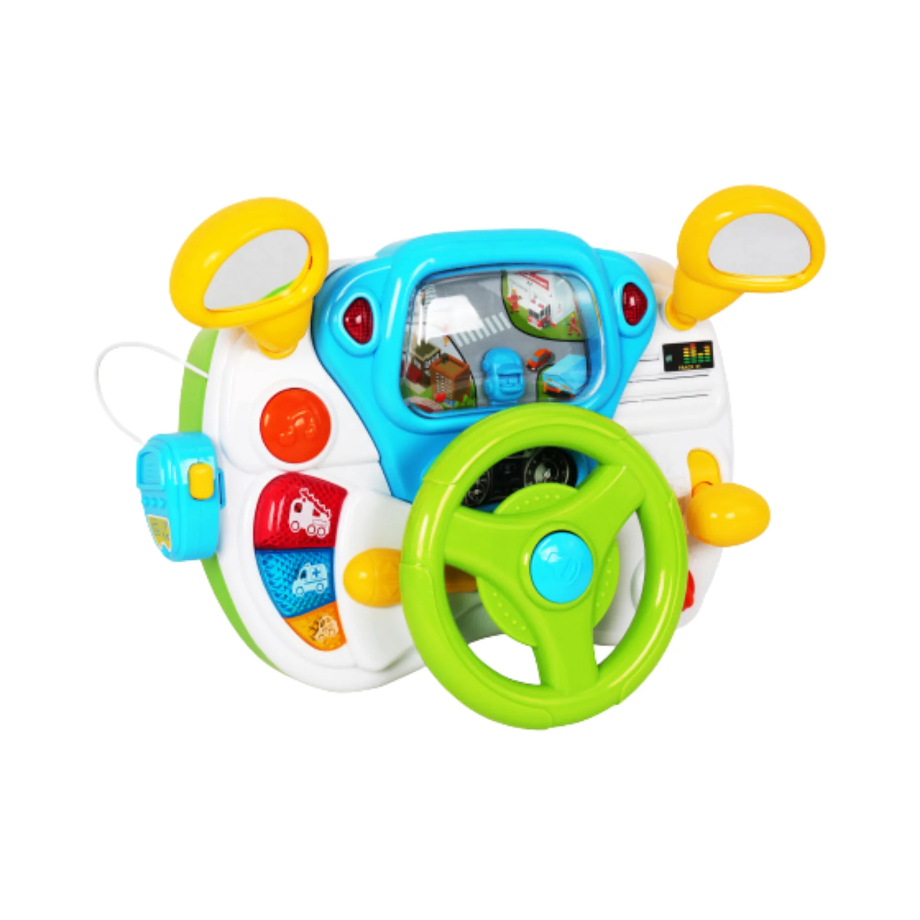 Bảng điều khiển được thiết kế sinh động giống như một chiếc xe thật với vô lăng lớn, cần gạt xi nhan, cần số và màn hình hiển thị đường phố. Khi bé xoay vô lăng, chiếc xe trong màn hình sẽ di chuyển theo con đường tạo cảm giác như đang lái xe thật.