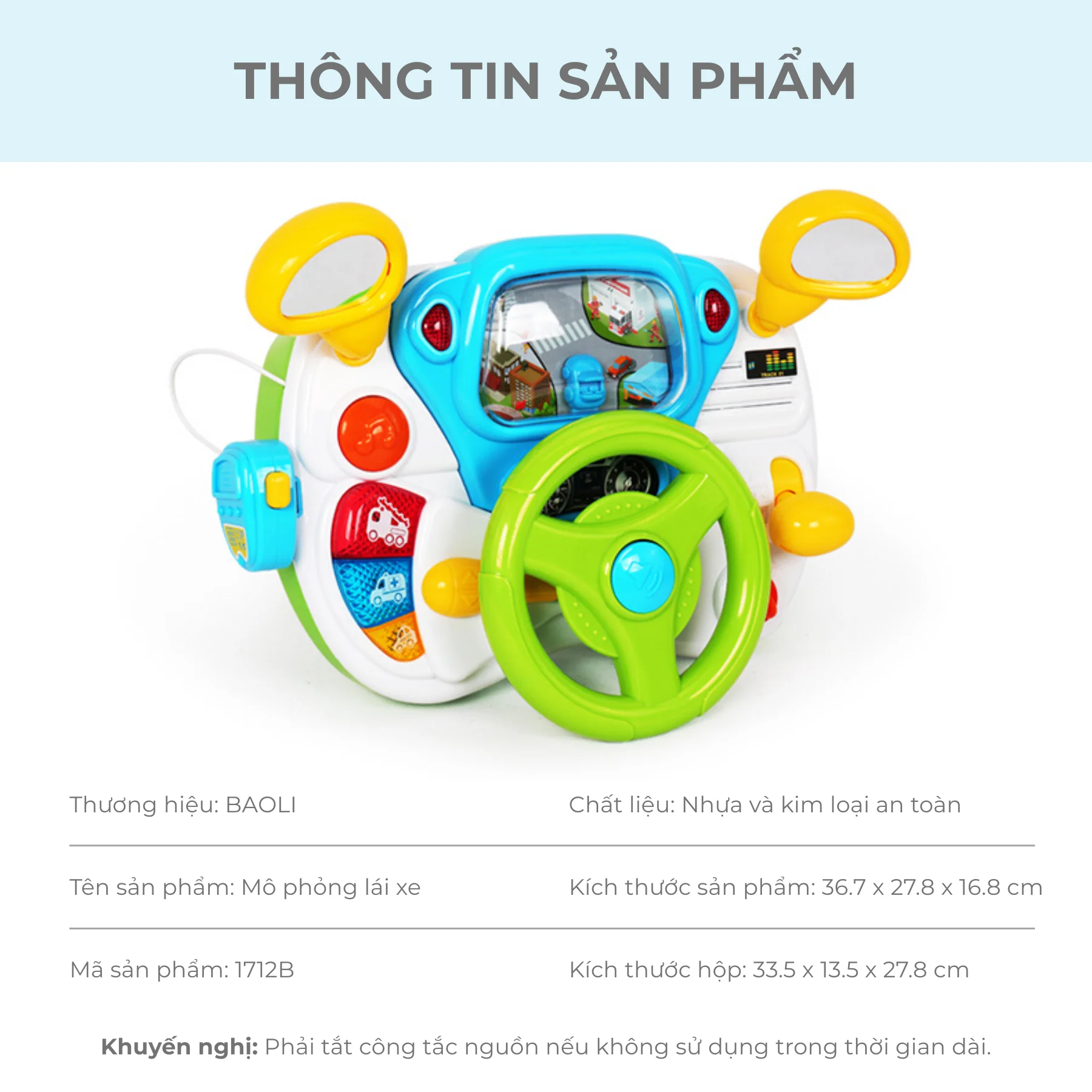 Đồ chơi mô phỏng lái xe BAOLI 1712B là món đồ chơi giáo dục sớm dành cho bé từ 12 tháng tuổi trở lên. Sản phẩm được thiết kế như một bảng điều khiển lái xe thu nhỏ với vô lăng, cần số, gương chiếu hậu và nhiều nút chức năng giúp bé trải nghiệm cảm giác lái xe thú vị.