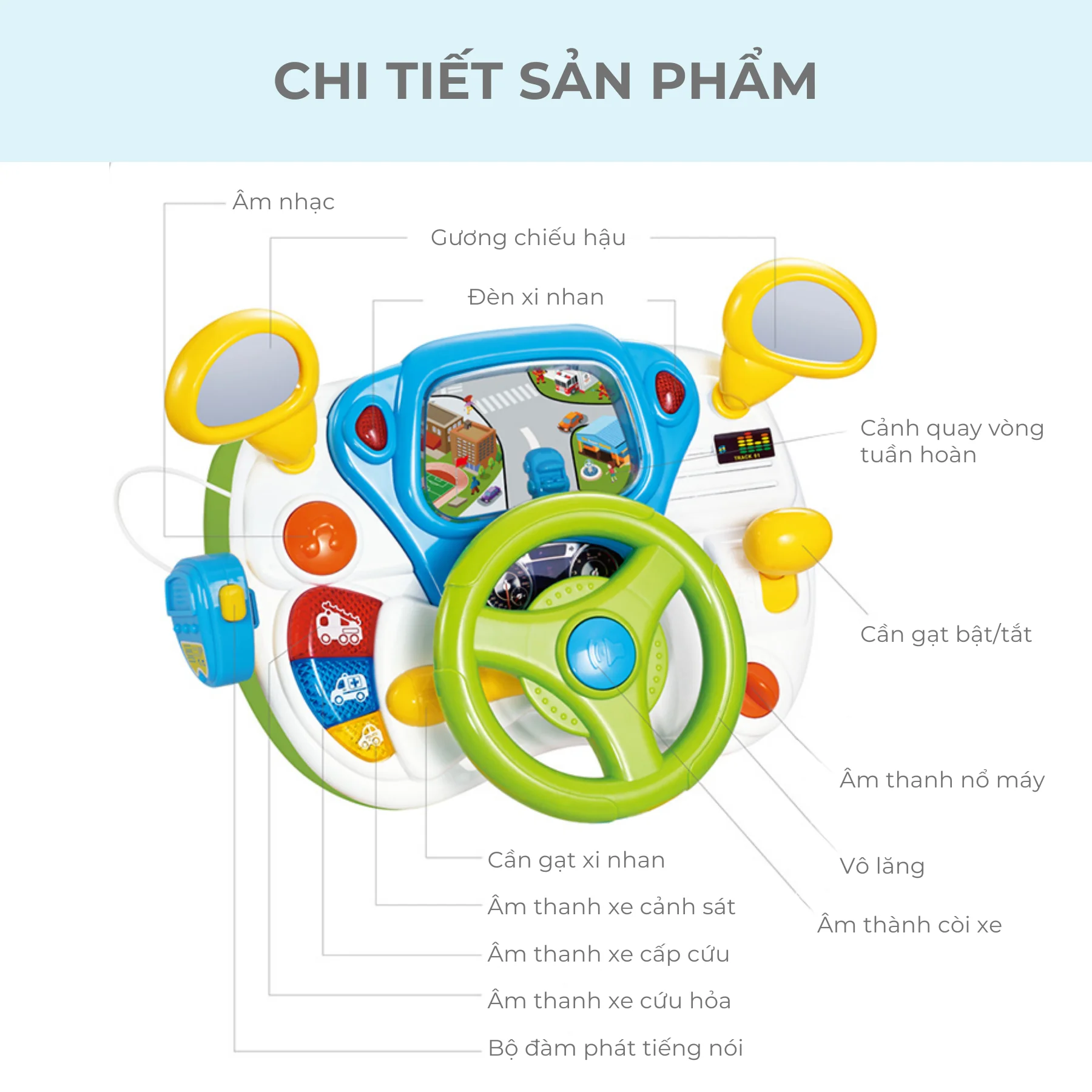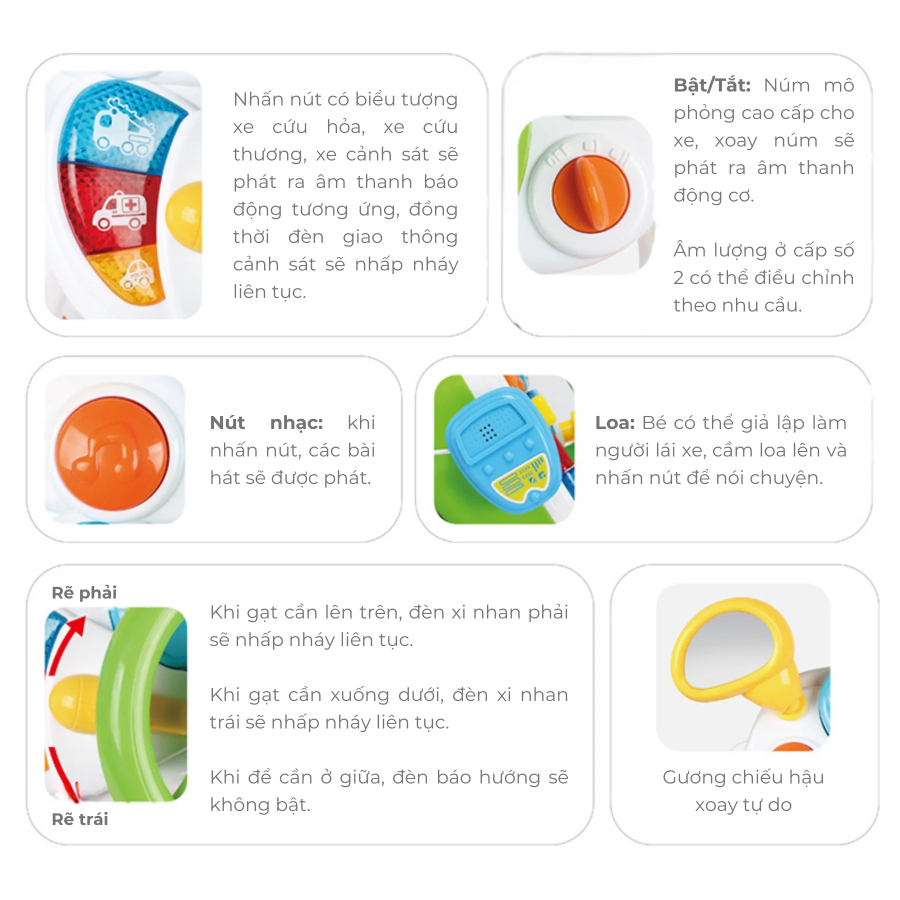 Bé có thể xoay vô lăng, gạt cần xi nhan, chuyển số hoặc nhấn các nút âm thanh để nghe tiếng còi xe, tiếng xe cảnh sát, xe cứu thương và xe cứu hỏa. Những hoạt động tương tác này giúp bé vừa vui chơi vừa khám phá thế giới giao thông xung quanh.