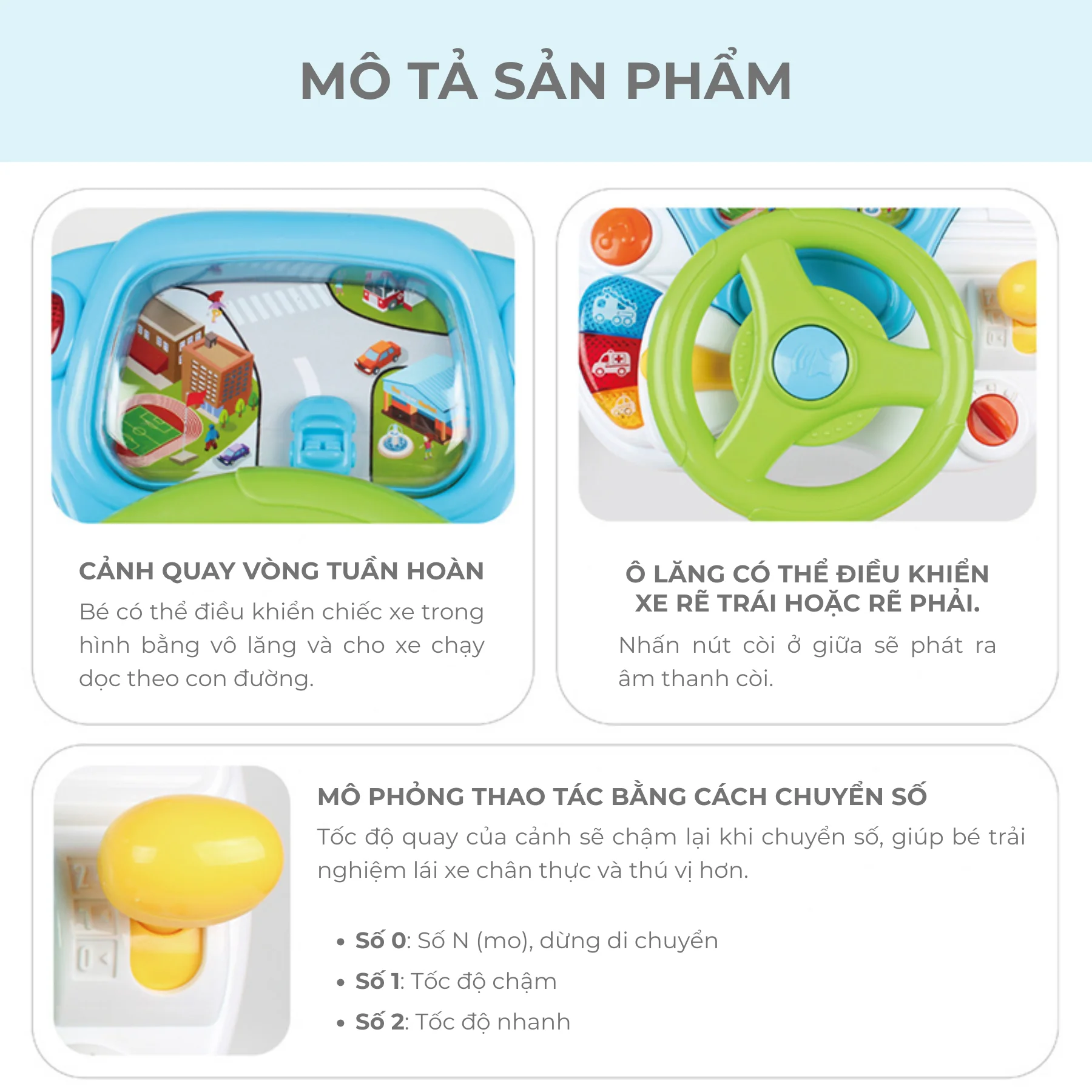 Sản phẩm được trang bị cần số mô phỏng giúp bé trải nghiệm việc điều khiển xe như người lớn. Khi chuyển số, tốc độ quay của cảnh trên màn hình sẽ thay đổi tạo cảm giác di chuyển nhanh hoặc chậm.