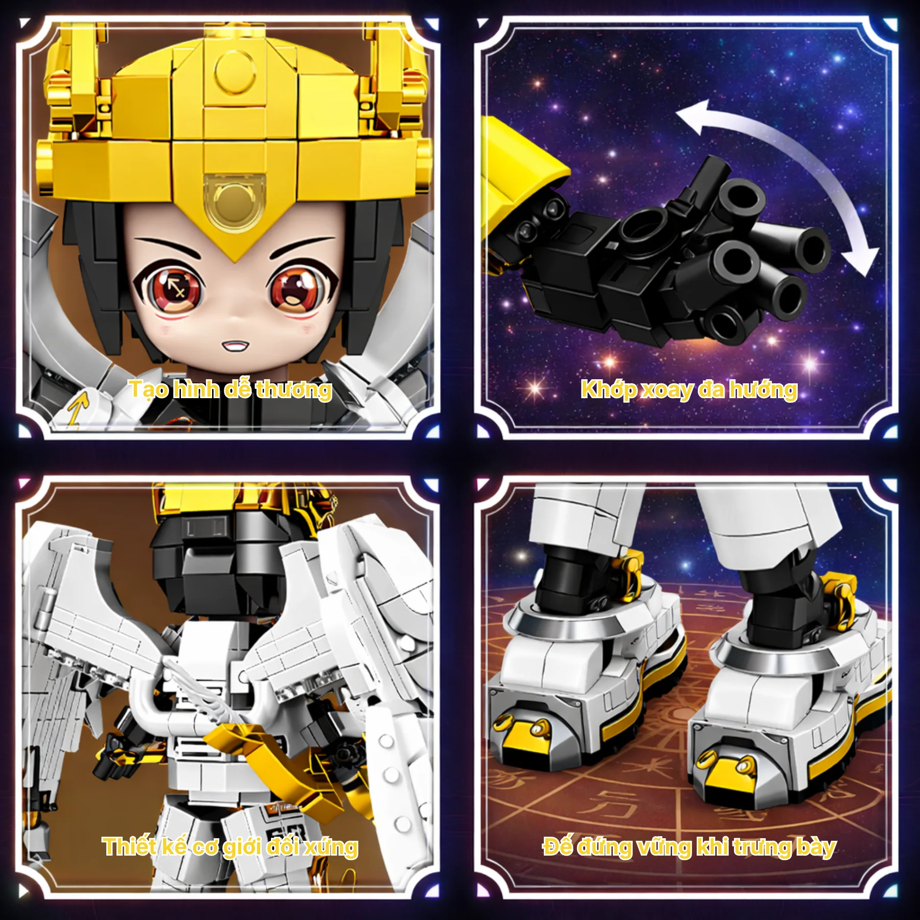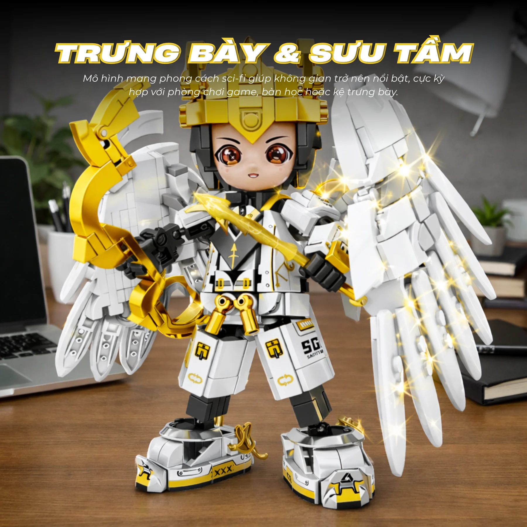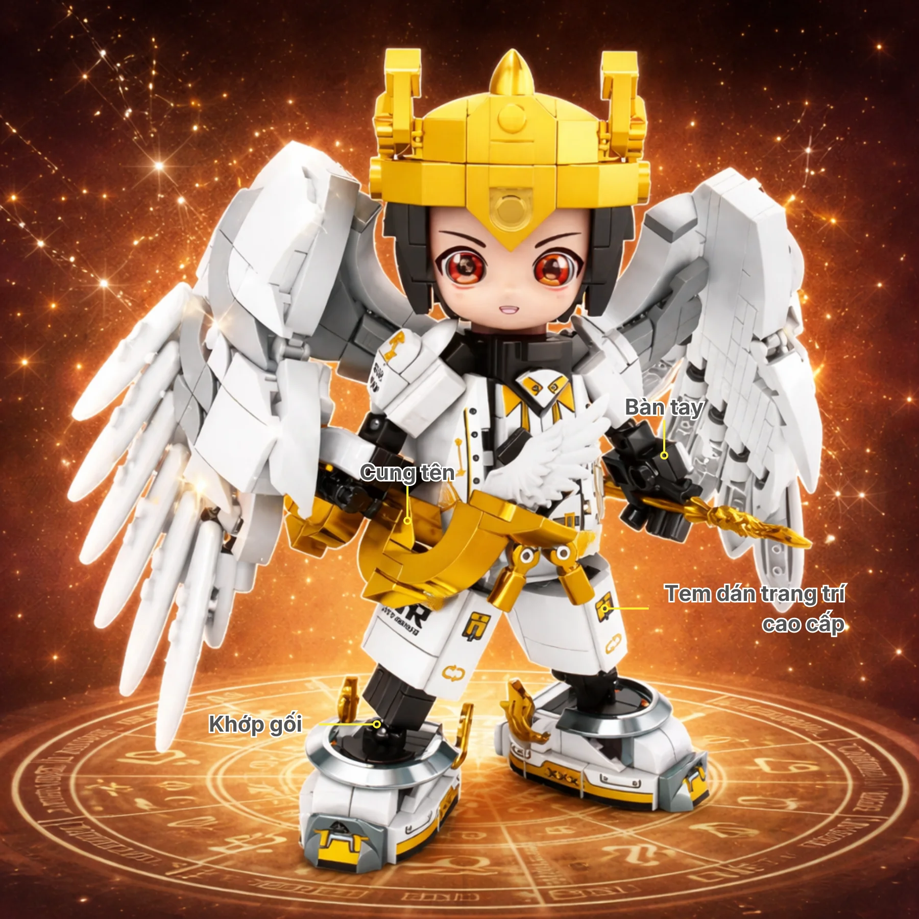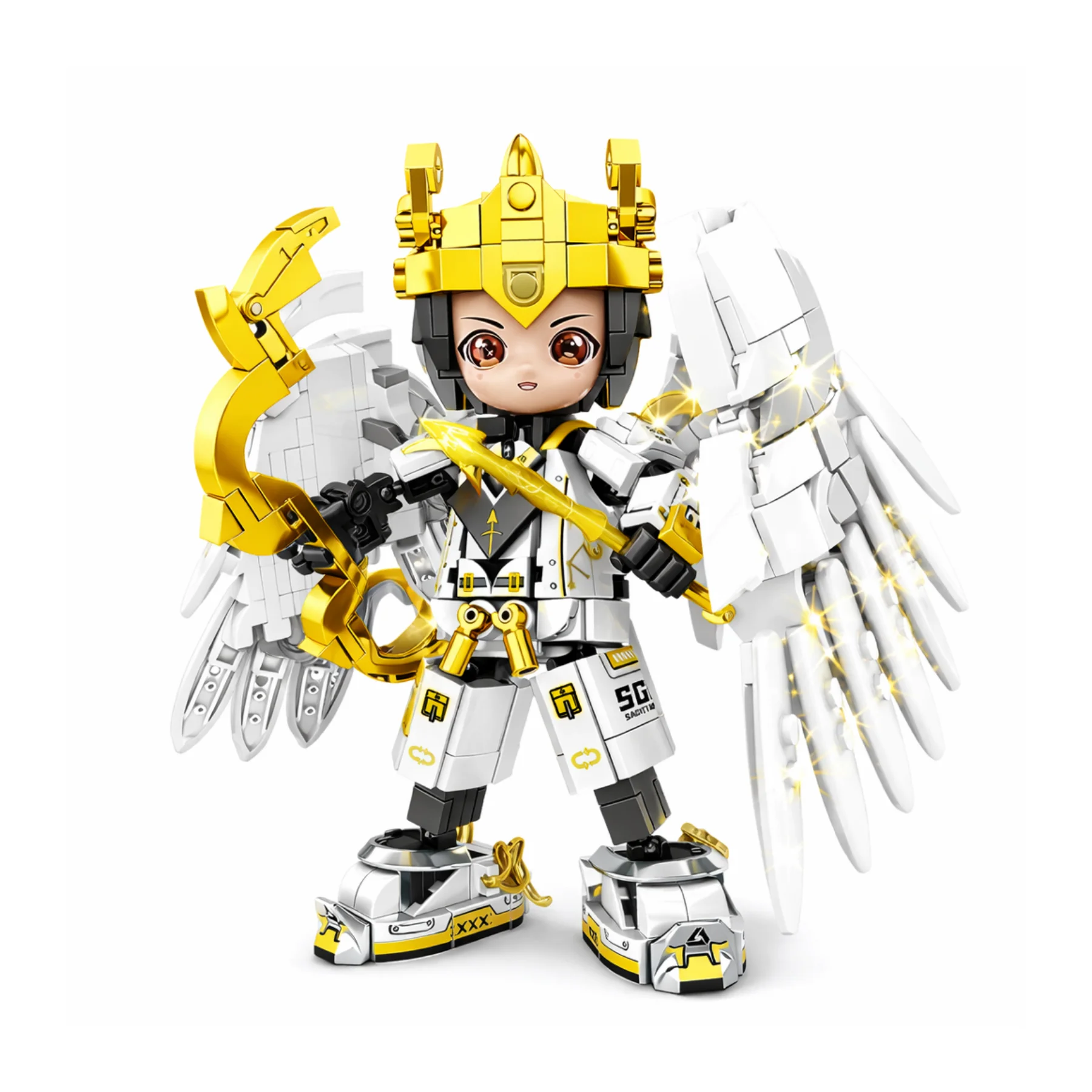 Thiết kế nổi bật với tông trắng – vàng sang trọng, đôi cánh lớn phía sau cùng cung năng lượng đặc trưng của Nhân Mã. Bộ giáp chi tiết cùng mũ chiến binh mang phong cách thần thoại kết hợp công nghệ hiện đại. Các khớp tay chân linh hoạt cho phép tạo nhiều tư thế bắn cung khác nhau sau khi hoàn thiện, sticker trang trí giúp mô hình sinh động hơn.
