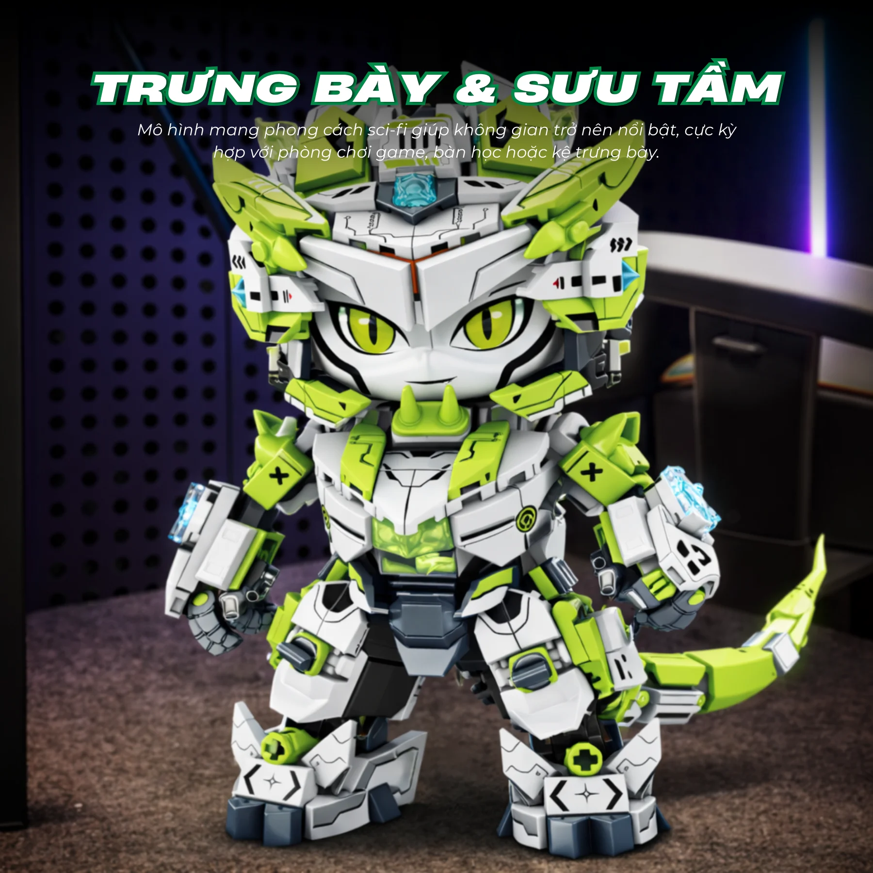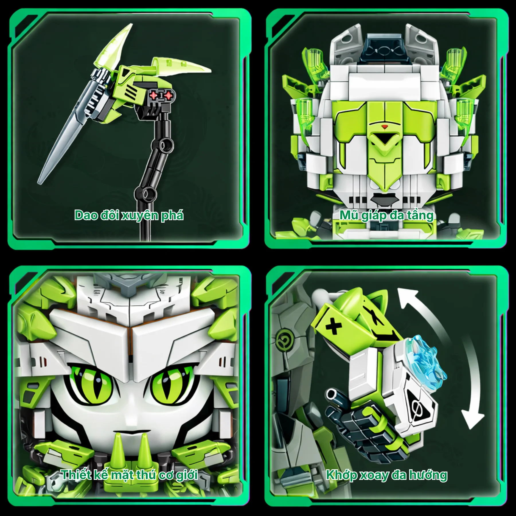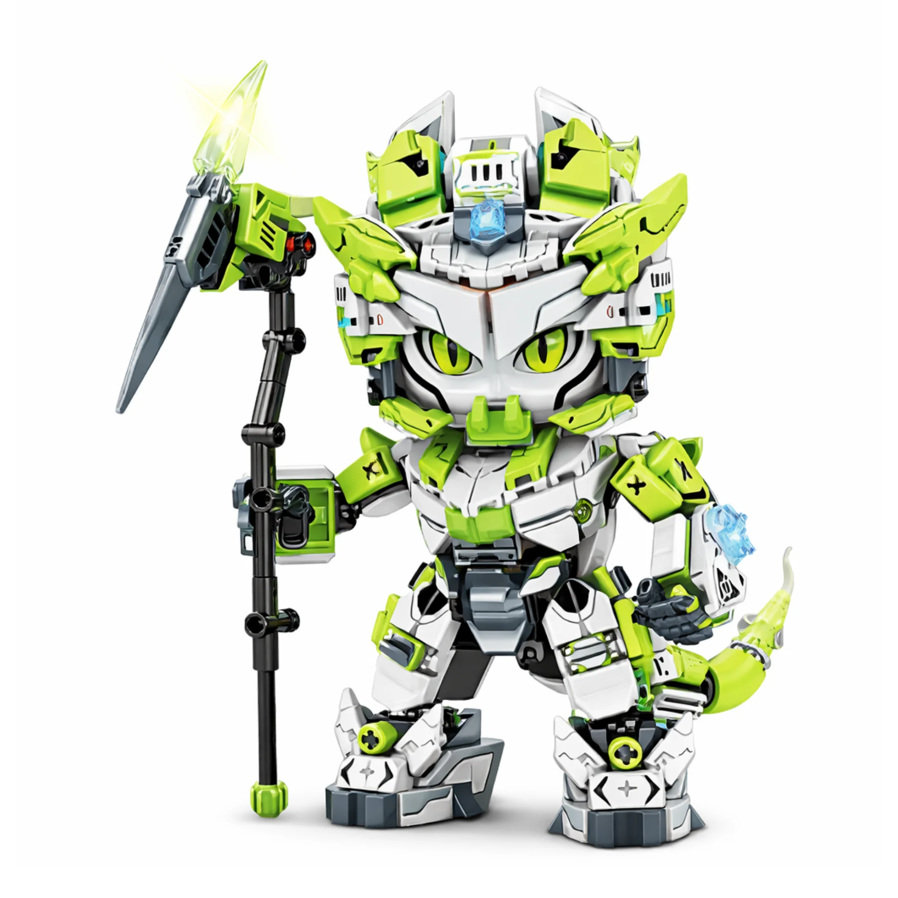 Thiết kế nổi bật với tông màu xanh trắng công nghệ, phần sừng và đuôi năng lượng trong suốt tạo hiệu ứng ánh sáng bắt mắt. Vũ khí thương dài có thể tháo rời, các khớp tay chân linh hoạt giúp bé tạo nhiều tư thế khác nhau sau khi hoàn thành. Các chi tiết giáp và sticker trang trí giúp mô hình sống động hơn, phù hợp làm quà tặng cho bé yêu thích lắp ráp và sưu tầm.