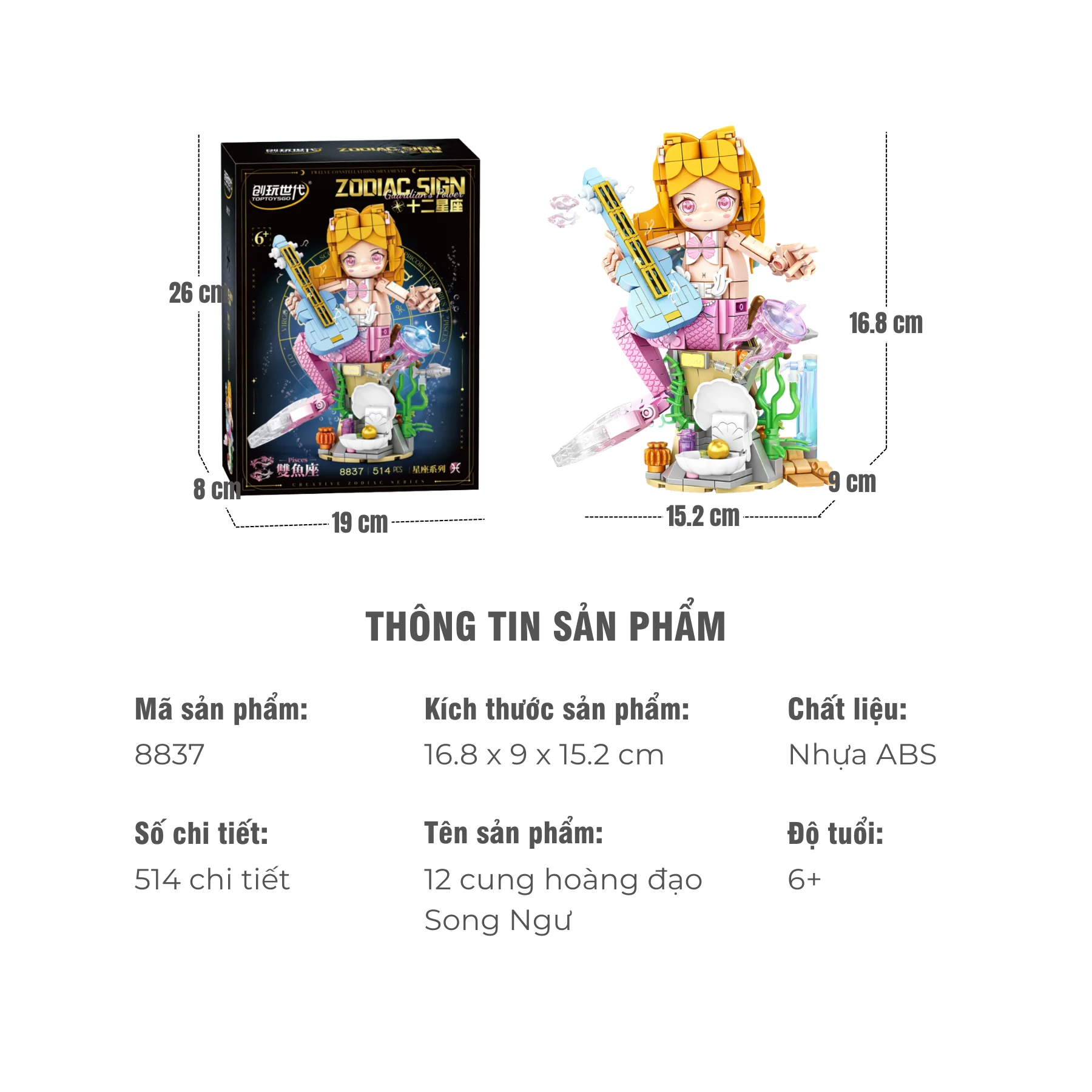 Đồ chơi lắp ráp Song Ngư cơ giáp Zodiac NO.8837 phù hợp cho bé từ 6 tuổi trở lên. Nhân vật lấy cảm hứng từ cung Song Ngư – biểu tượng của trí tưởng tượng và cảm xúc – kết hợp phong cách nàng tiên cá đại dương tạo nên mô hình mềm mại, đáng yêu và giàu tính nghệ thuật, thích hợp vừa chơi nhập vai vừa trưng bày.