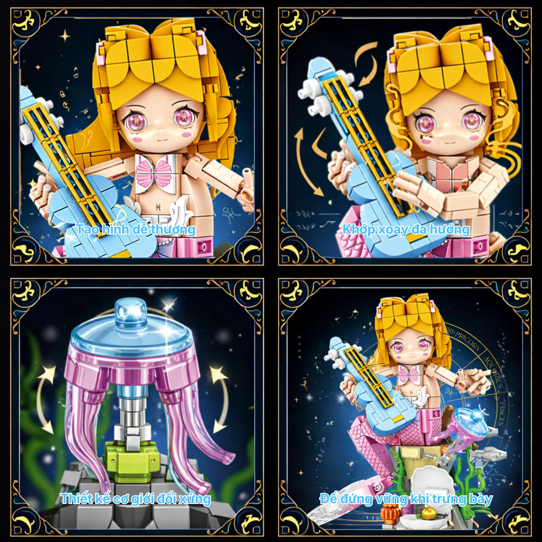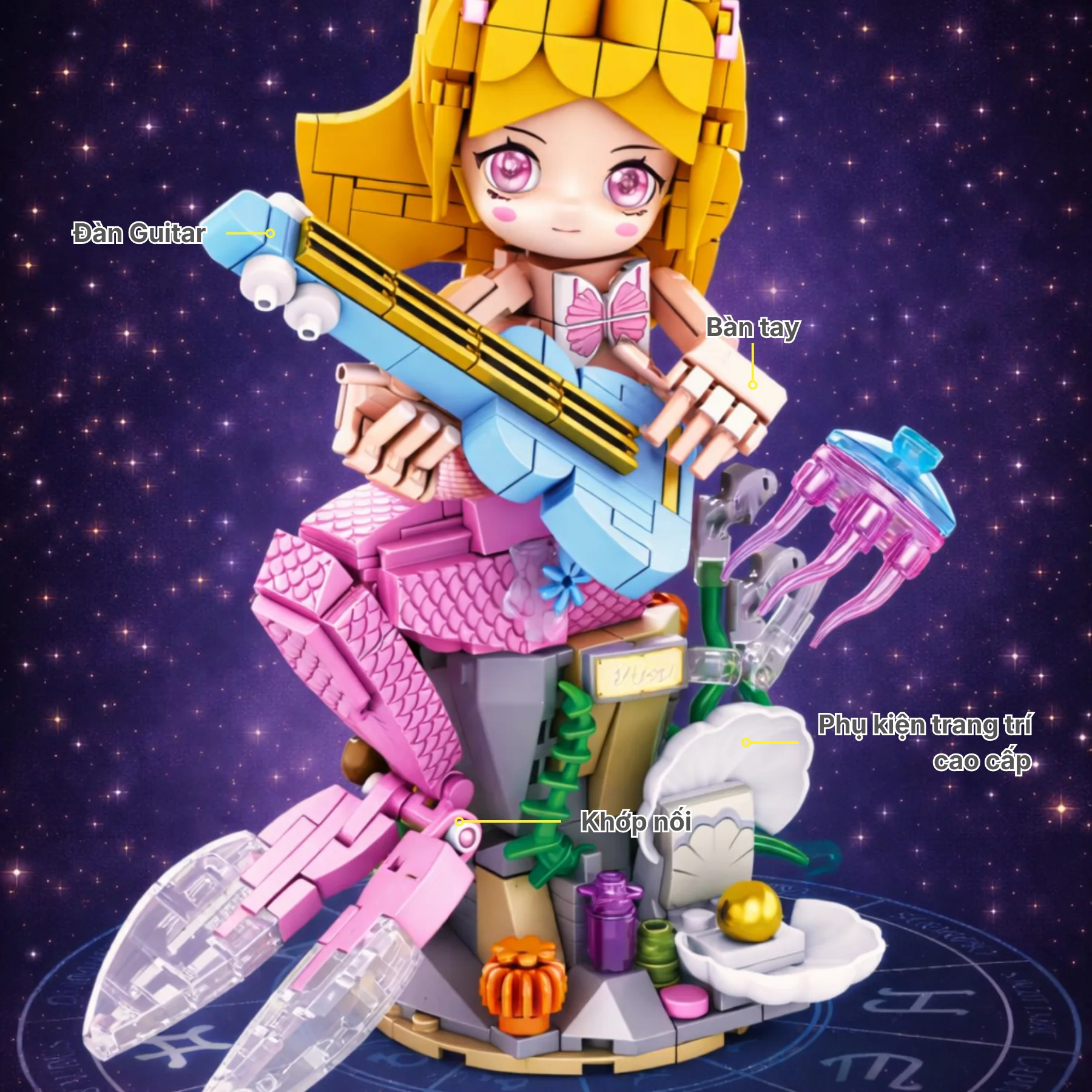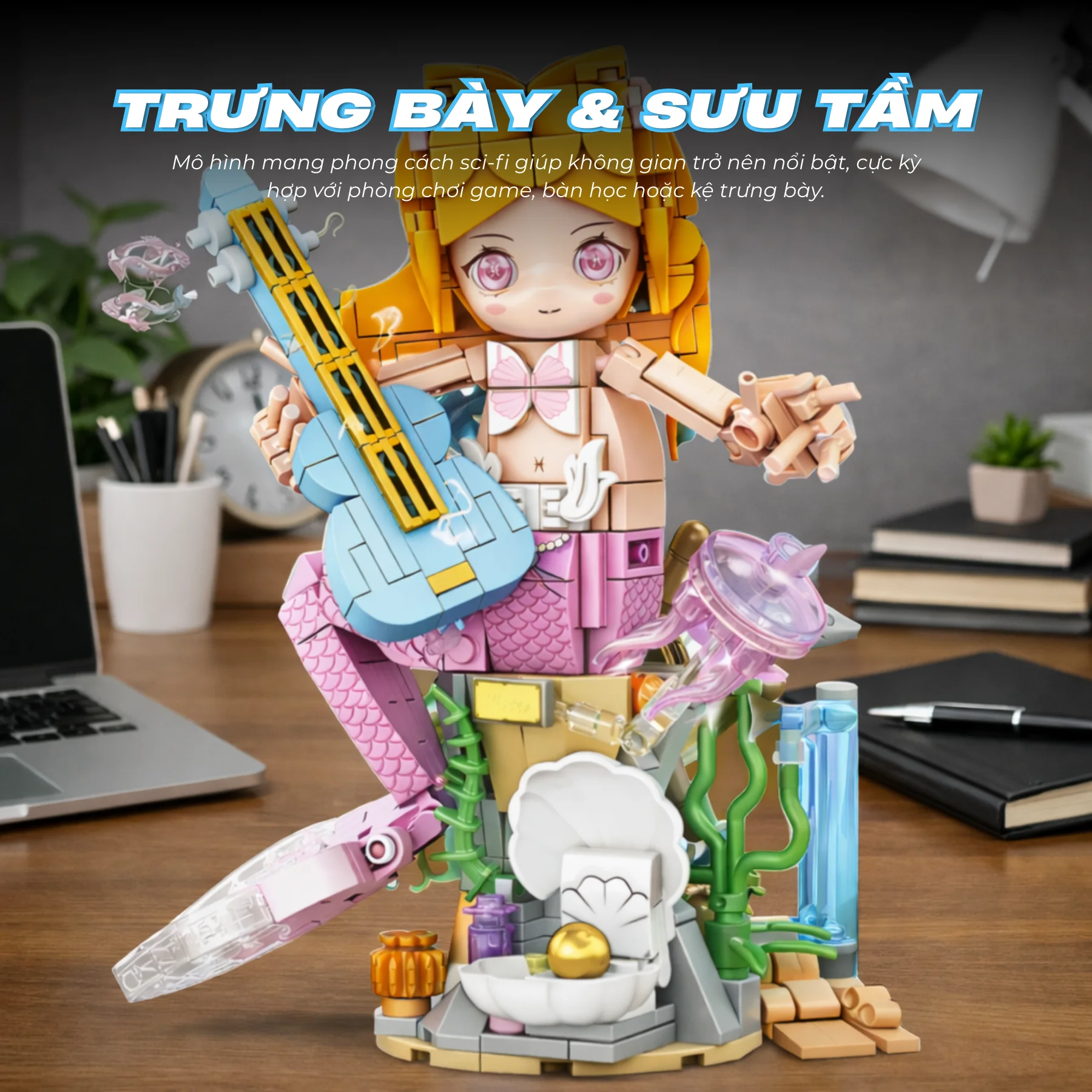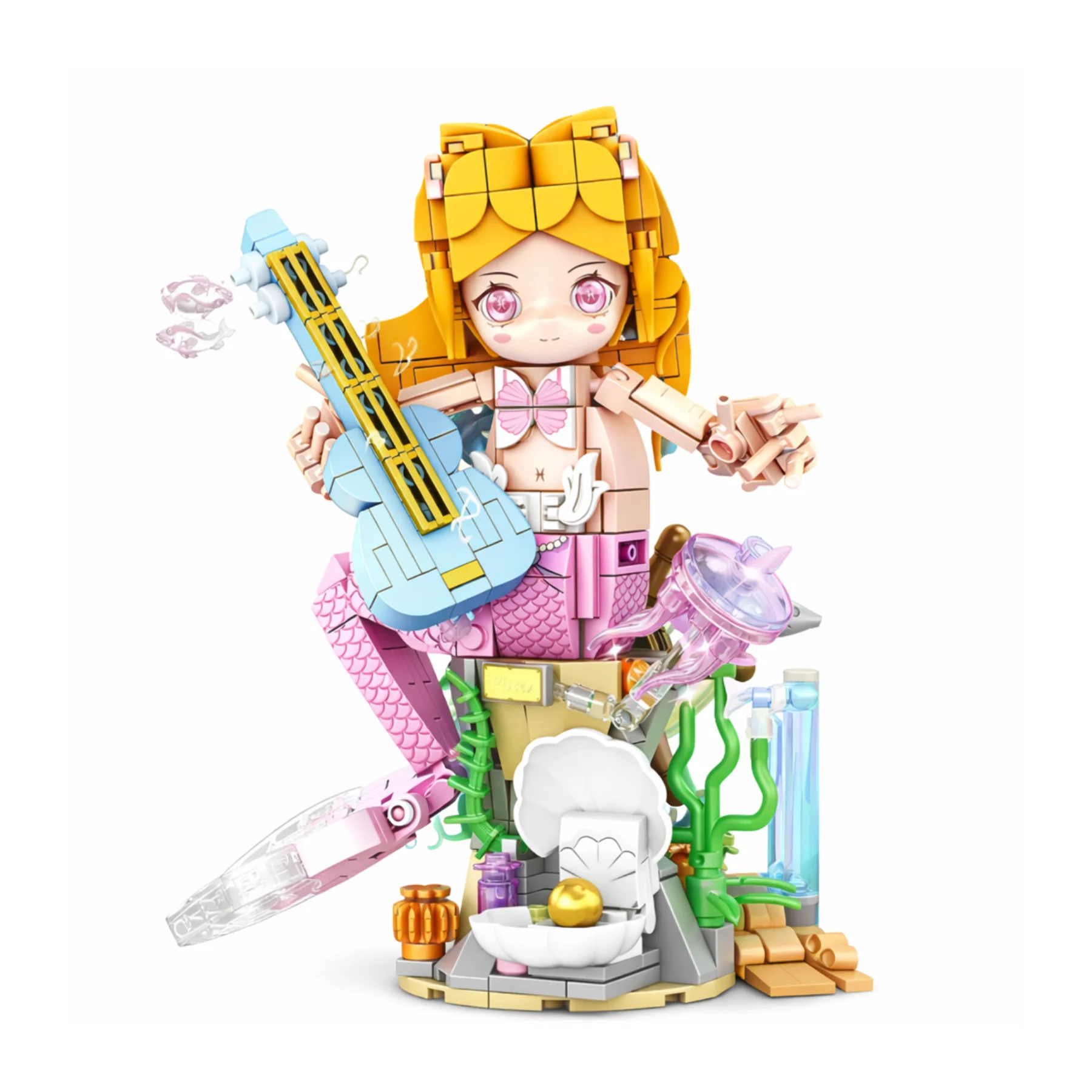 Thiết kế nổi bật với phần đuôi cá hồng, đàn mini cùng bệ san hô biển và vỏ sò ngọc trai. Hiệu ứng nước trong suốt, sứa phát sáng và phụ kiện đại dương giúp mô hình sinh động hơn. Các khớp linh hoạt cho phép tạo nhiều tư thế biểu diễn khác nhau sau khi hoàn thiện, tăng tính sáng tạo khi chơi.