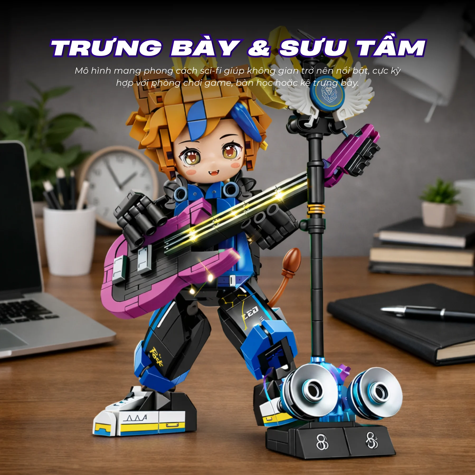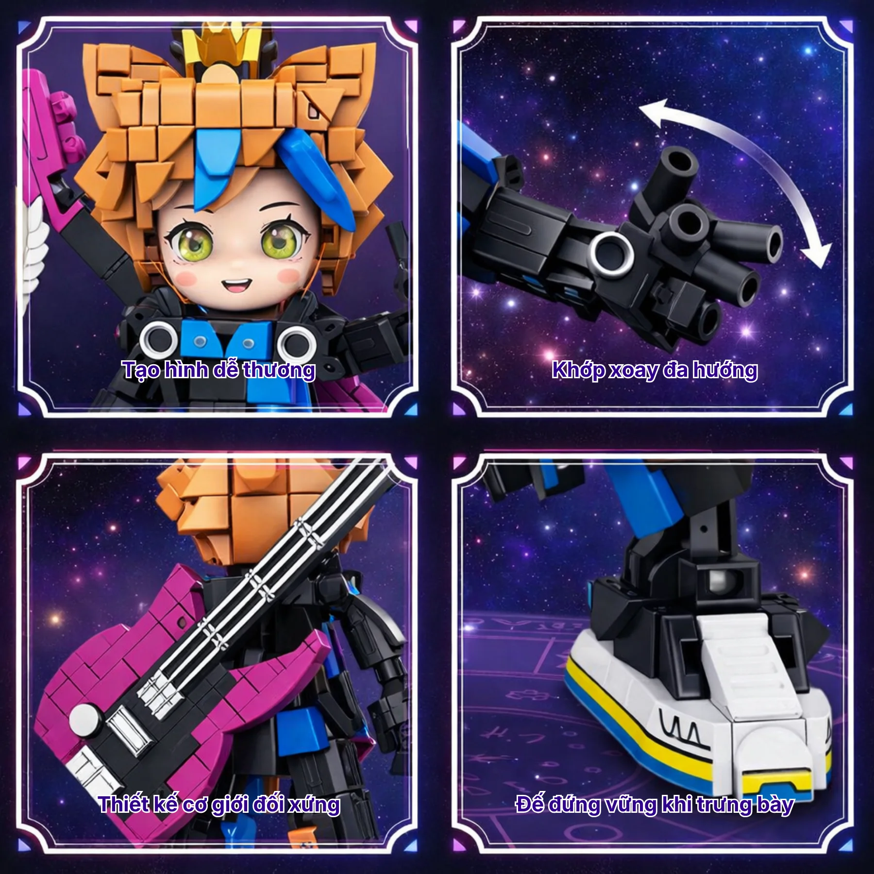 Mô hình đi kèm đàn guitar điện và trượng năng lượng gắn loa đôi độc đáo, thể hiện hình tượng chiến binh âm nhạc đầy sáng tạo. Các khớp tay chân linh hoạt cho phép tạo nhiều tư thế biểu diễn, chi tiết in và sticker sắc nét giúp mô hình sinh động và tăng giá trị sưu tầm, phù hợp làm quà tặng cho bé yêu thích lắp ráp và chủ đề hoàng đạo.