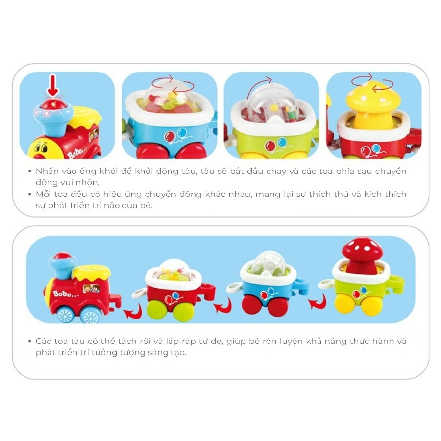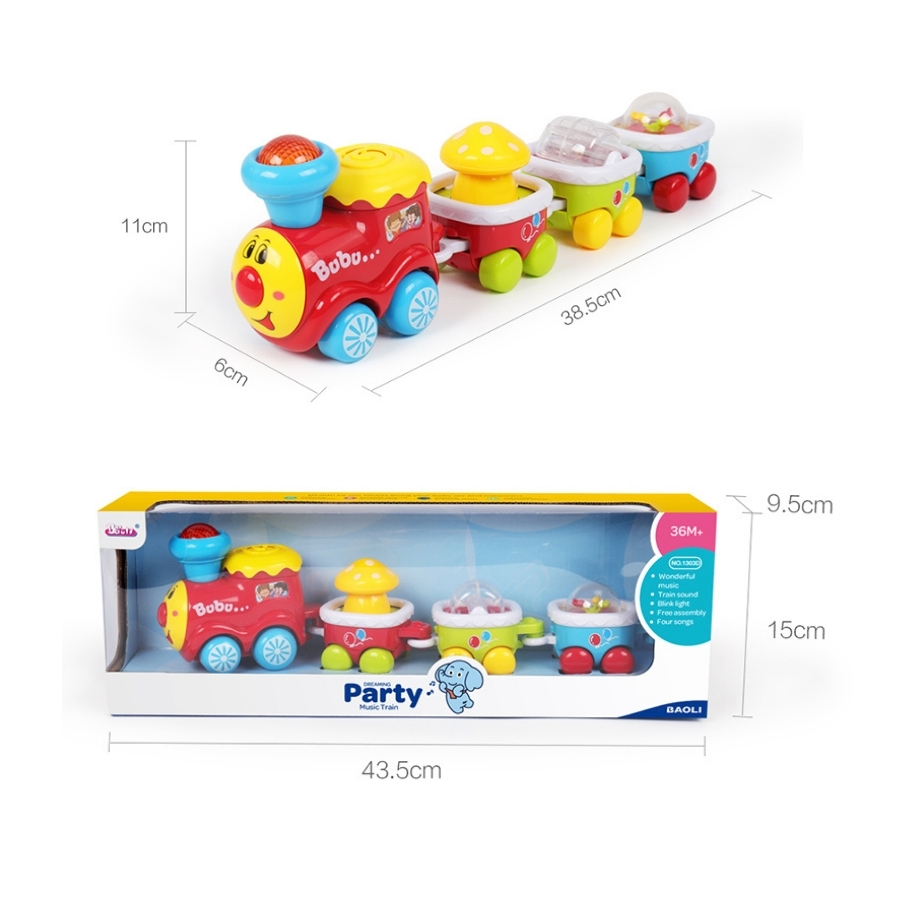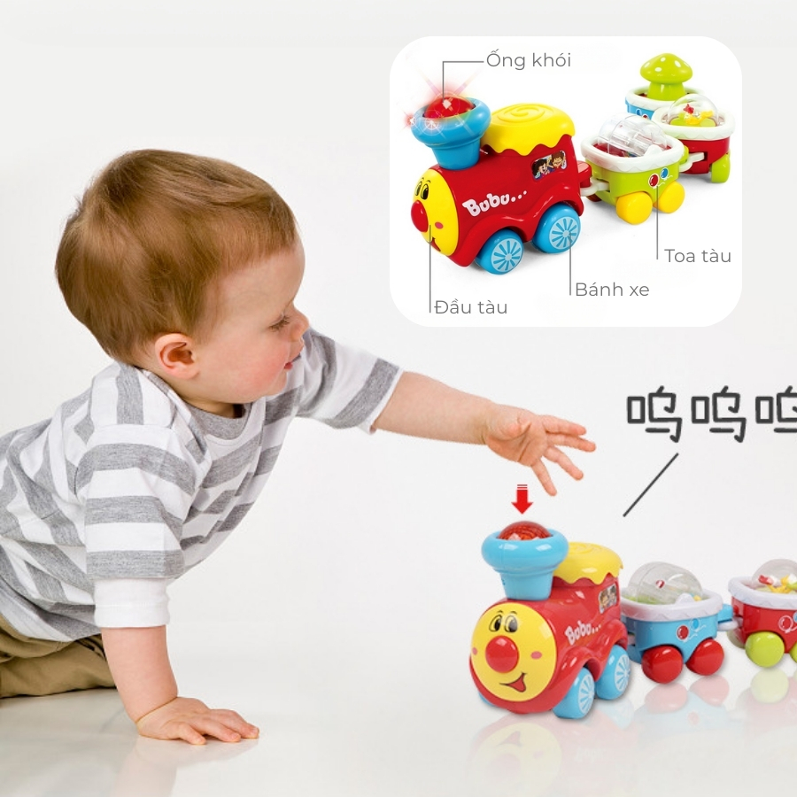 Tàu hỏa âm nhạc đáng yêu với thiết kế sinh động, phát nhạc vui nhộn và ánh sáng bắt mắt, giúp bé phát triển kỹ năng vận động tinh và cảm nhận âm nhạc.