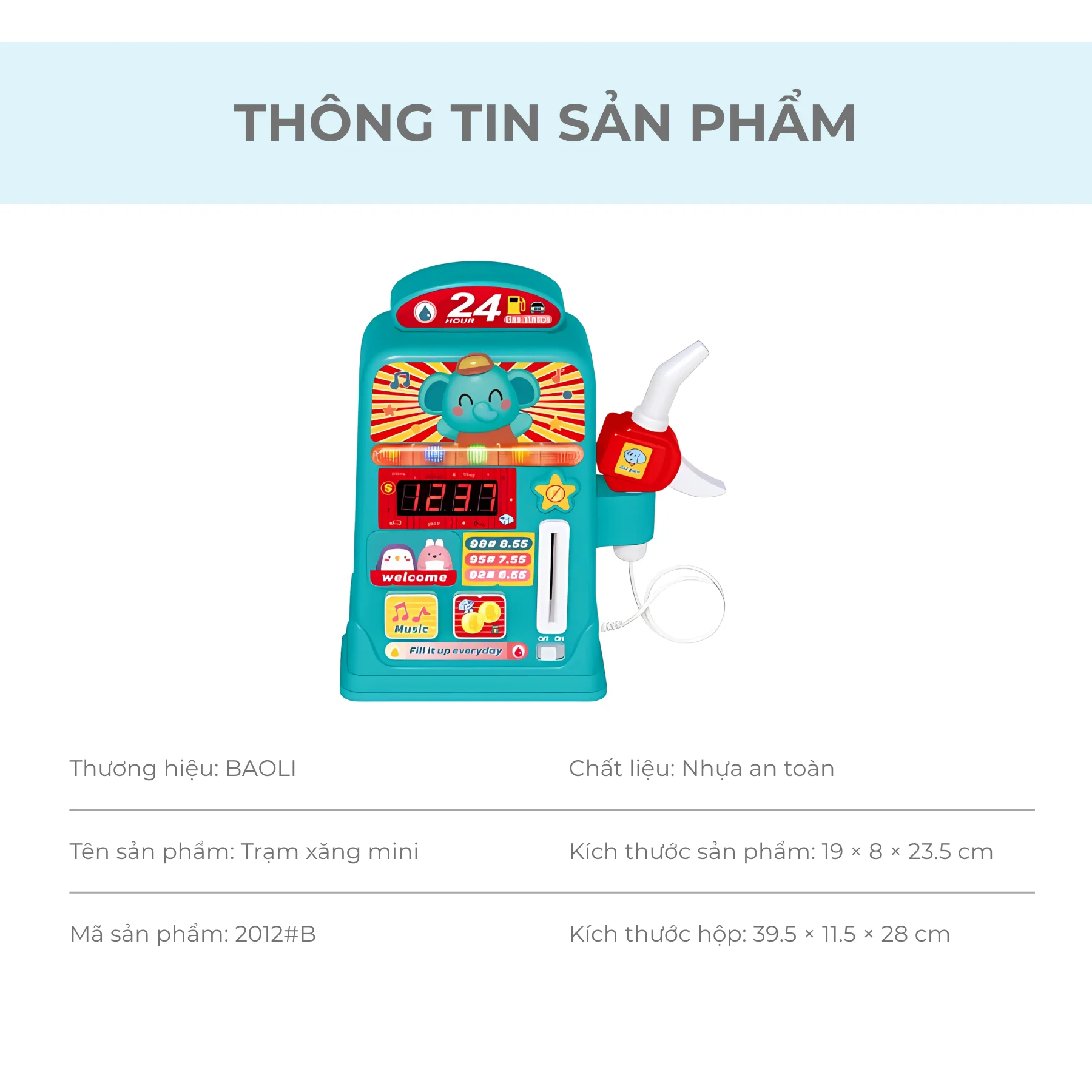 Trạm xăng đồ chơi BAOLI màu xanh dương 2012#B sẽ giúp bé hóa thân thành “nhân viên cây xăng nhí” dễ thương, học cách đổ xăng, tính tiền, thanh toán và lái xe như thật. Thiết kế sinh động, có nhạc và đèn LED, giúp bé vừa chơi vừa học, phát triển tư duy logic và kỹ năng giao tiếp xã hội.