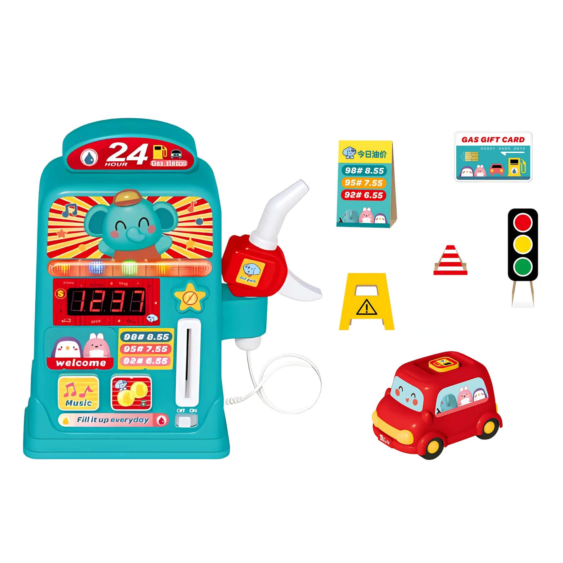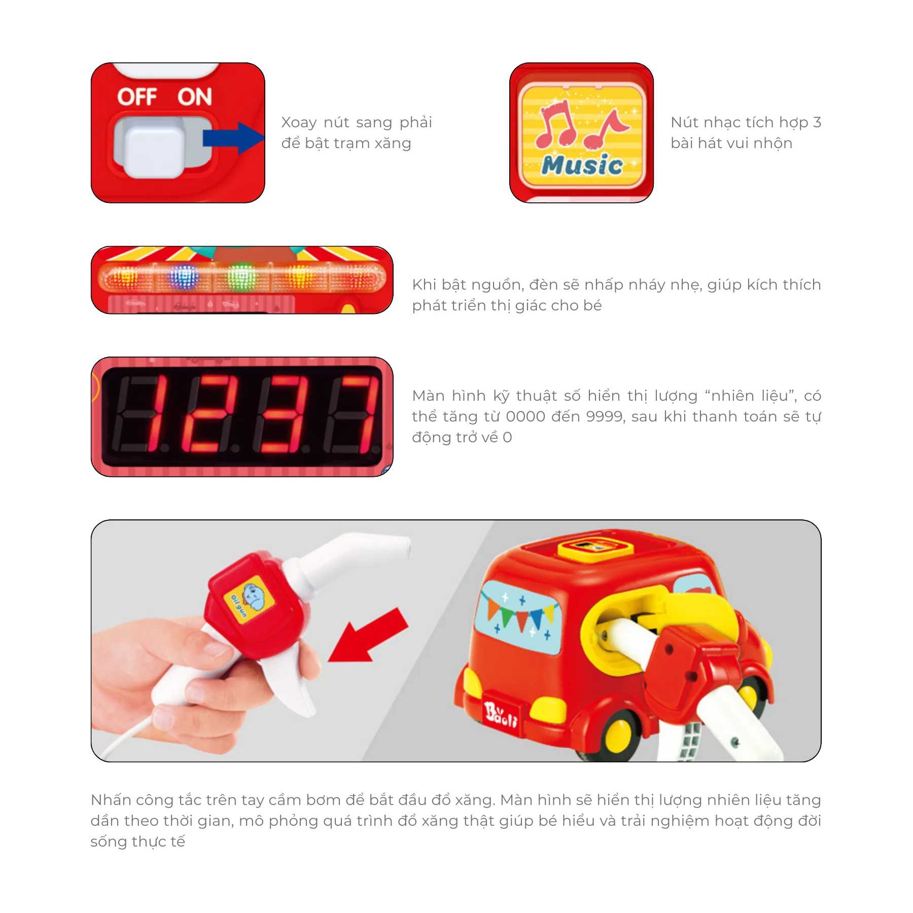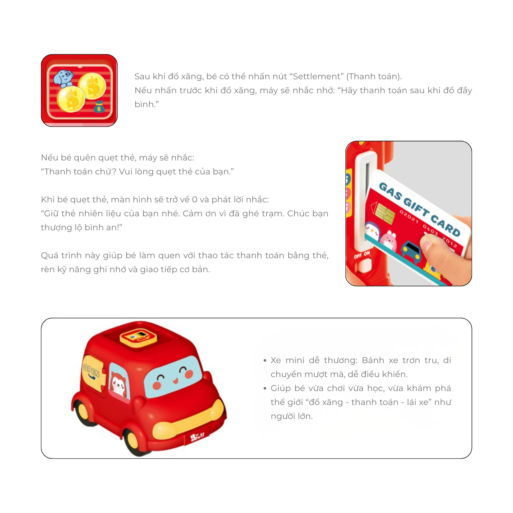 - Thiết kế mô phỏng cây xăng 24h, trang bị súng bơm xăng, màn hình hiển thị, âm thanh vui nhộn và ô tô mini.
