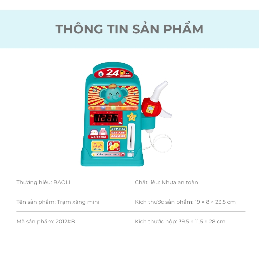- Thiết kế mô phỏng cây xăng 24h, trang bị súng bơm xăng, màn hình hiển thị, âm thanh vui nhộn và ô tô mini.